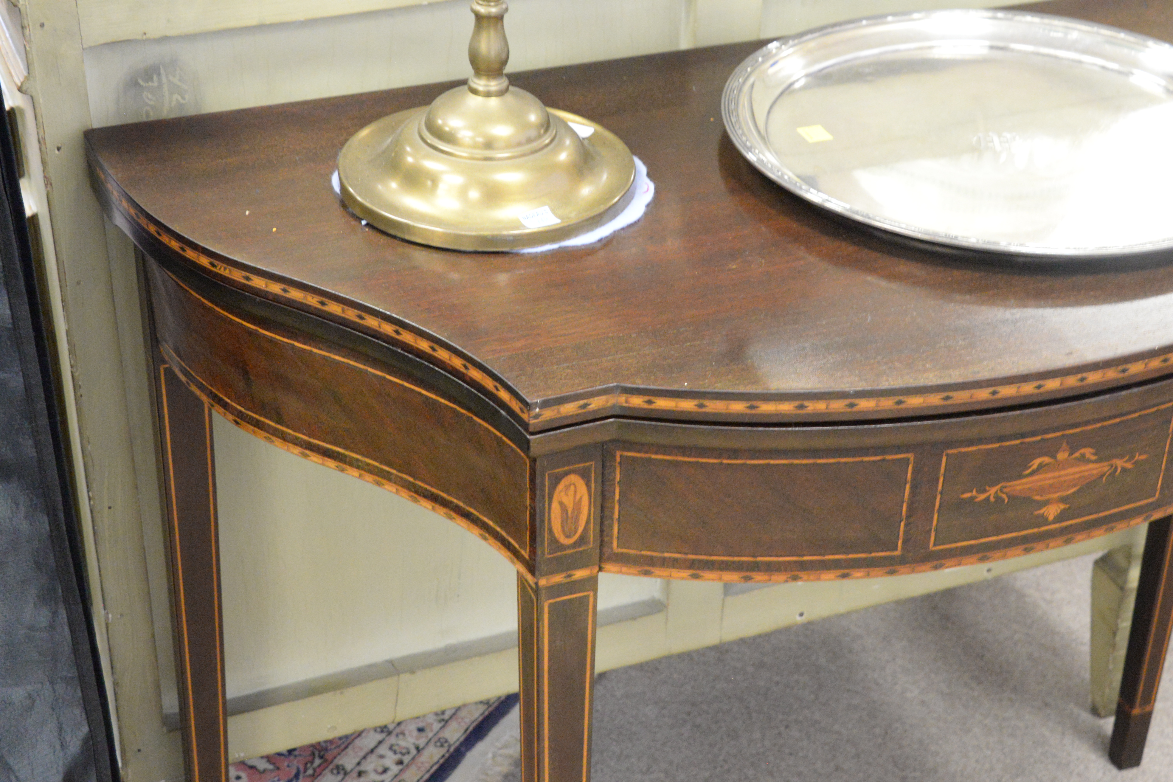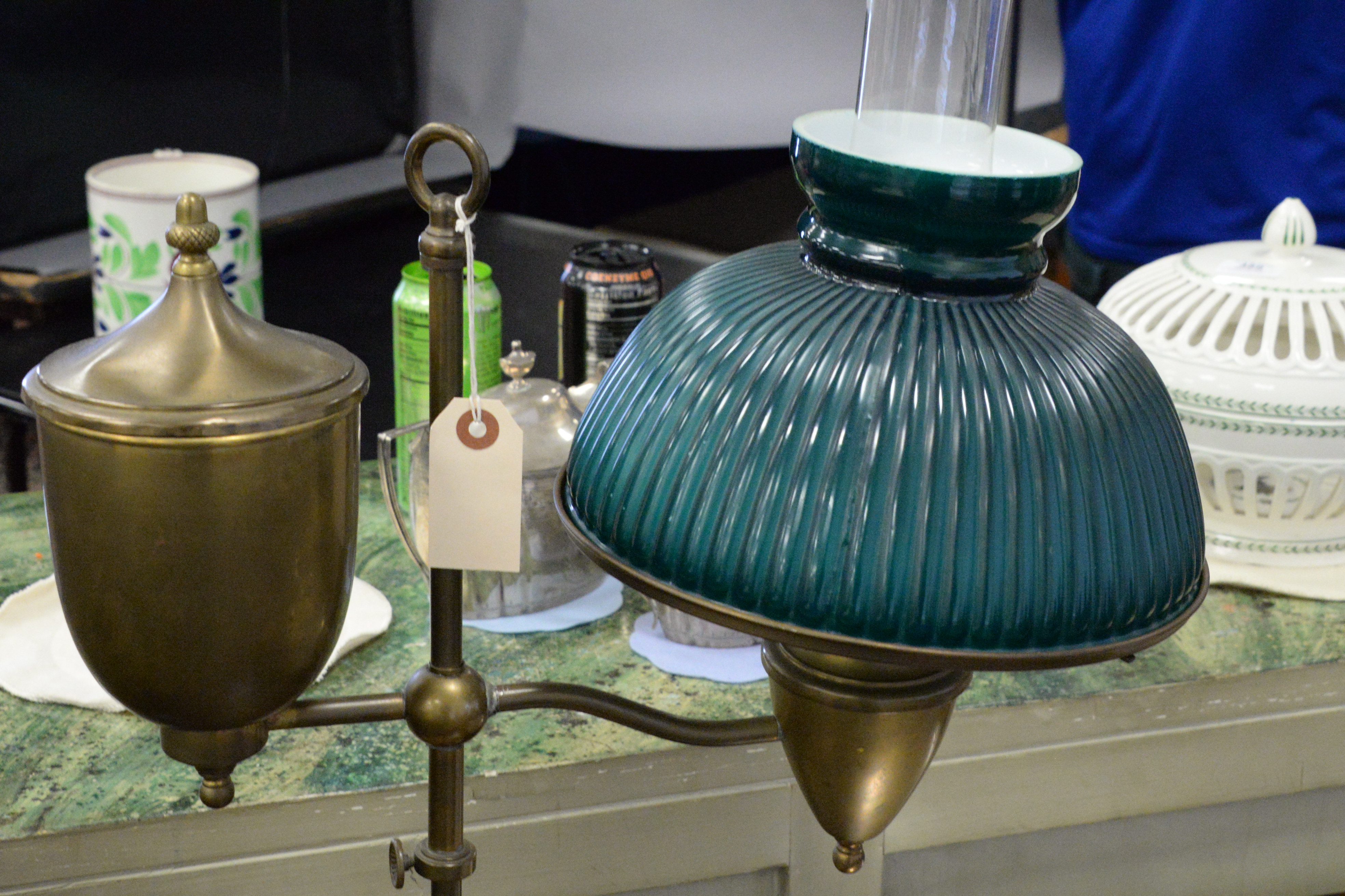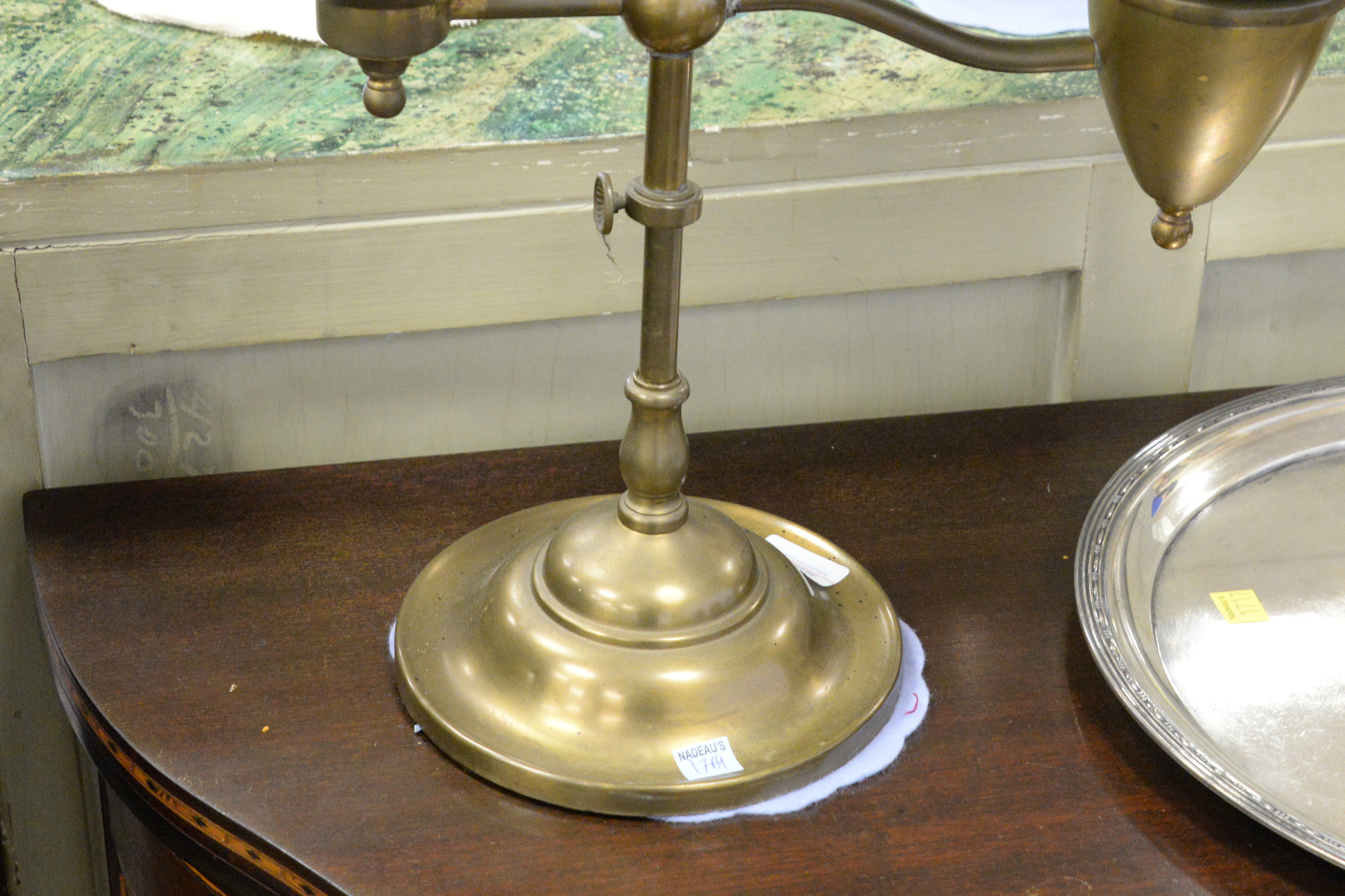 Two Piece Lot Federal Style Mahogany Inlaid Games Table, along with brass Bradley & Hubbard student lamp, table height 30 1/2 inches, table length 36 inches, lamp height 27 1/2 inches