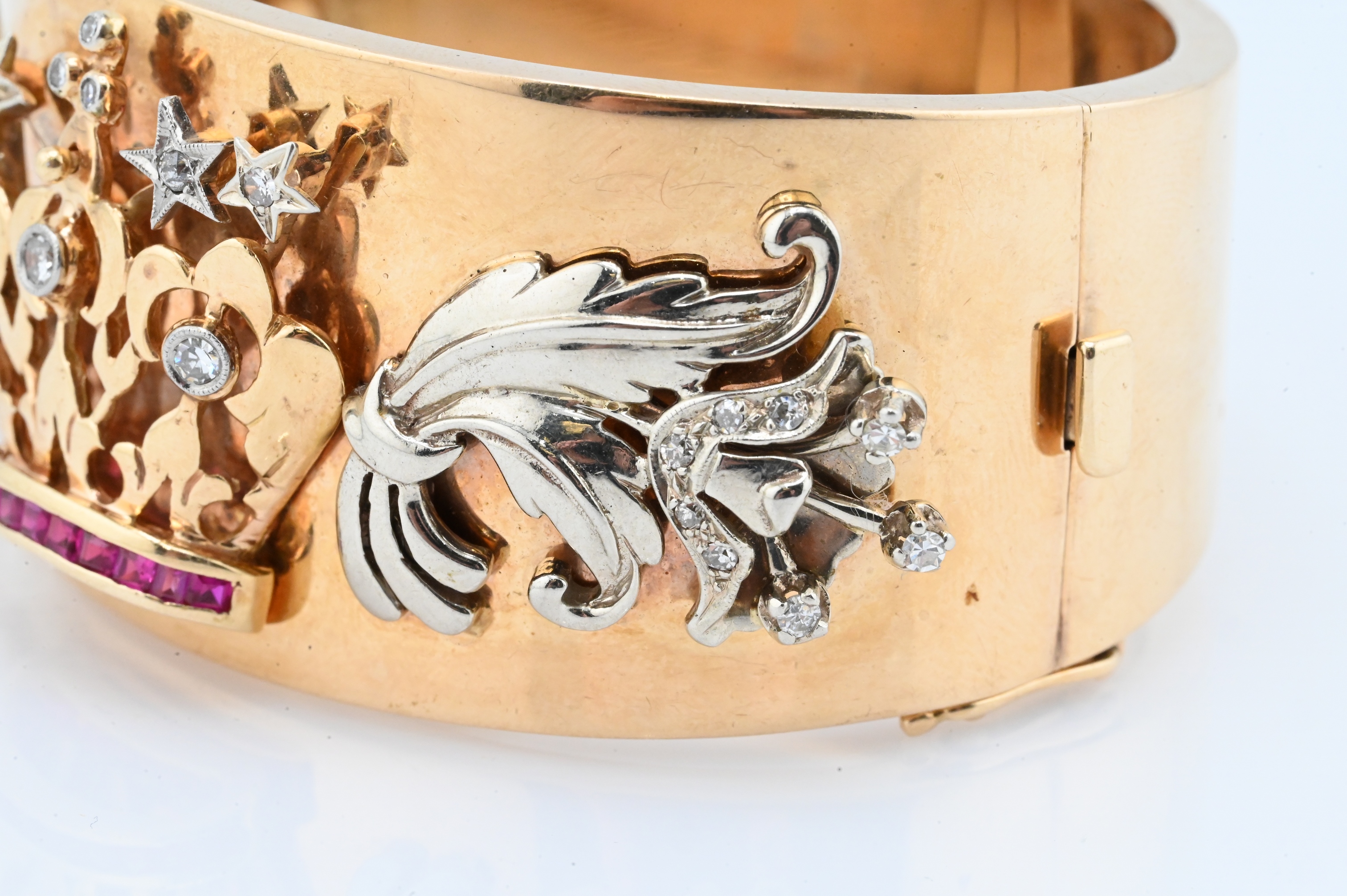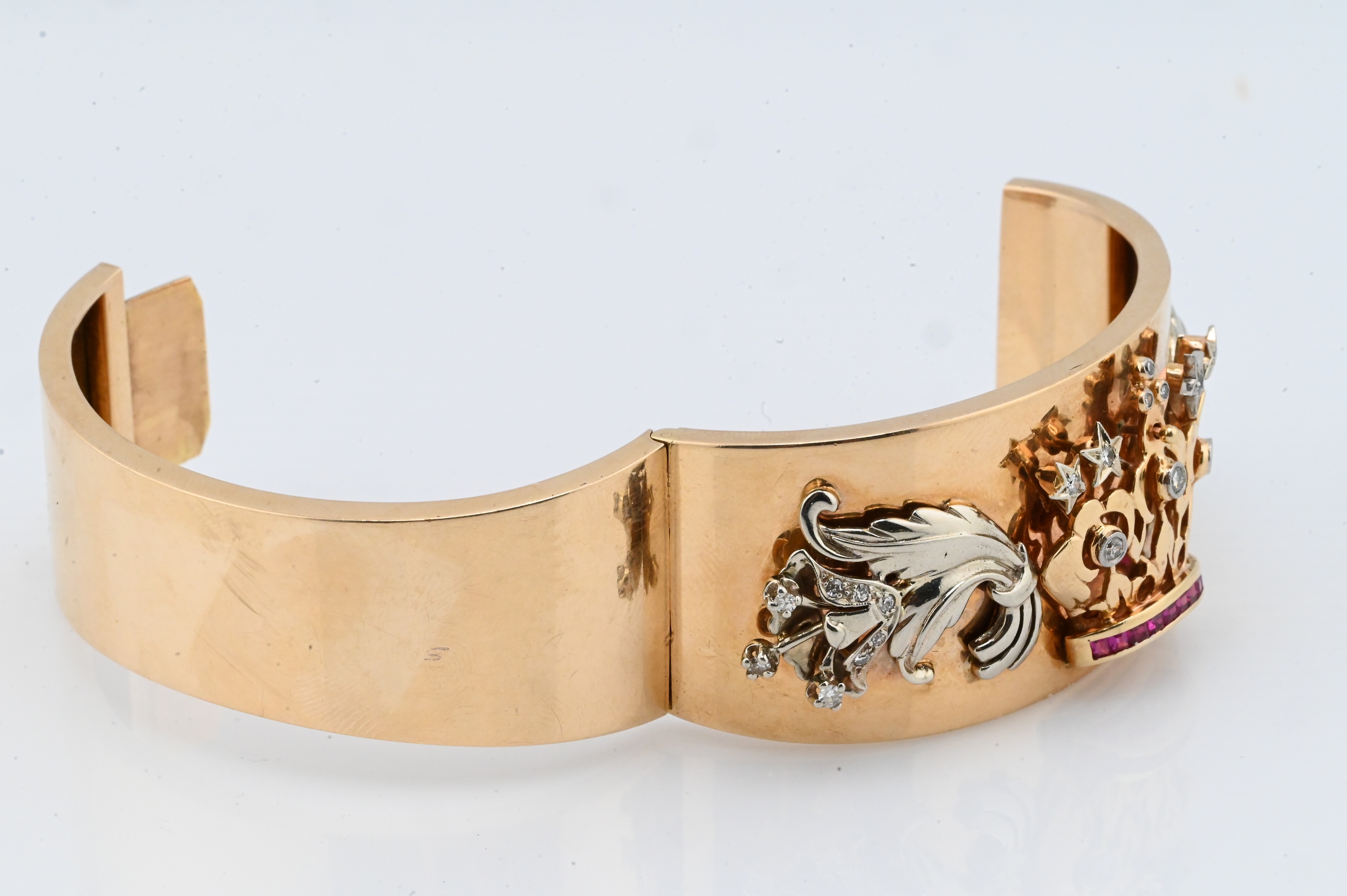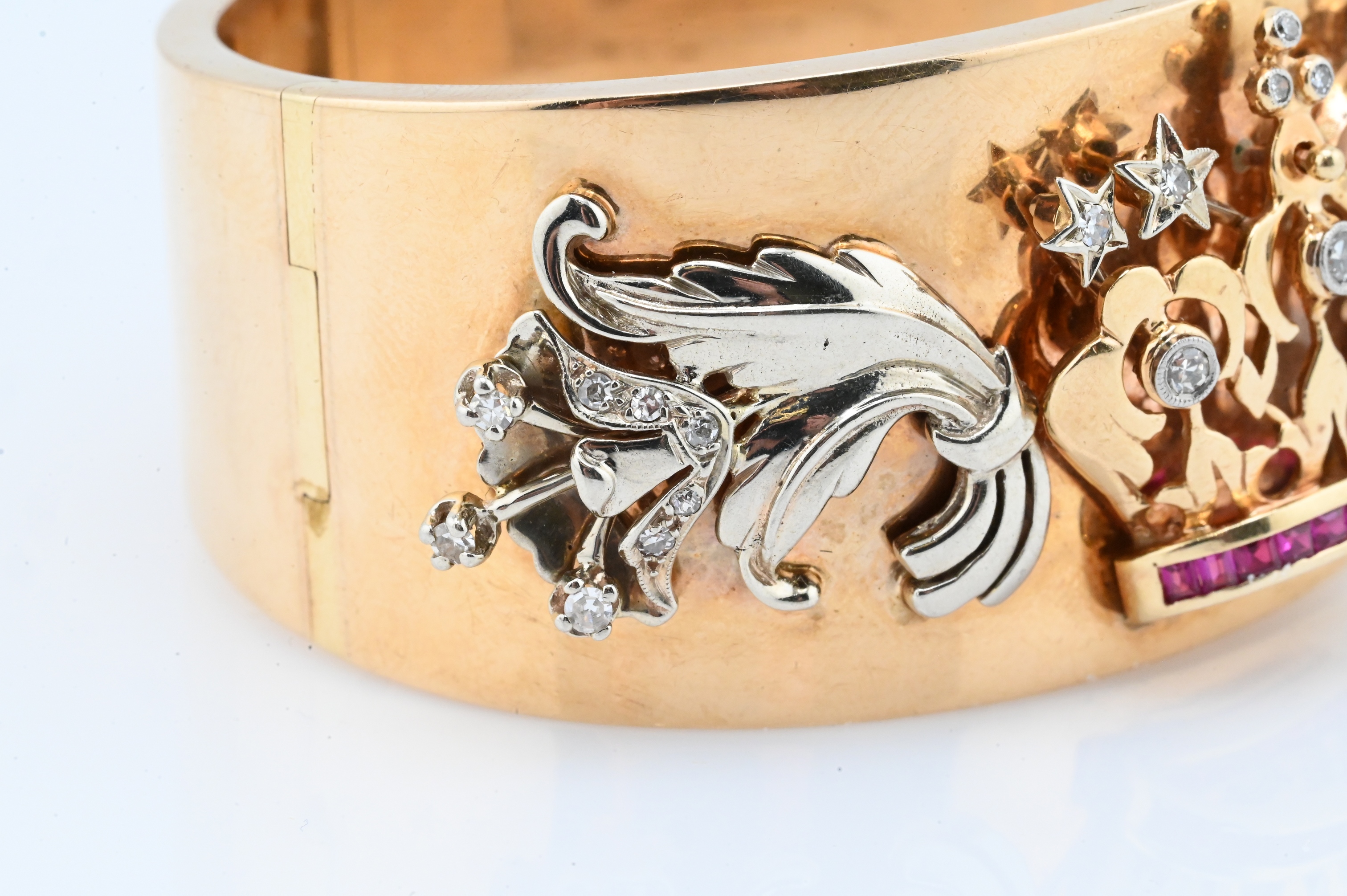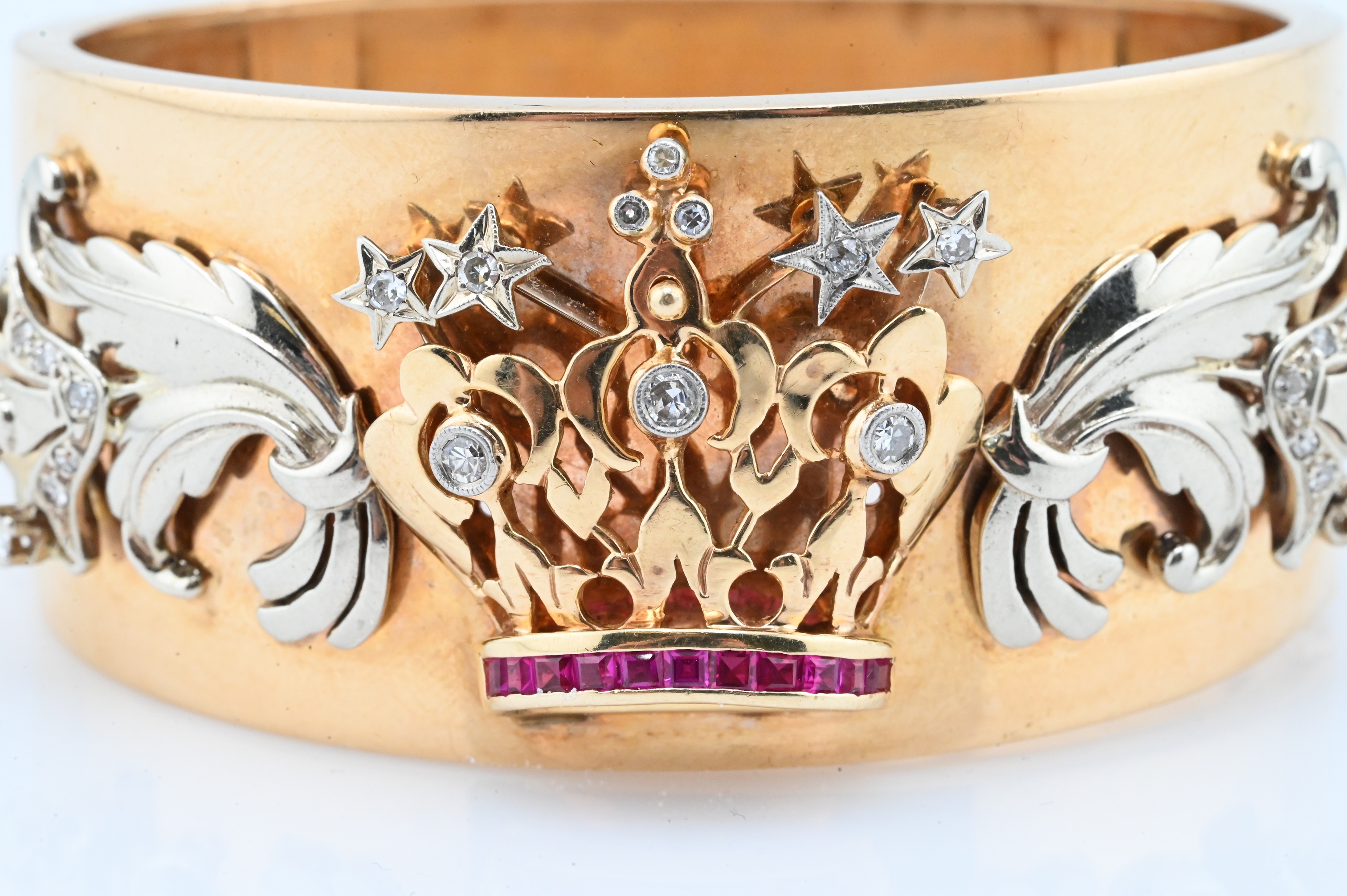 A wide 14k yellow gold hinged bangle, the front richly embellished with a raised crown motif set with round brilliant-cut diamonds, ruby baguettes, and scrolling white-gold foliate elements, further accented with applied star-shaped diamond mounts. Hinged opening with safety clasp.