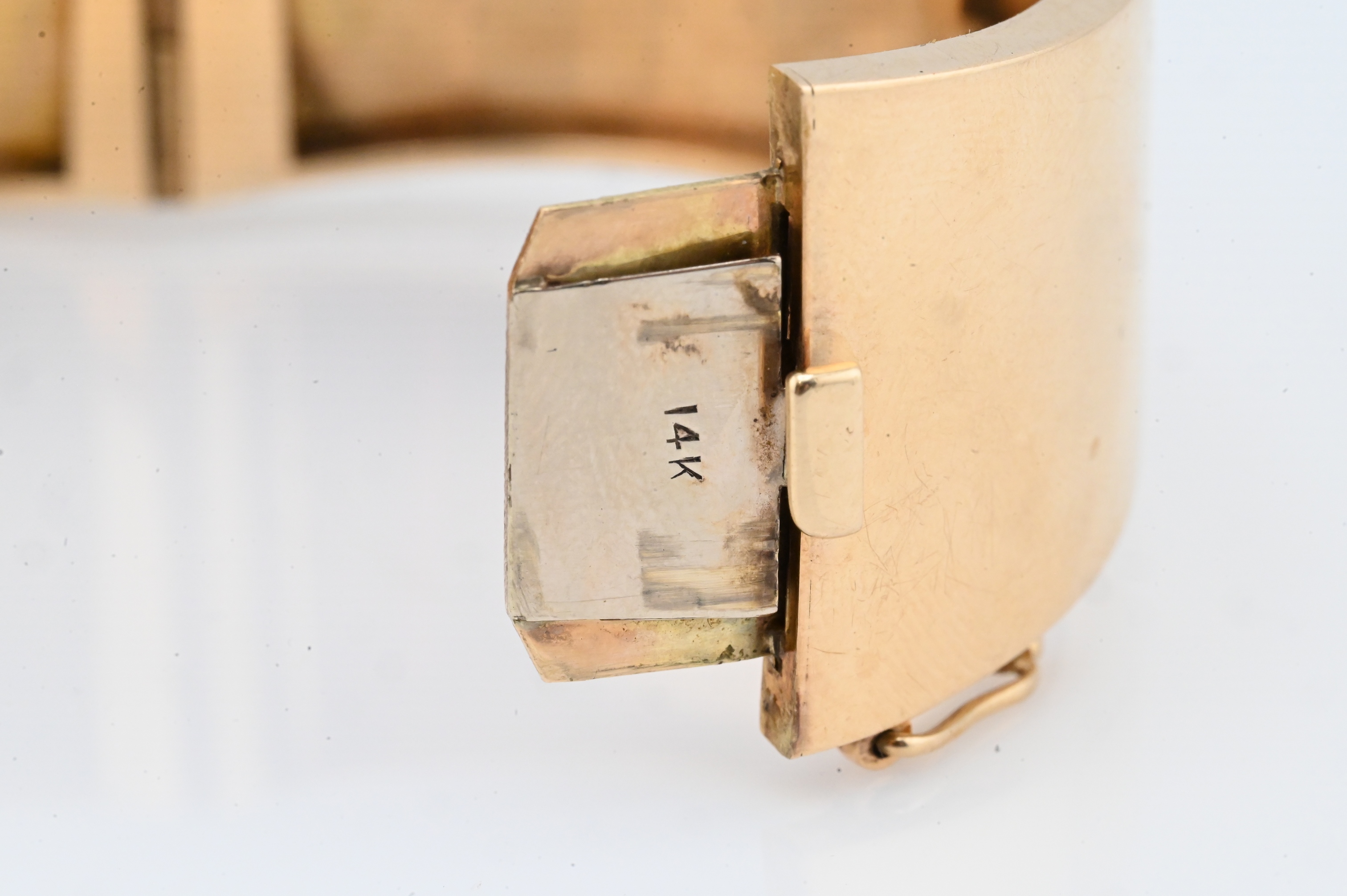 Lot 491: 14K Gold Bangle Bracelet with Diamond, Ruby & White Gold Accents