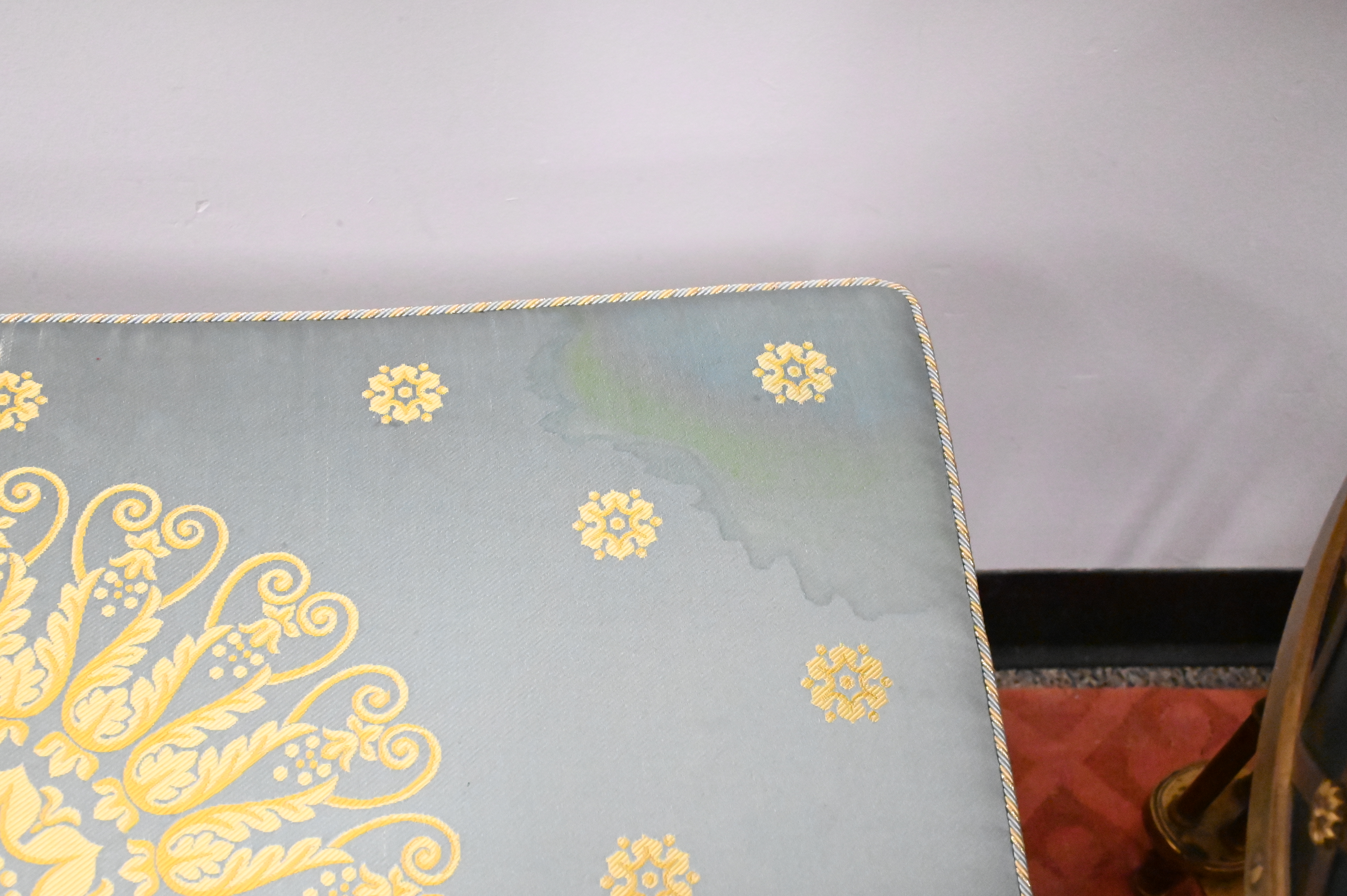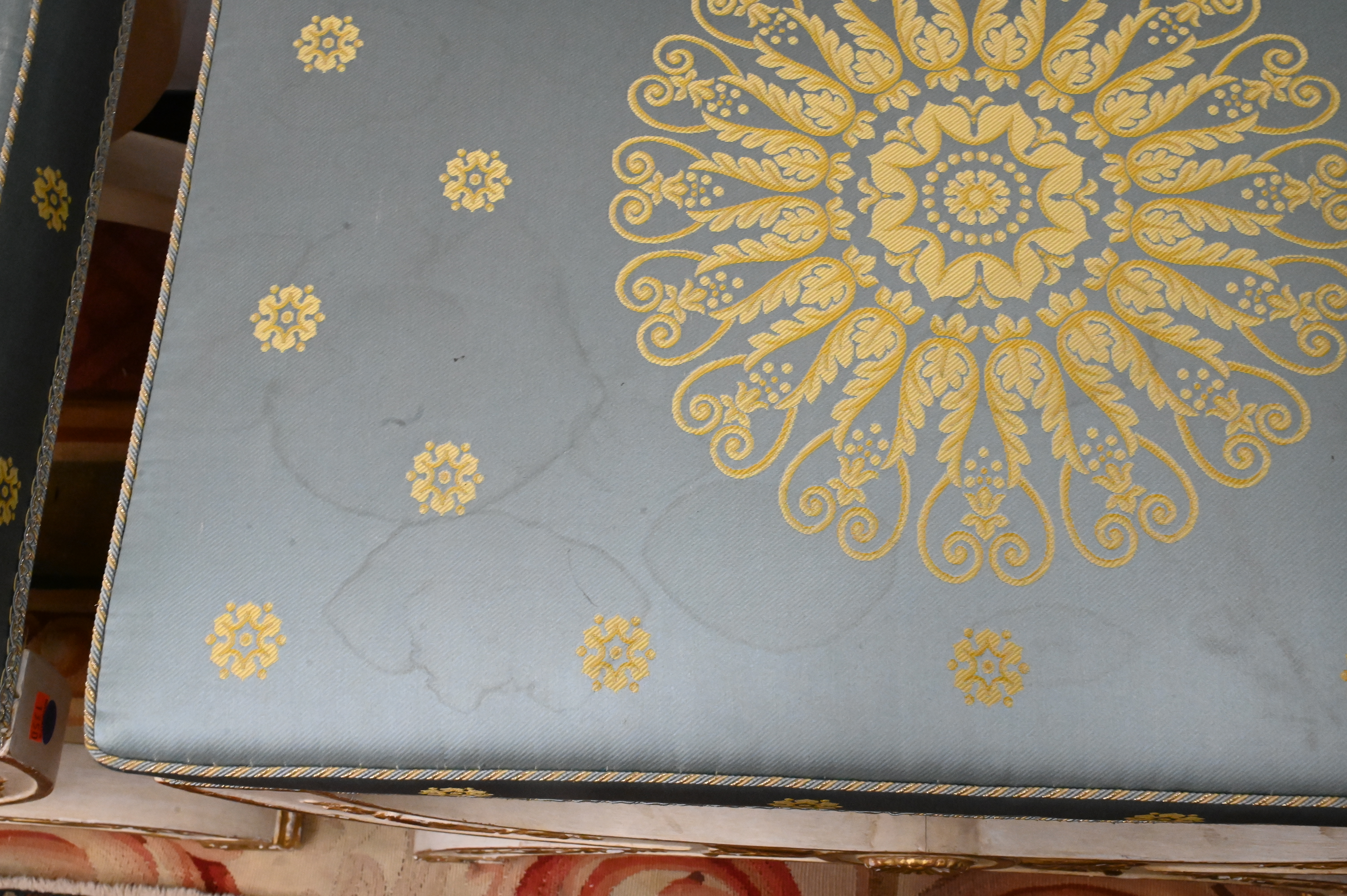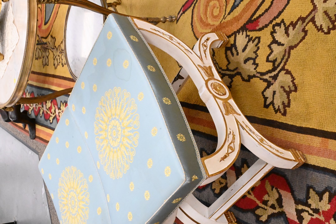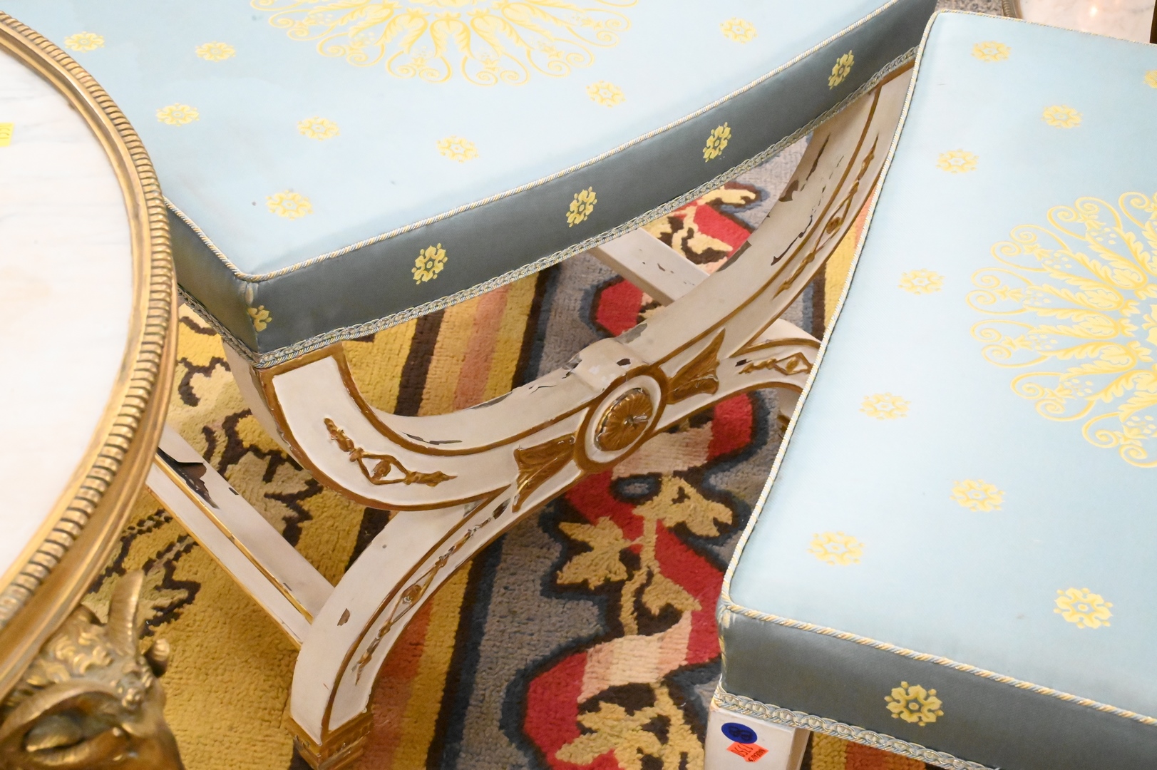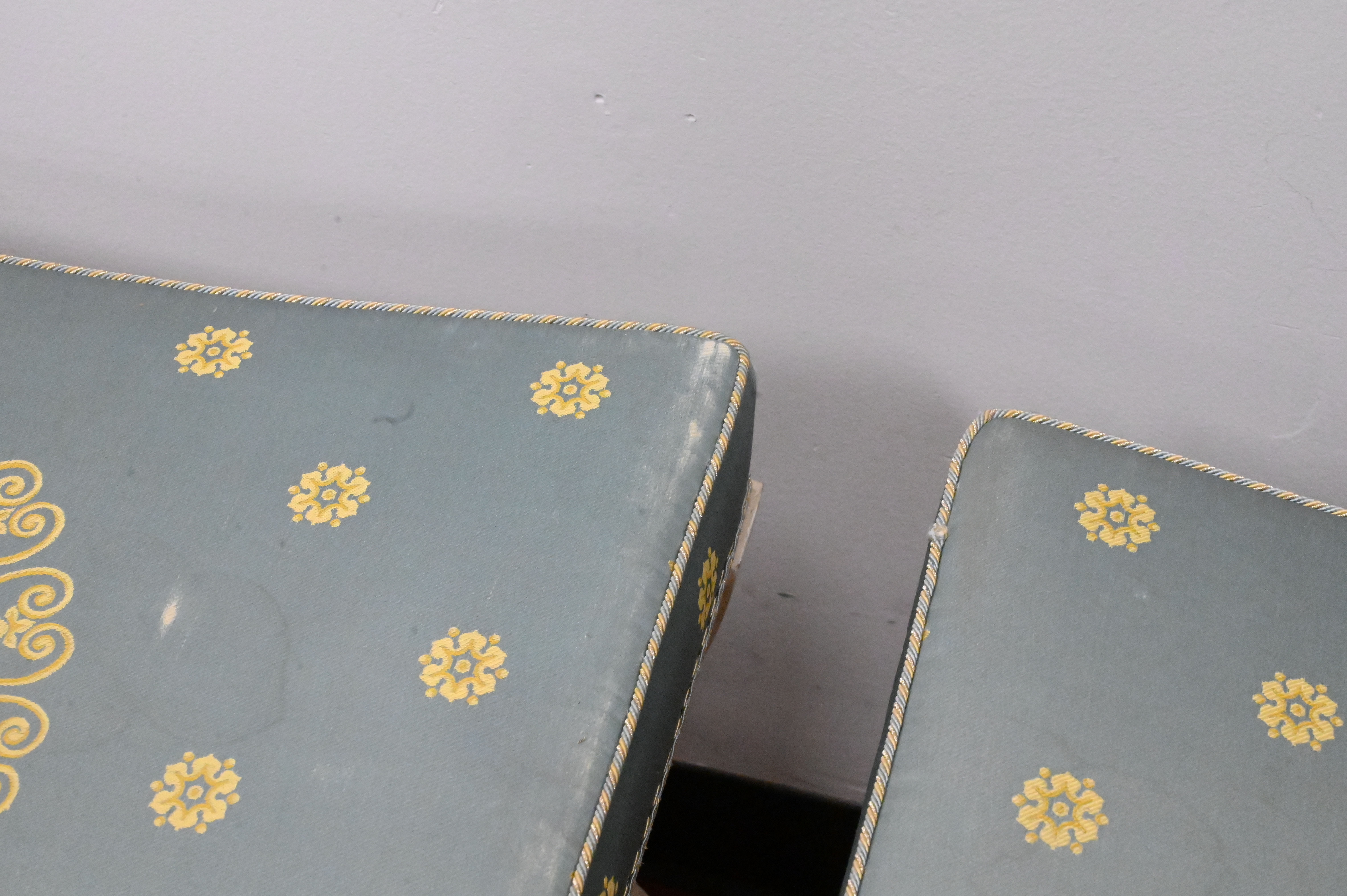 each having a concave seat covered in yellow and pale blue silk, on a curule-form base