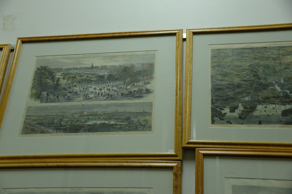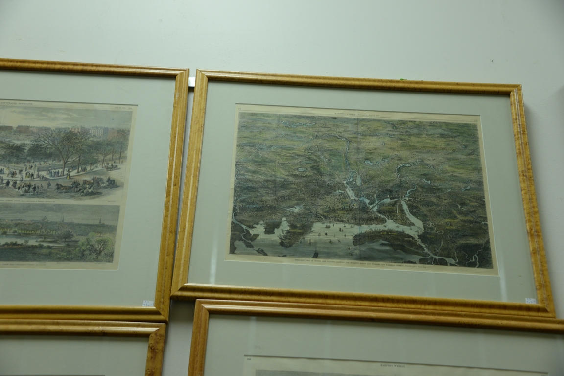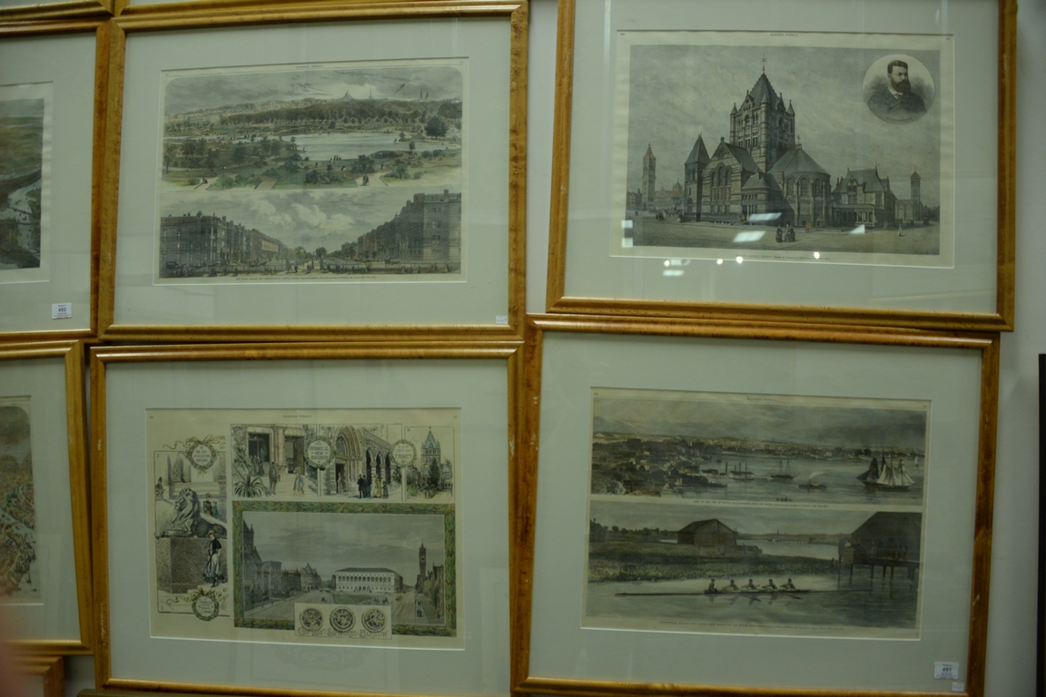 Eight large framed Harper’s Weekly or Frank Leslie’s prints to include birdseye view of Boston, Trinity Church, etc. sight size 14 1/2 x 21 Provenance: Property from Credit Suisse’s Americana Collection