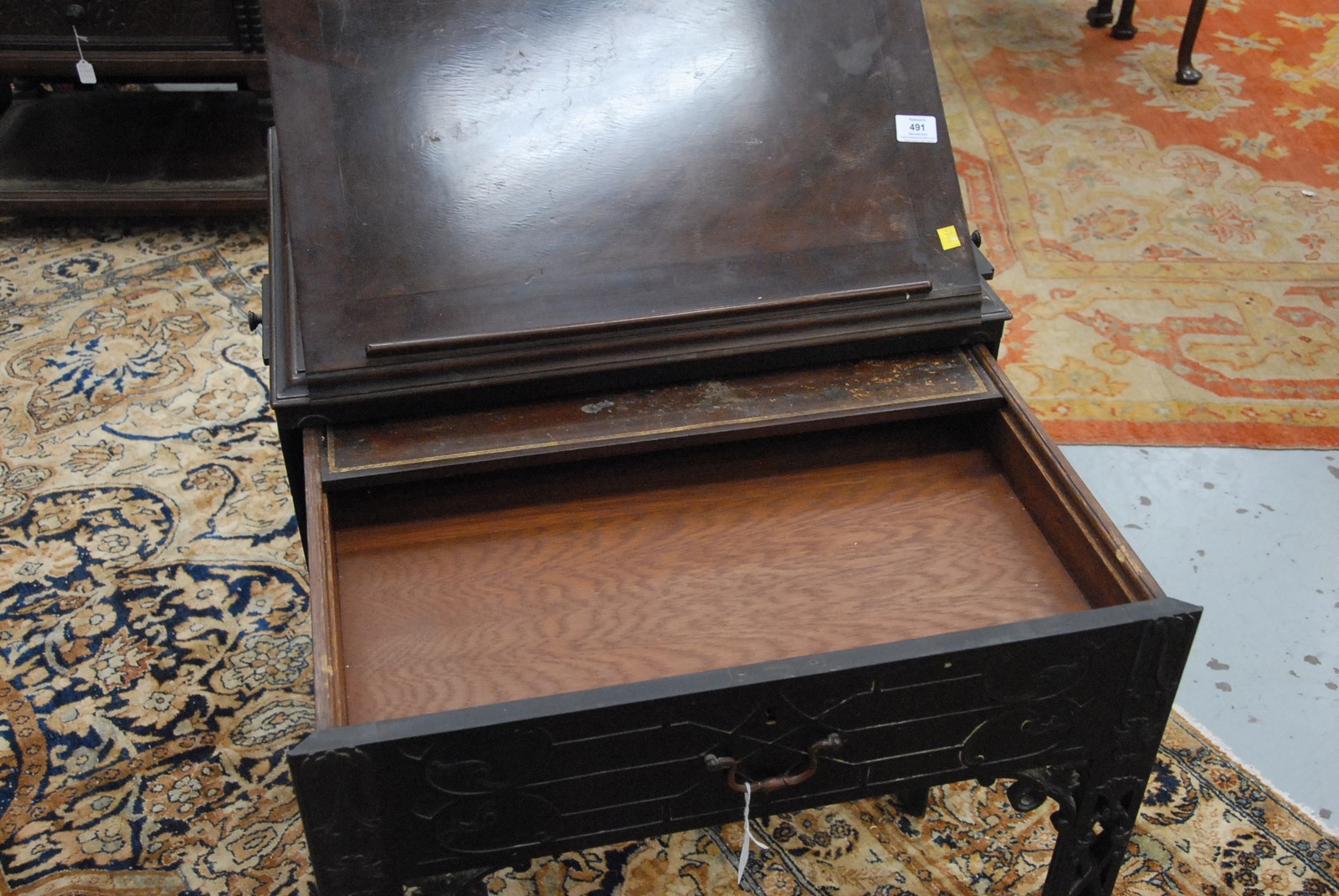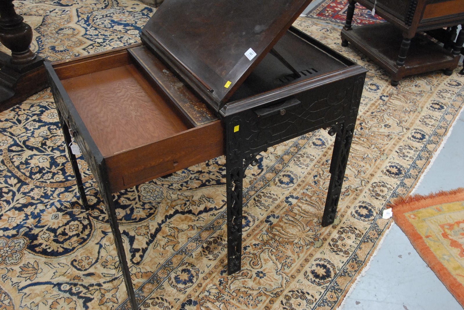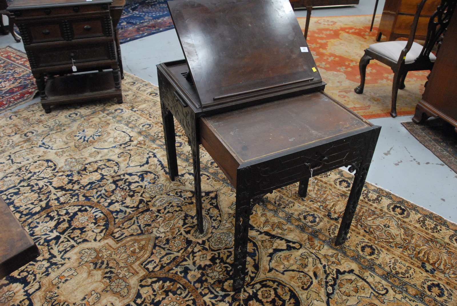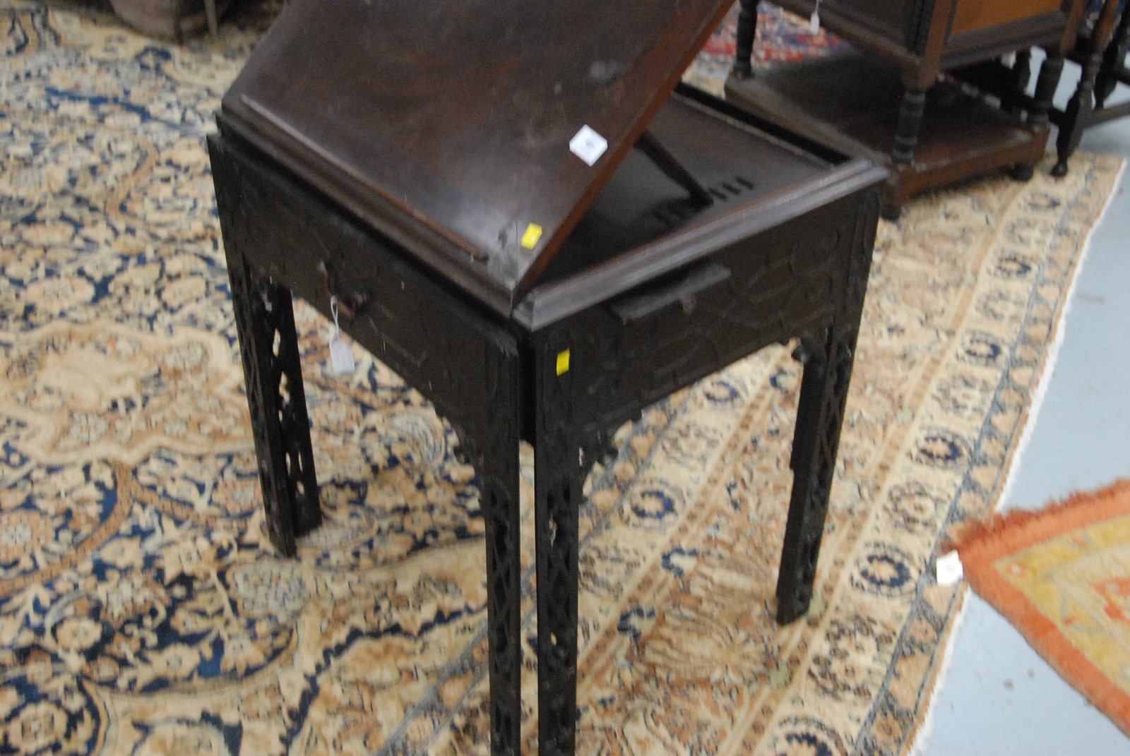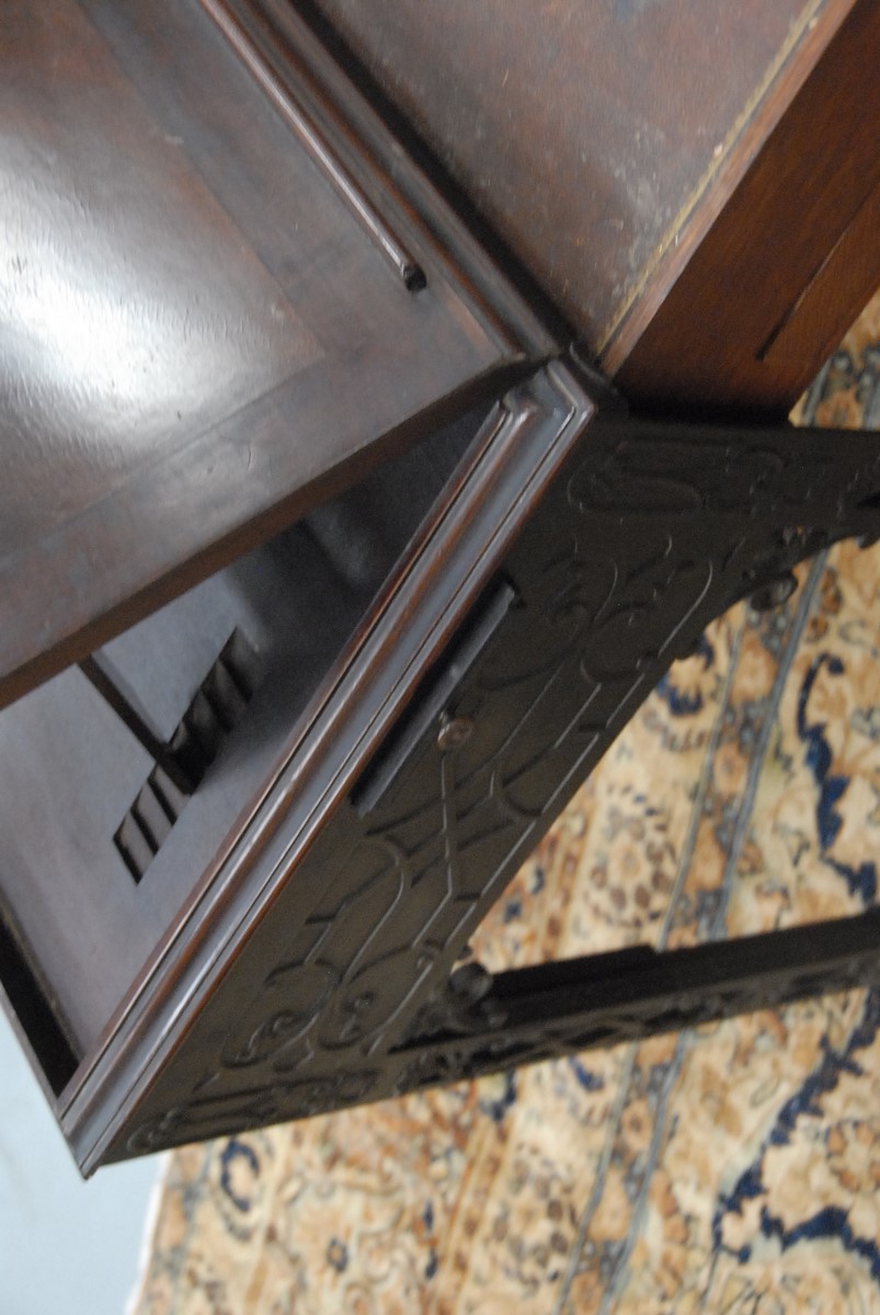 Lot 491: Mahogany Chinese Chippendale style table/desk, top tilts to hold book, front pulls out to leather top writing surface with candle slide on either side, all on open work carved legs. ht. 30 in. wd. 26 1/2 in. dp. 21 in. Provenance: Property