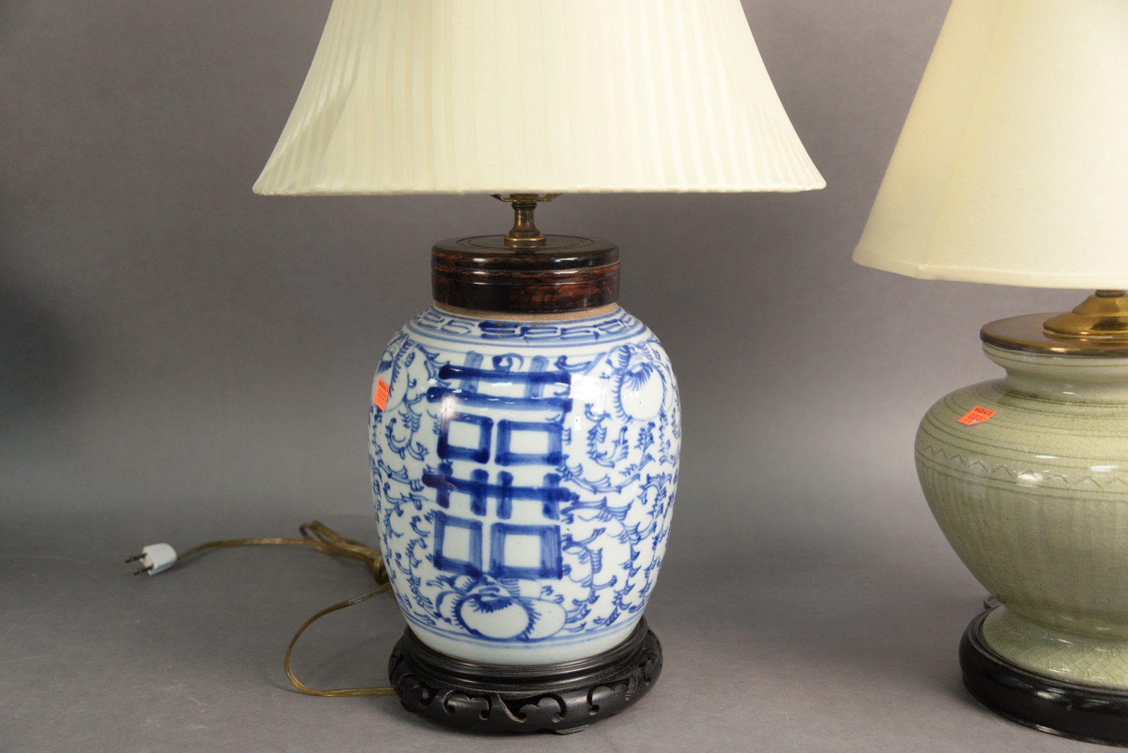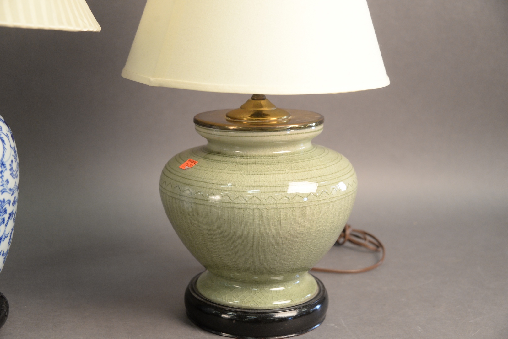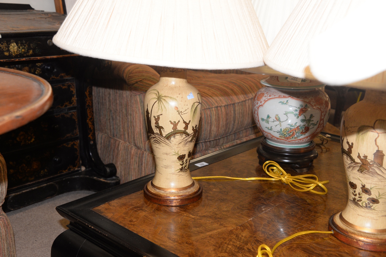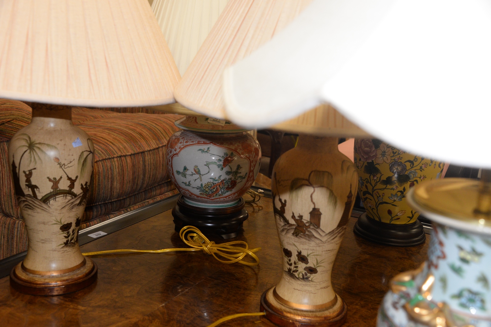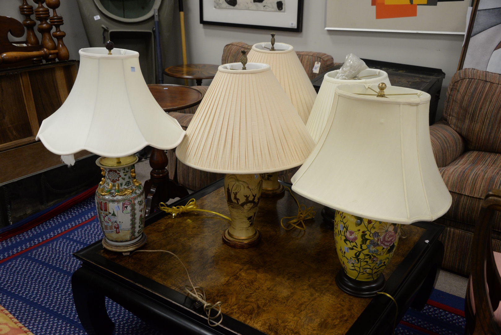 Lot 491: Seven Table Lamps, to include five Chinese style porcelain, along with a pair of Chinese decorated, tallest 30 inches.