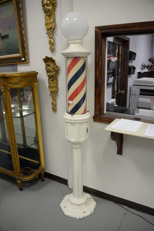 Lot 491: Theo Kochs free standing barber pole, white enameled with iron base and lighted globe top. ht. 80in. Provenance: Property from Cr…