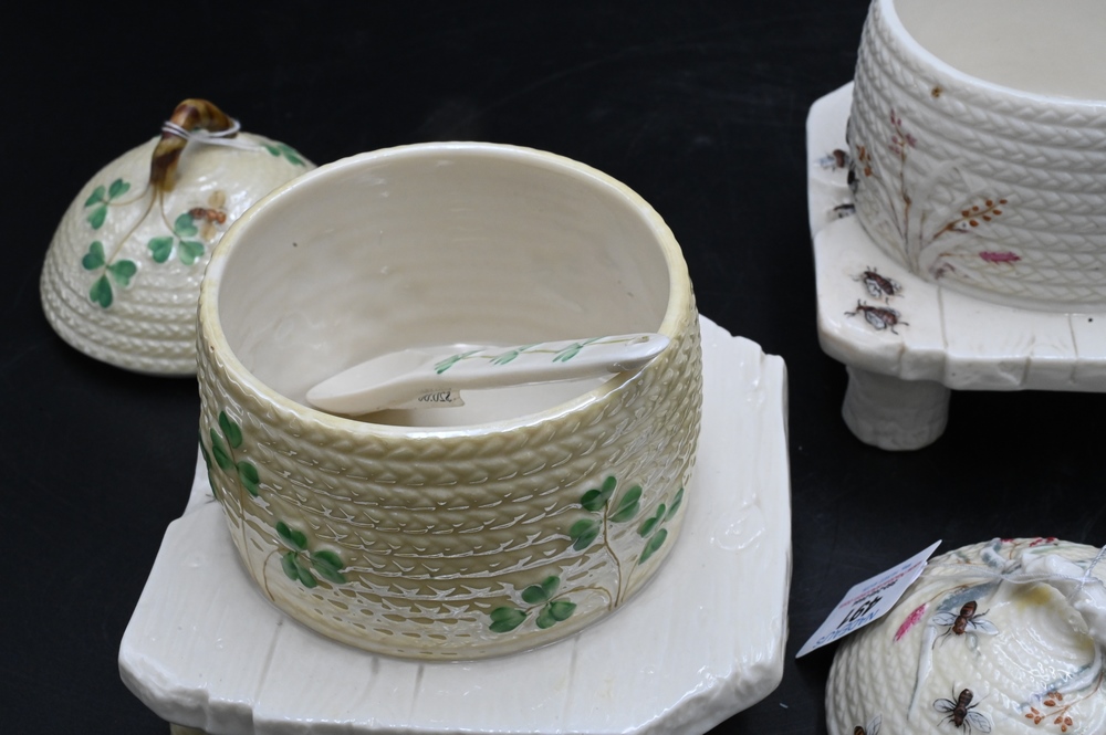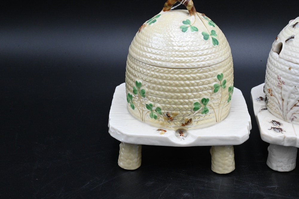 Two Belleek Honey or Bee Pots with Covers, both painted with black mark on bottom, height 5 3/4 inches. Provenance: Collections of Norma Reilly, New Jersey.