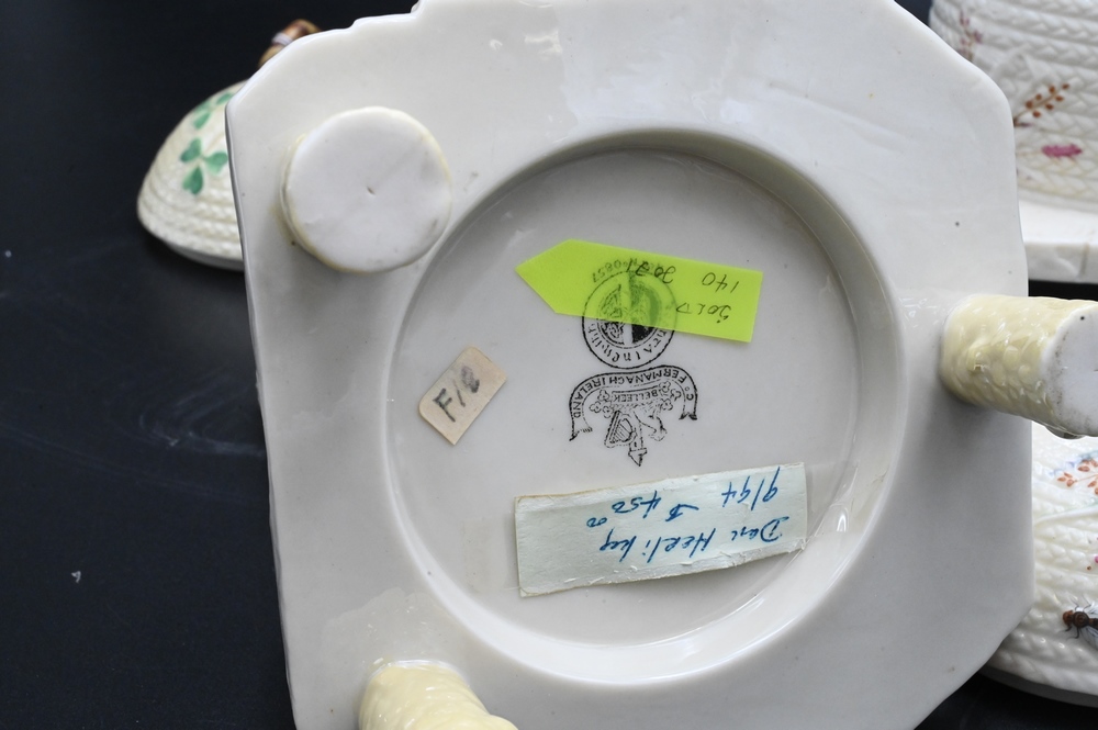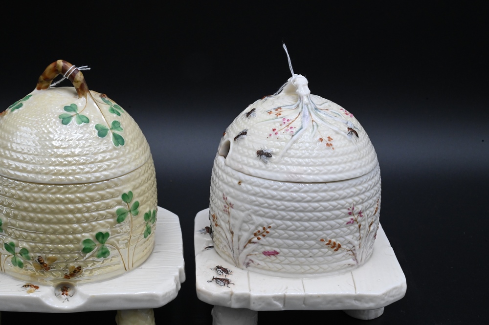 Lot 491: Two Belleek Honey or Bee Pots with Covers, both painted with black mark on bottom, height 5 3/4 inches. Provenance: Collections of Norma Reilly, New Jersey.