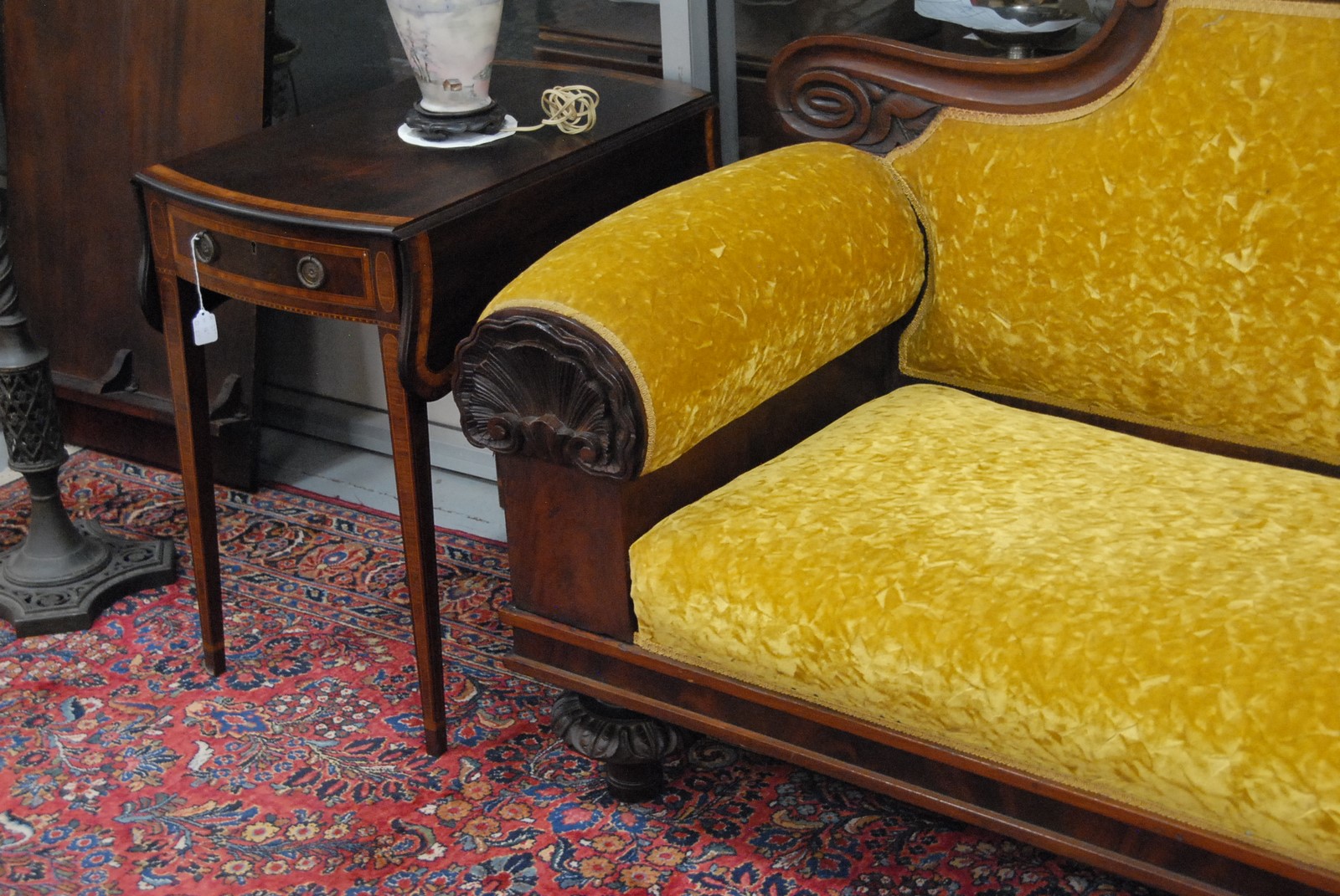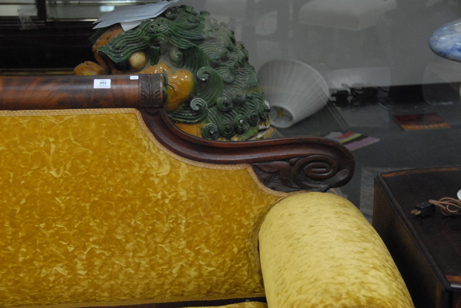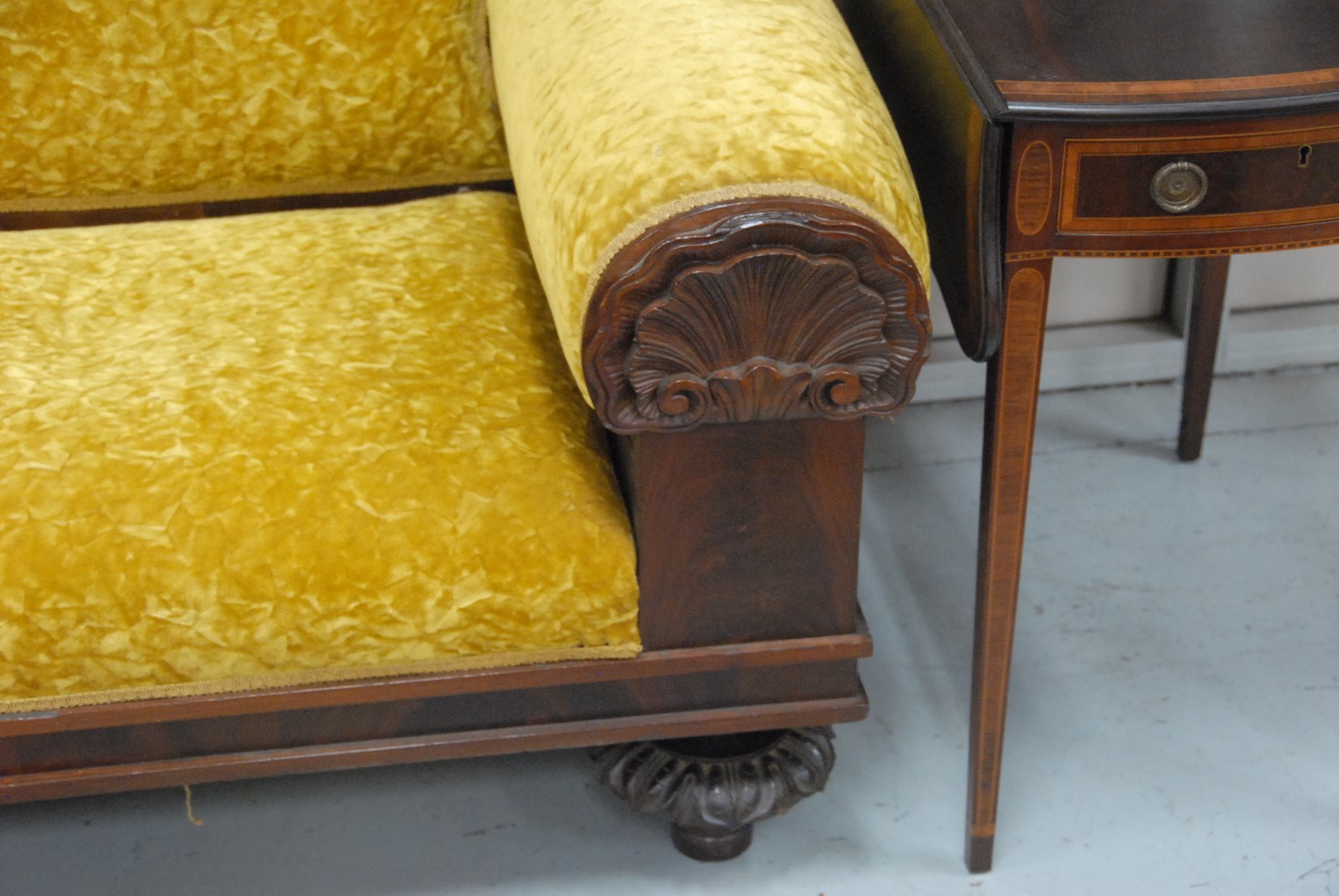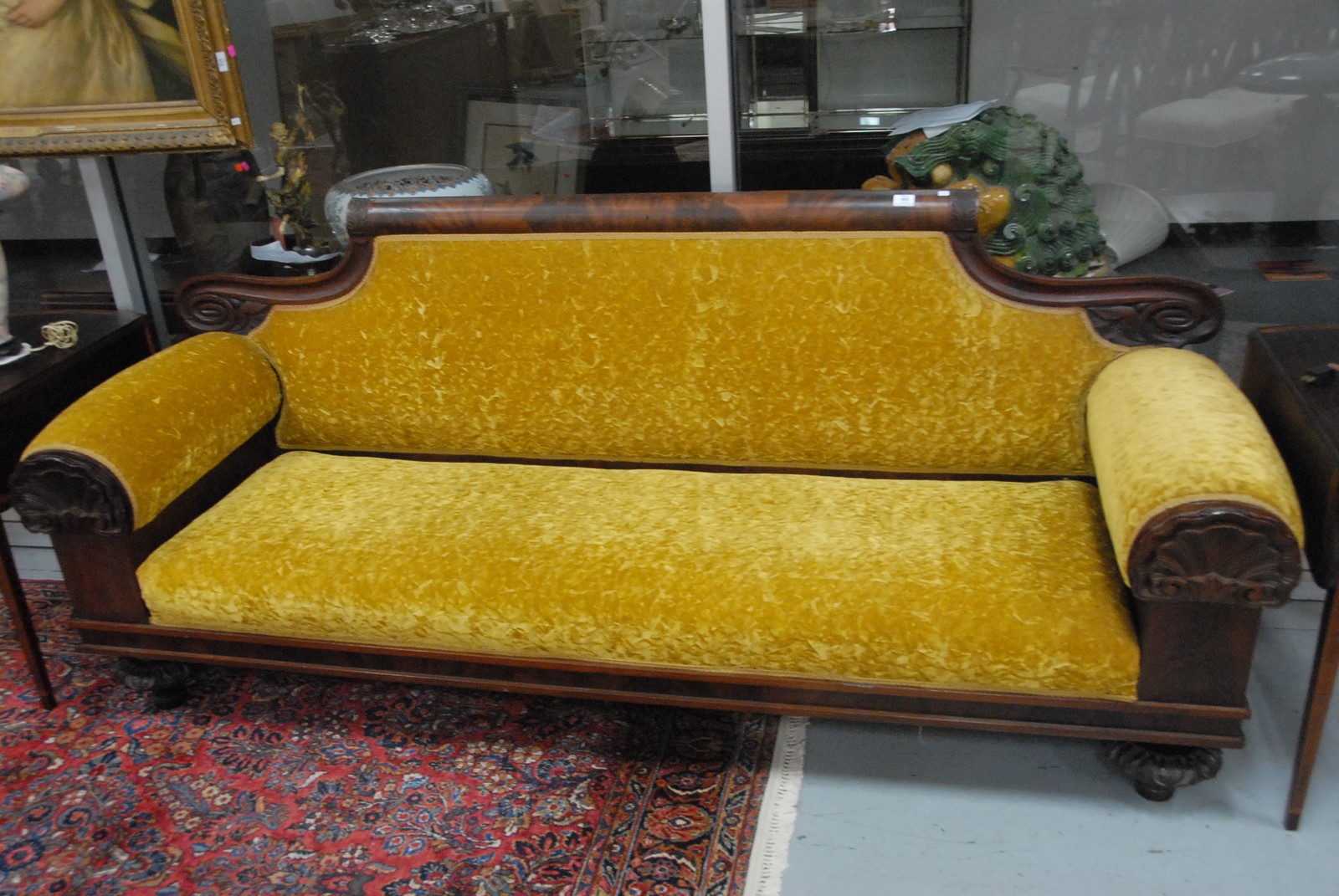 Lot 492: Classical mahogany sofa with large shell carved arm ends and highly carved turned legs. wd. 87 in.