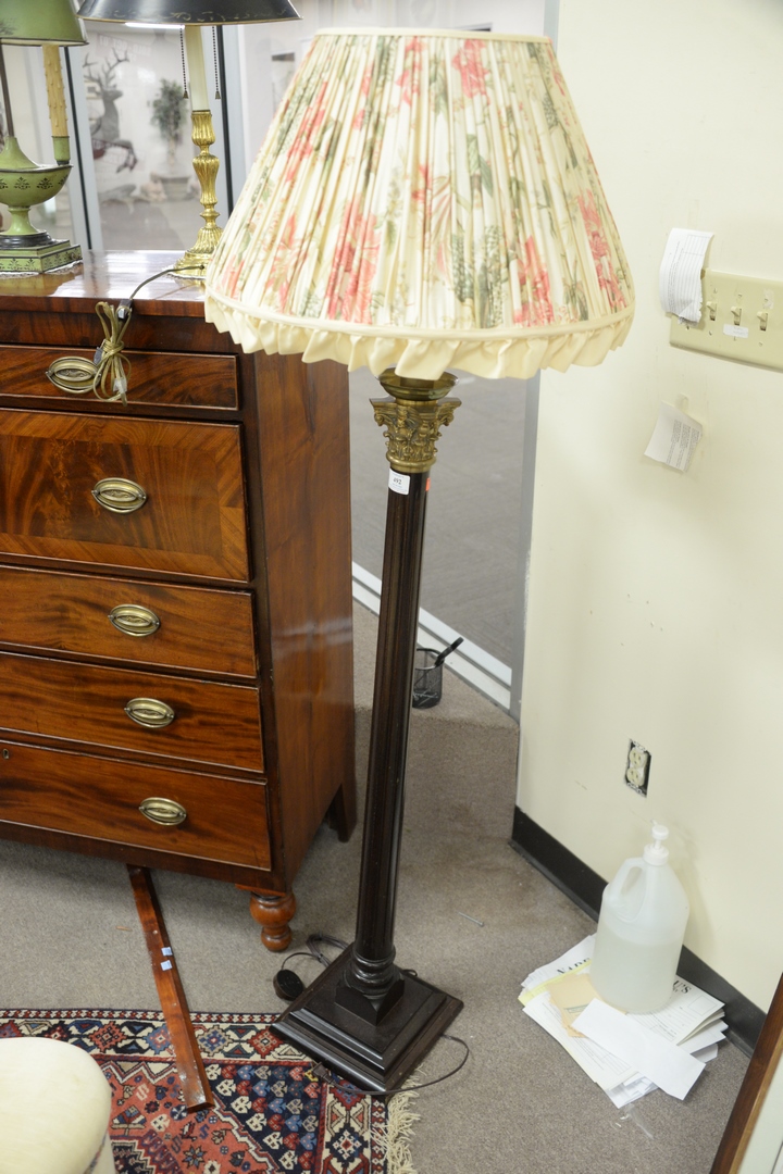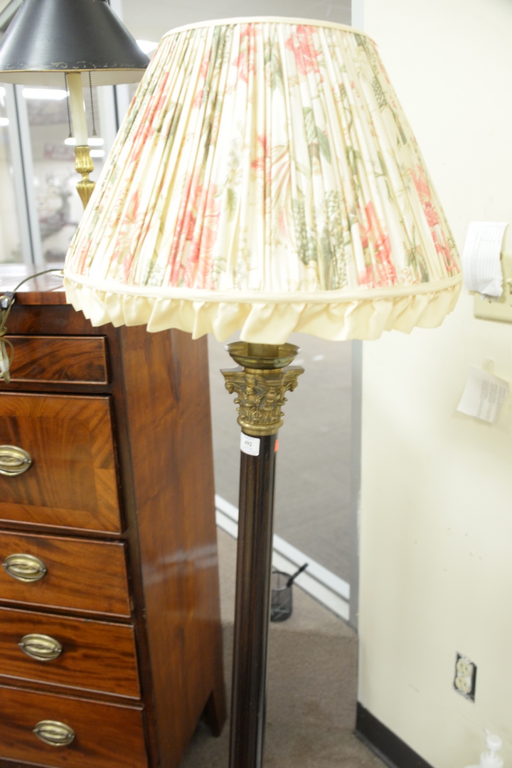Column wood floor lamp with bronze capital and custom silk shade, height 63 inches.