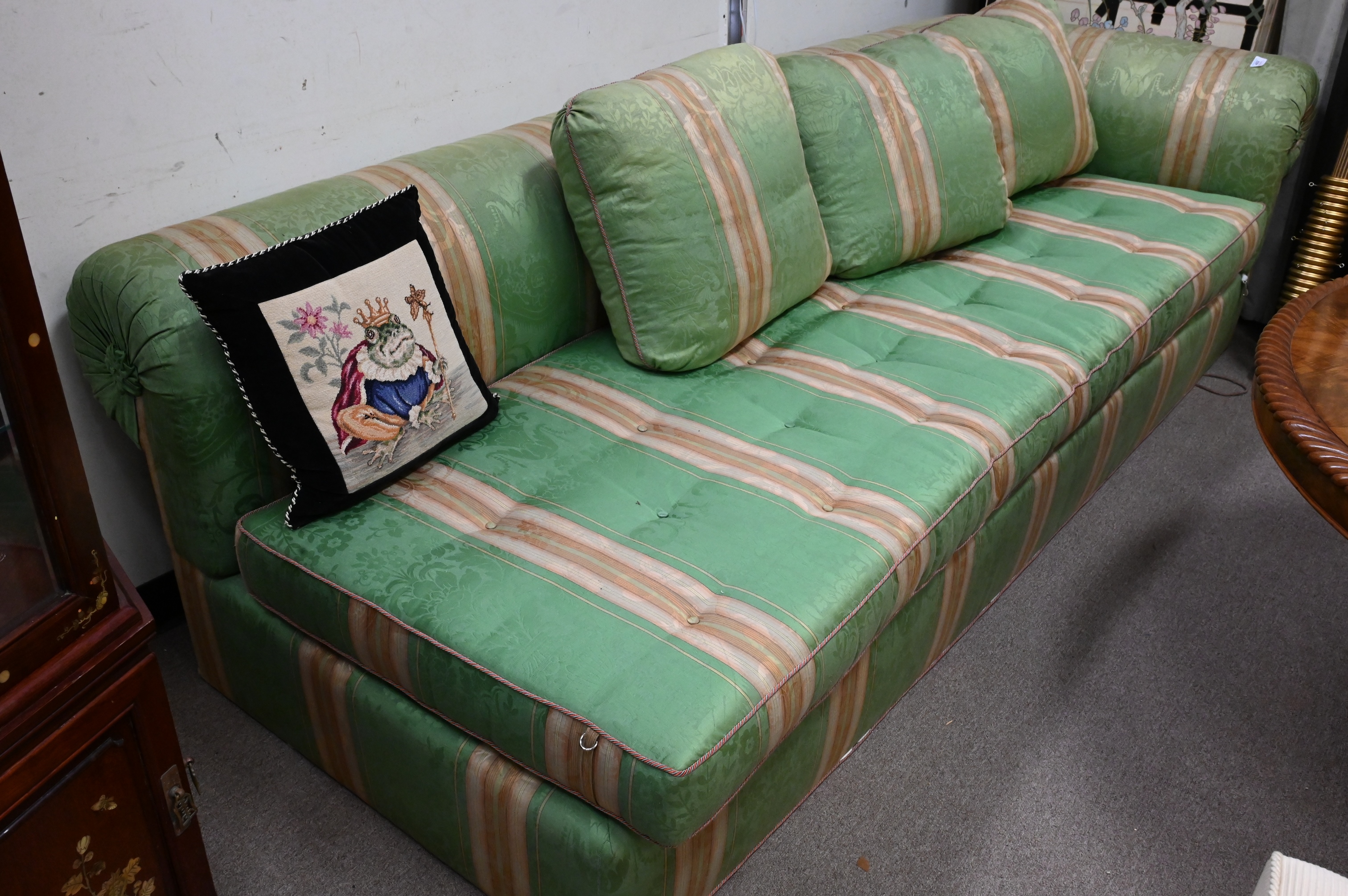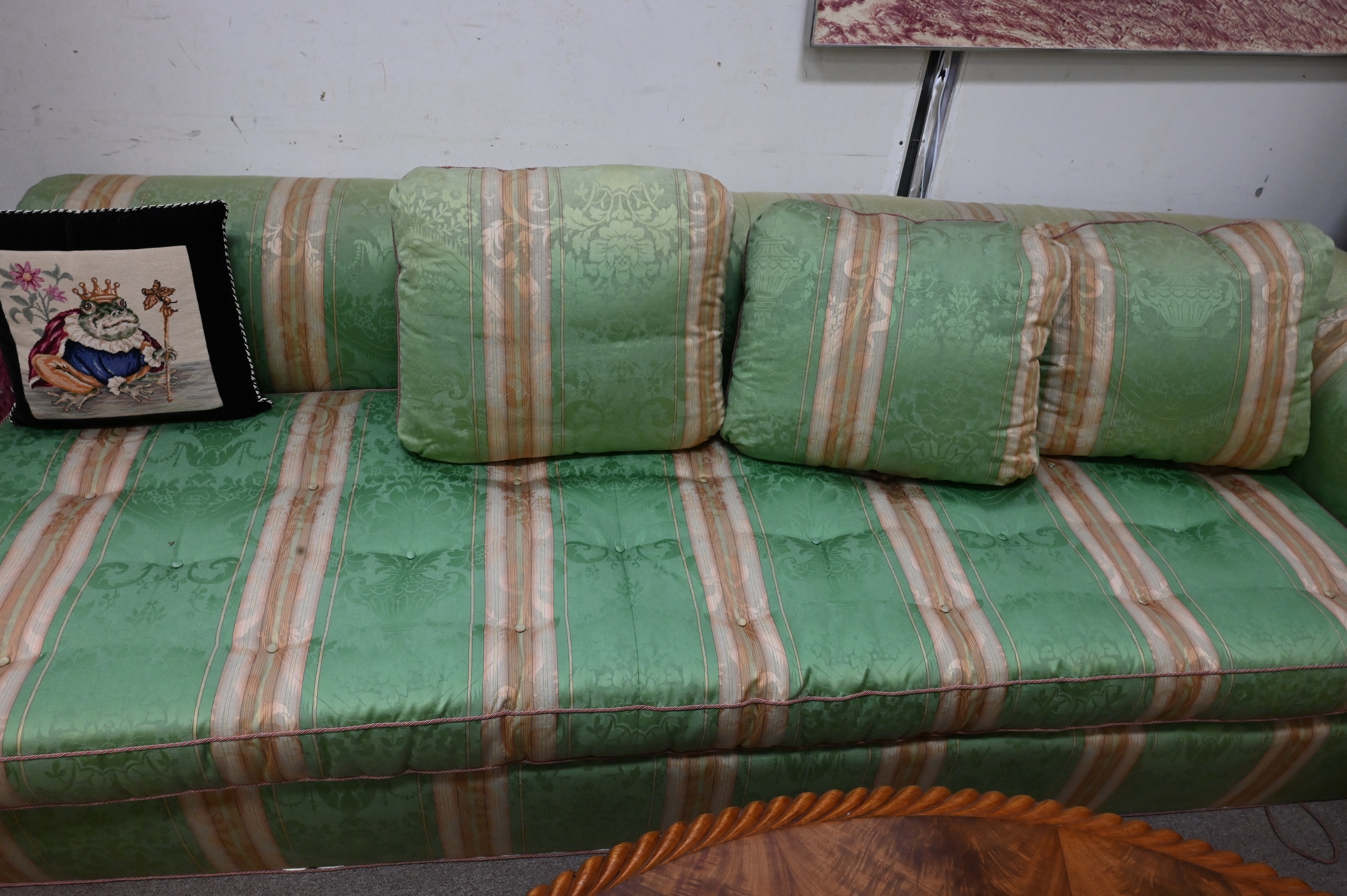 Custom Upholstered Sofa, having one arm and one finished end, slight sunfading, height 28 inches, length 100 inches.