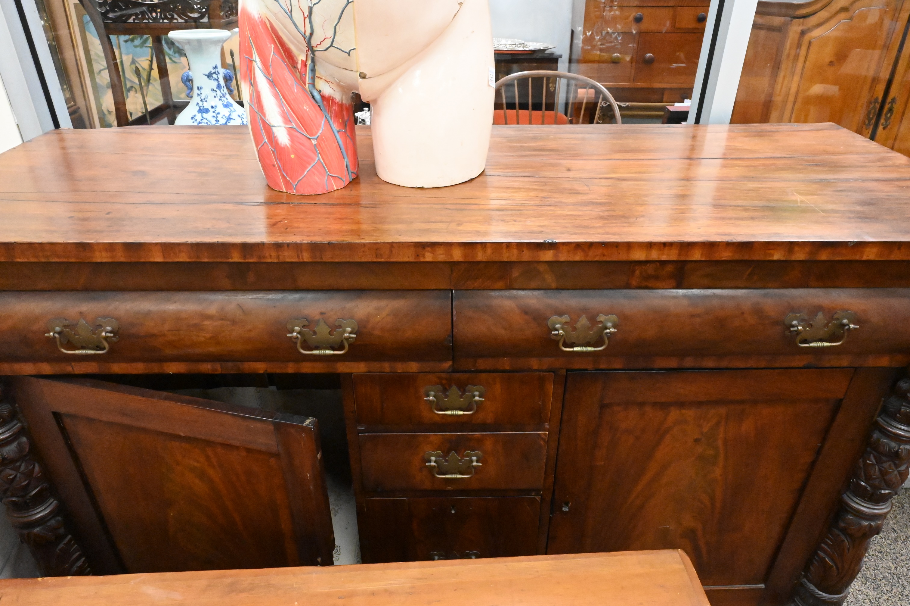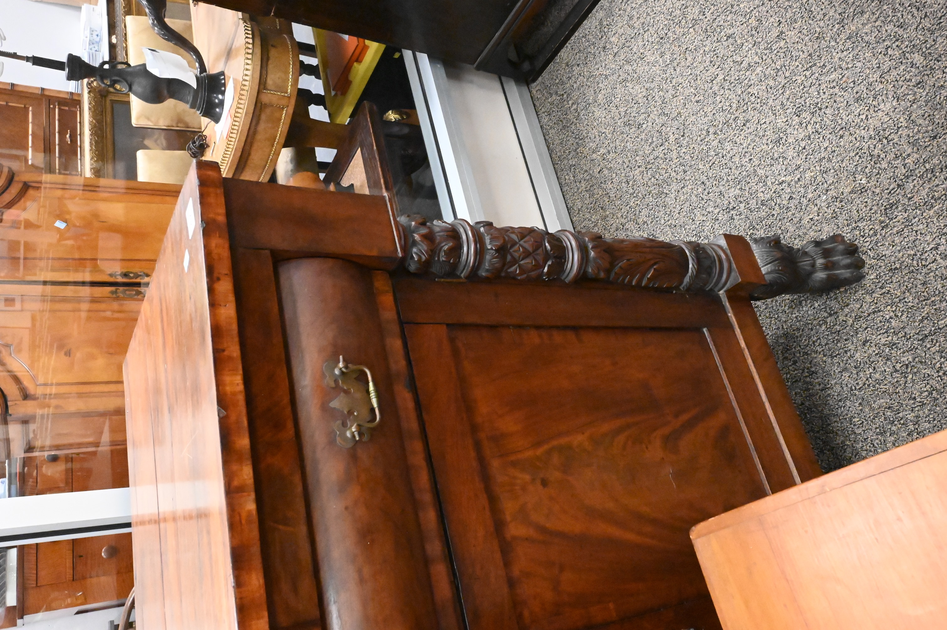 having two top drawers over three drawers flanked by two doors and carved posts ending in large hairy paw feet