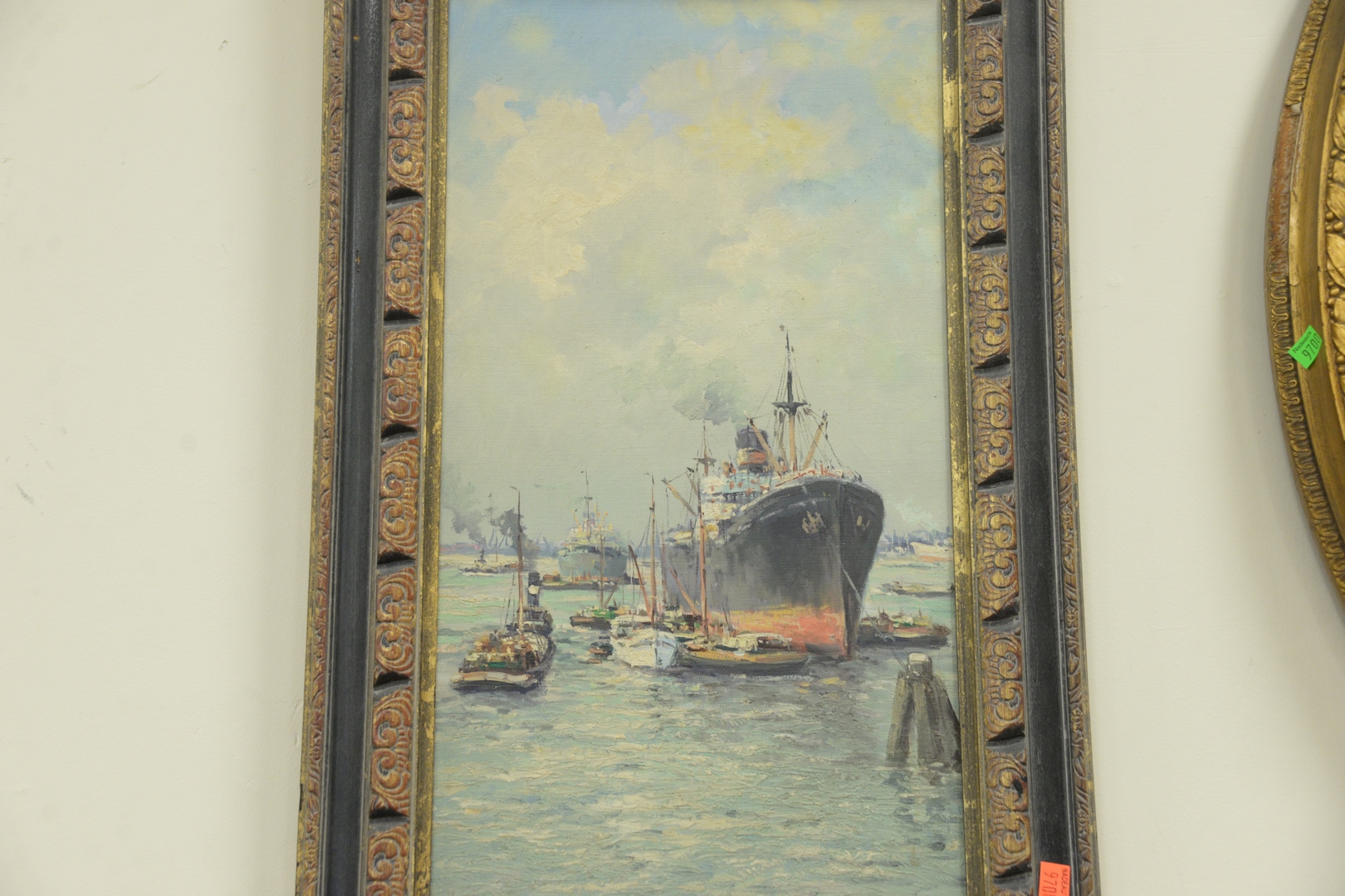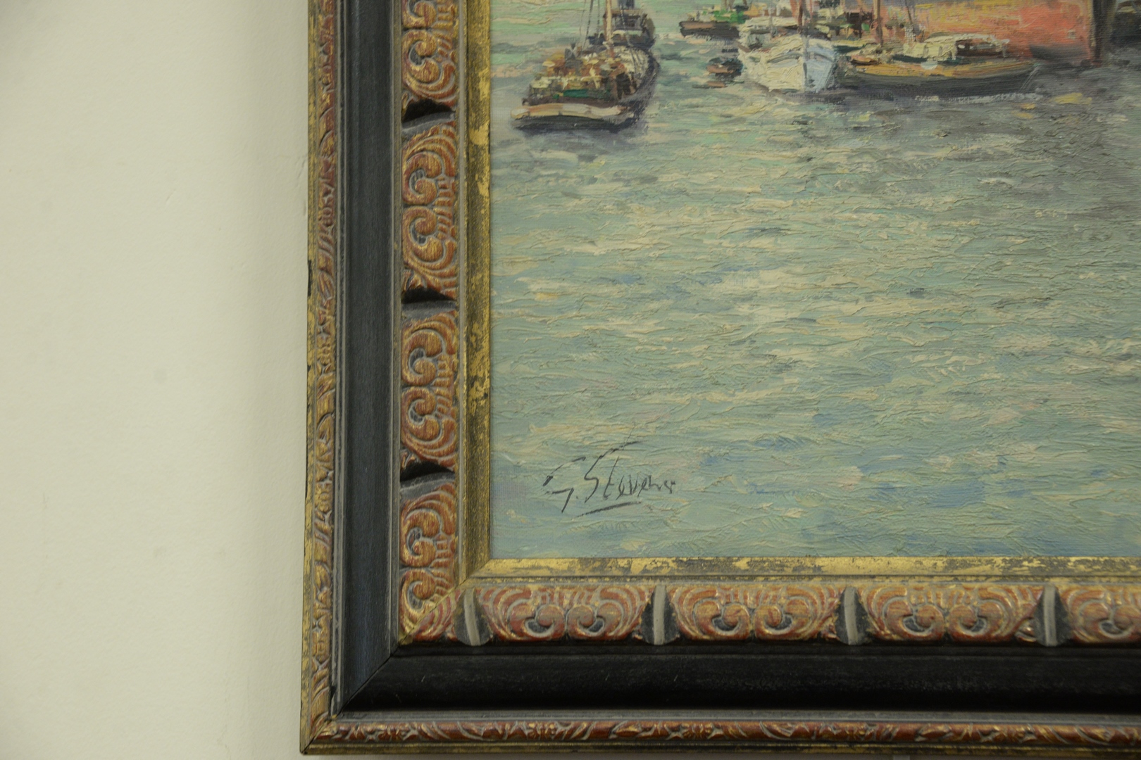 George Stevens (American, 1866 – 1926), steamships in port, oil on canvas, signed lower left “G. Stevens”, 24″ x 12″. Provenance: Estate of James Wadhams