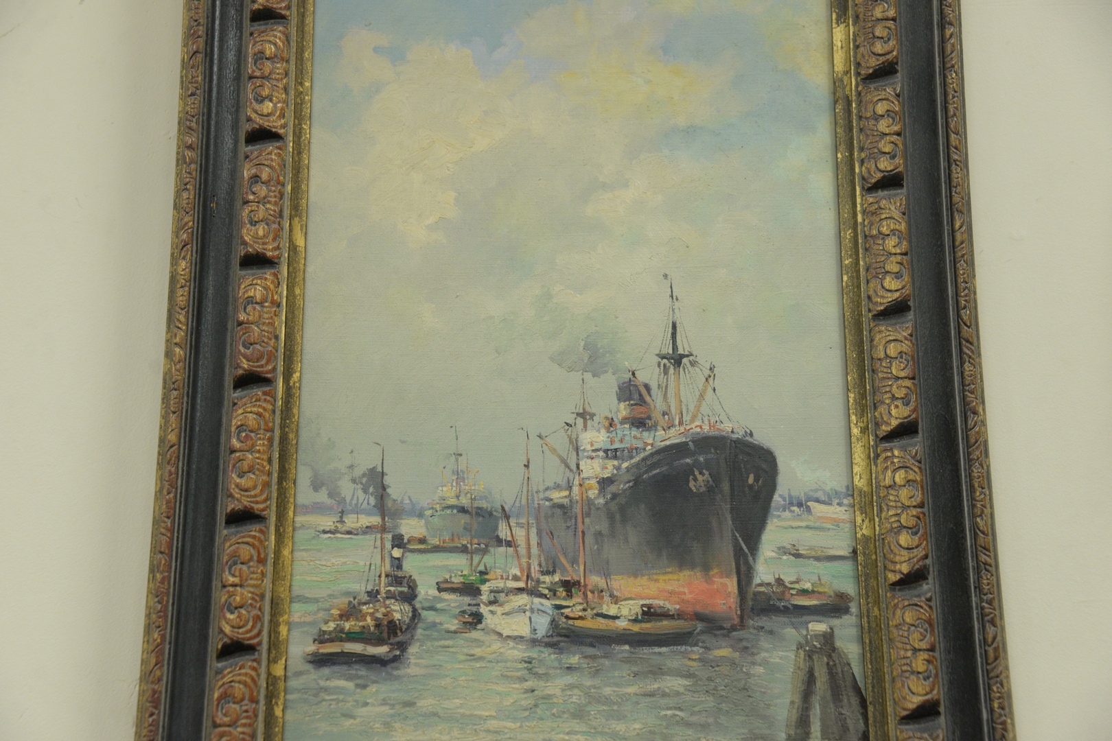 Lot 492: George Stevens (American, 1866 – 1926), steamships in port, oil on canvas, signed lower left “G. Stevens”, 24″ x 12″. Provenance: Estate of James Wadhams