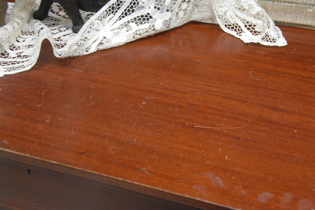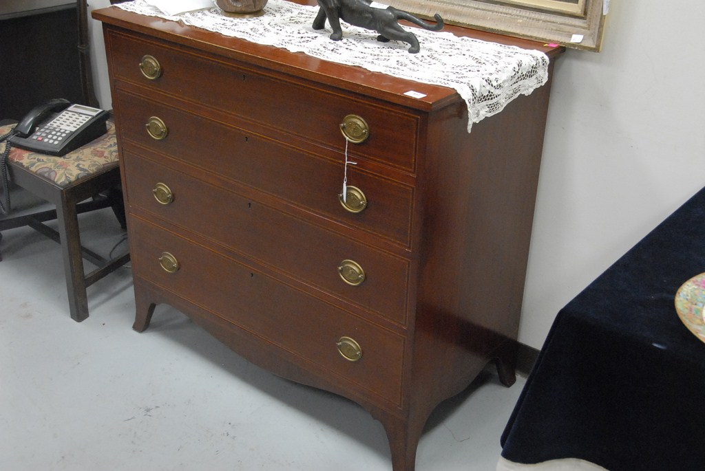 Lot 492: Margolis mahogany chest with four graduated drawers set on flared French feet, all drawers inlaid.ht. 37in. wd. 40in. dp. 21in.