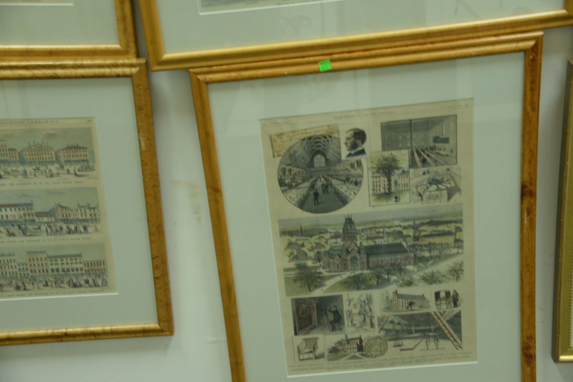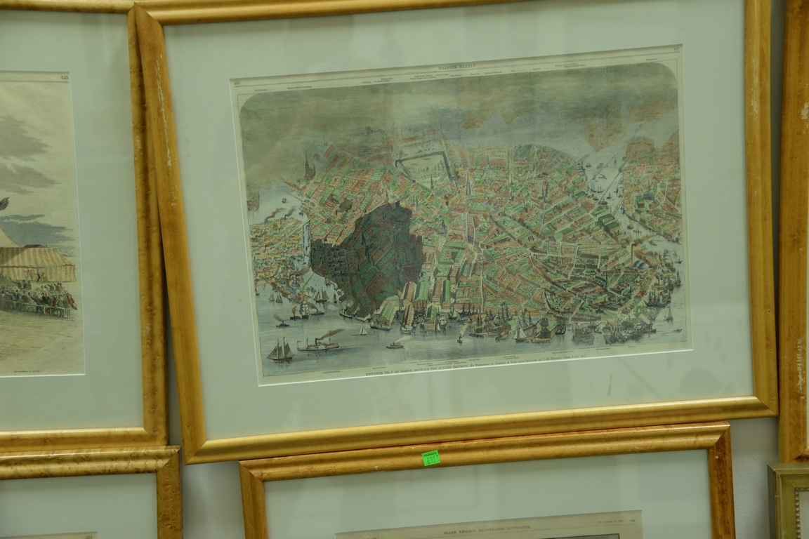 Lot 492: Set of eight large framed Harper’s Weekly prints to include birdseye view of Boston Ballou’s Pictorial, Copley Square, etc. all in m…