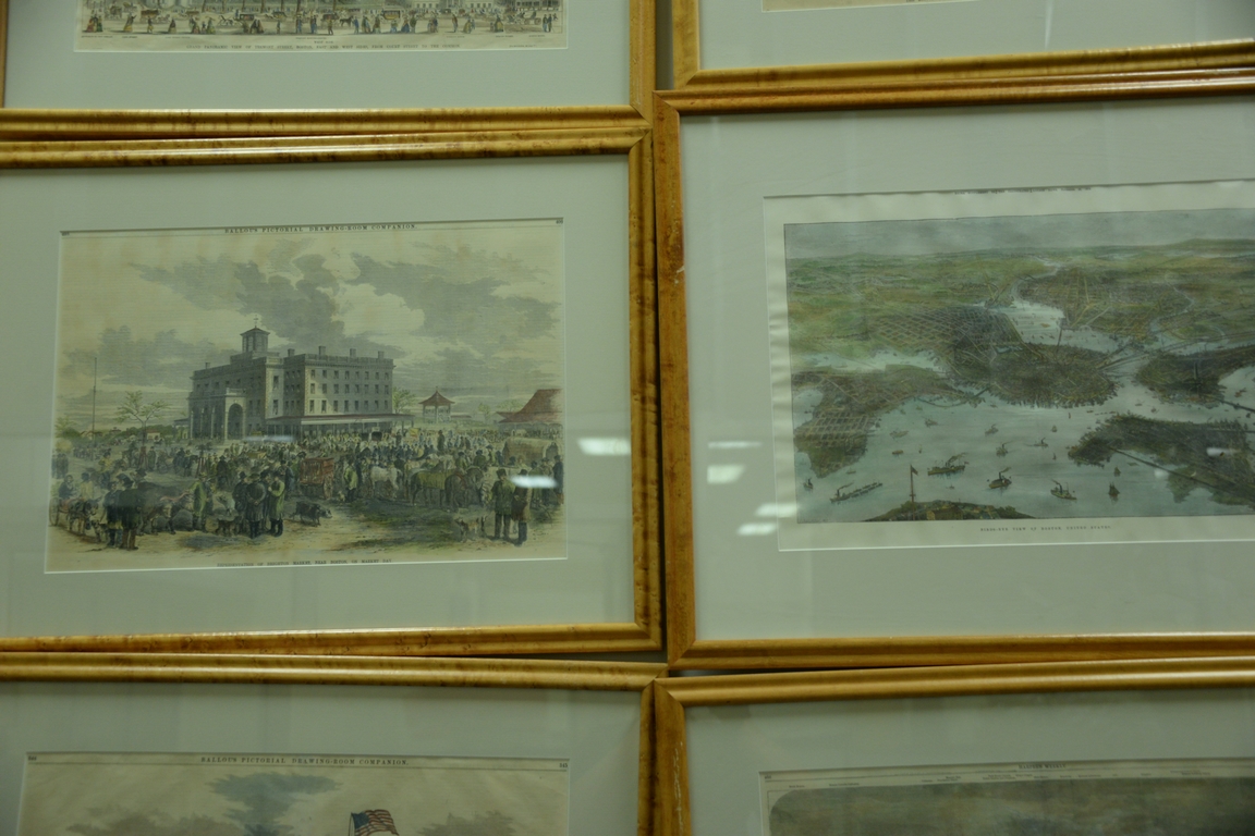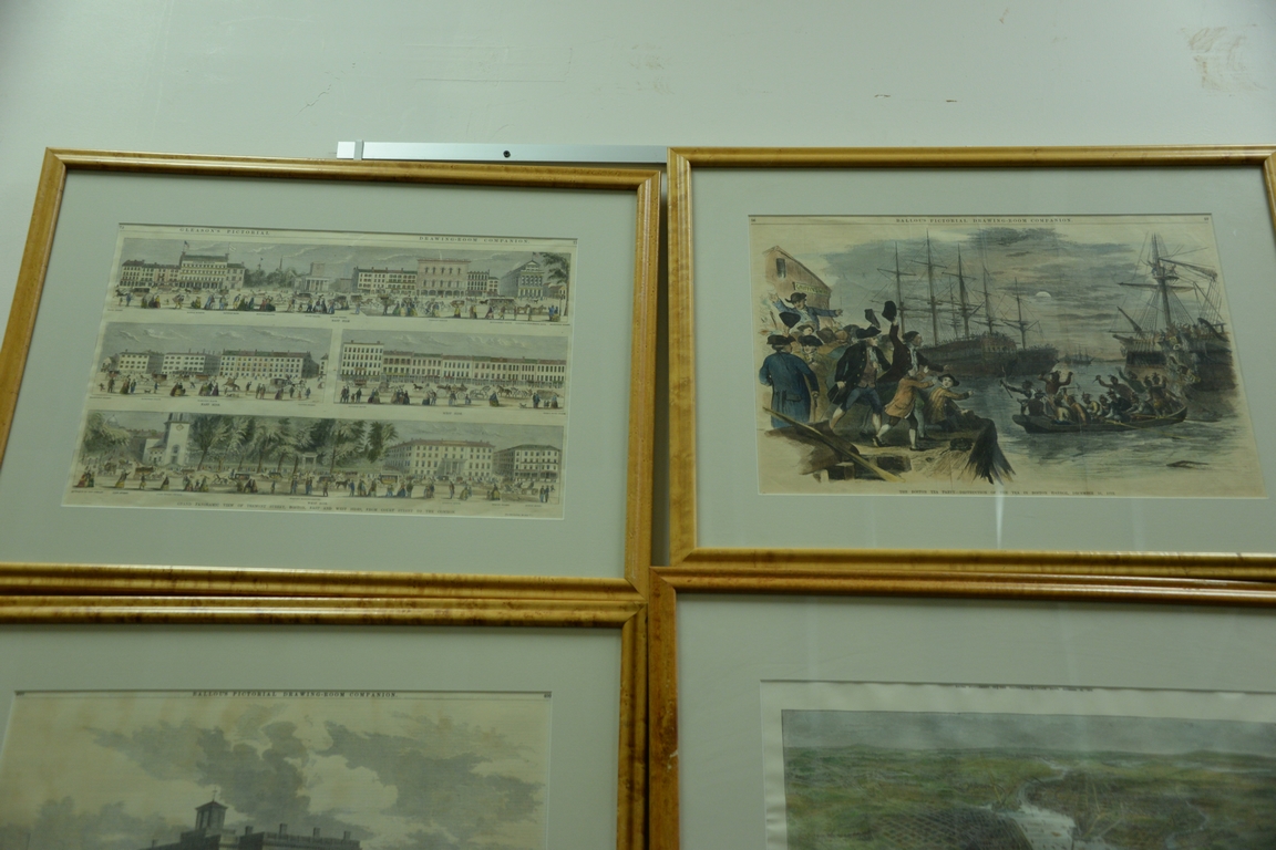 Set of eight large framed Harper’s Weekly prints to include birdseye view of Boston Ballou’s Pictorial, Copley Square, etc. all in maple frames. sight size 14 1/2 x 21 Provenance: Property from Credit Suisse’s Americana Collection
