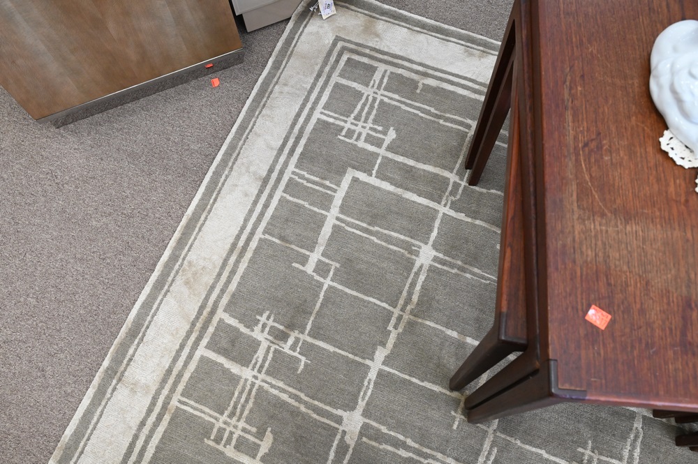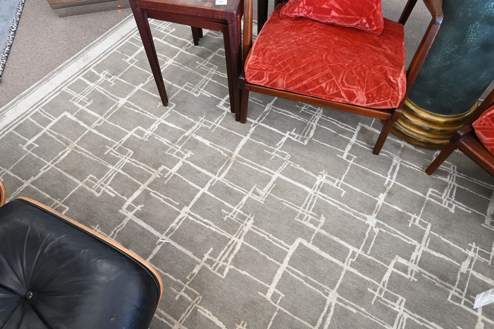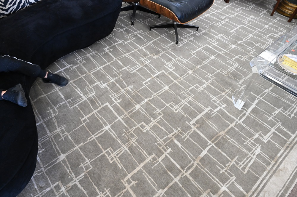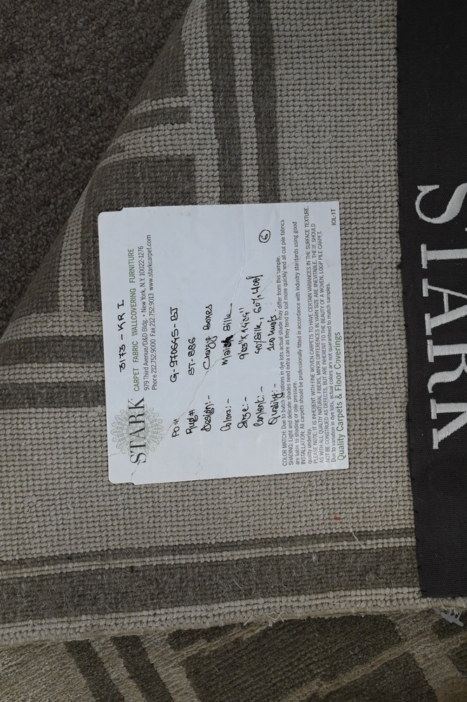 Lot 492: Stark Custom Made Silk Blend Carpet, in tan and grey abstract design, 9′ 1″ x 14′ 4″.