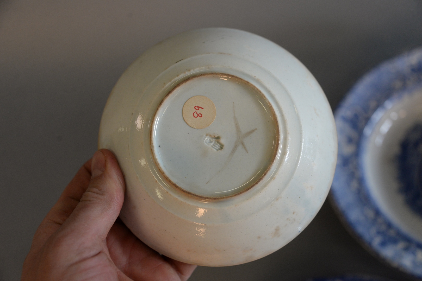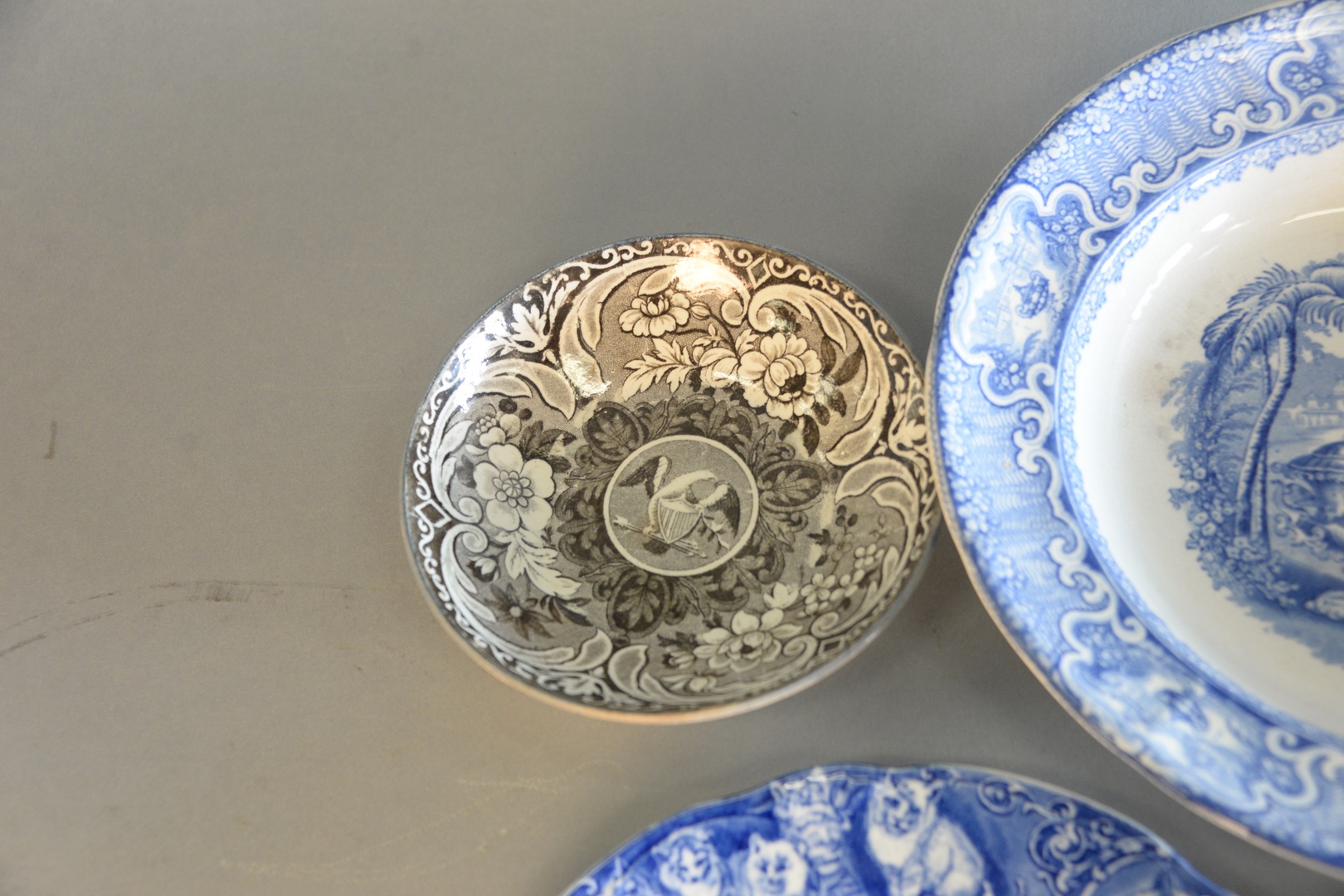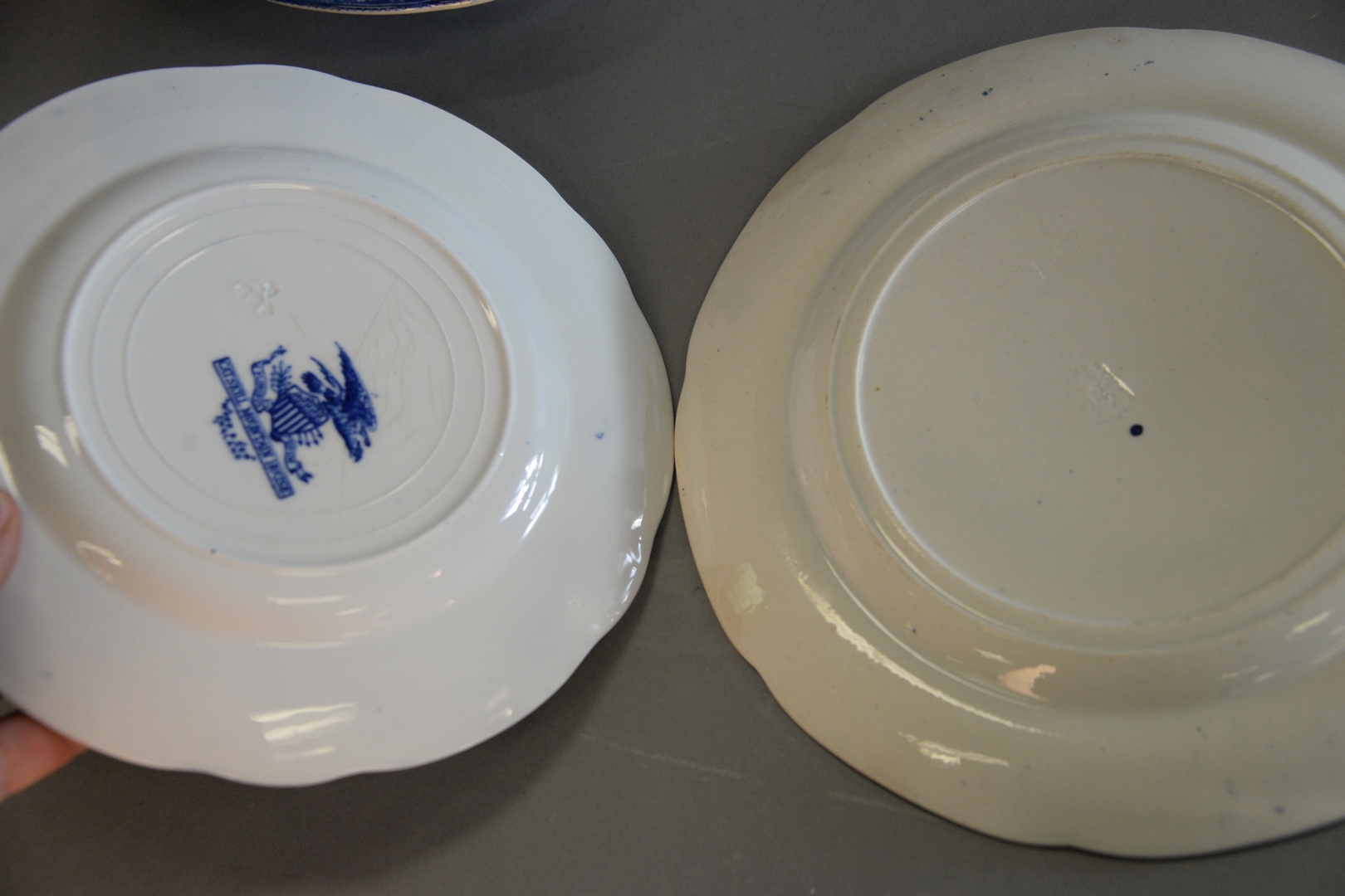 to include three Staffordshire, pieces each marked on the underside, along with one brown plate with an eagle and shield in the center