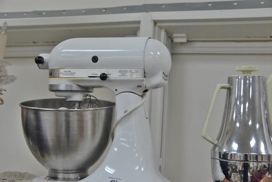 Group of Mid-Century kitchen items to include two Alfi carafes, enameled juicer, Thermos chromecraft ice bucket, pink Ericofon, red lacquer items, and Kitchenaid Hobard K4555 with attachments.
