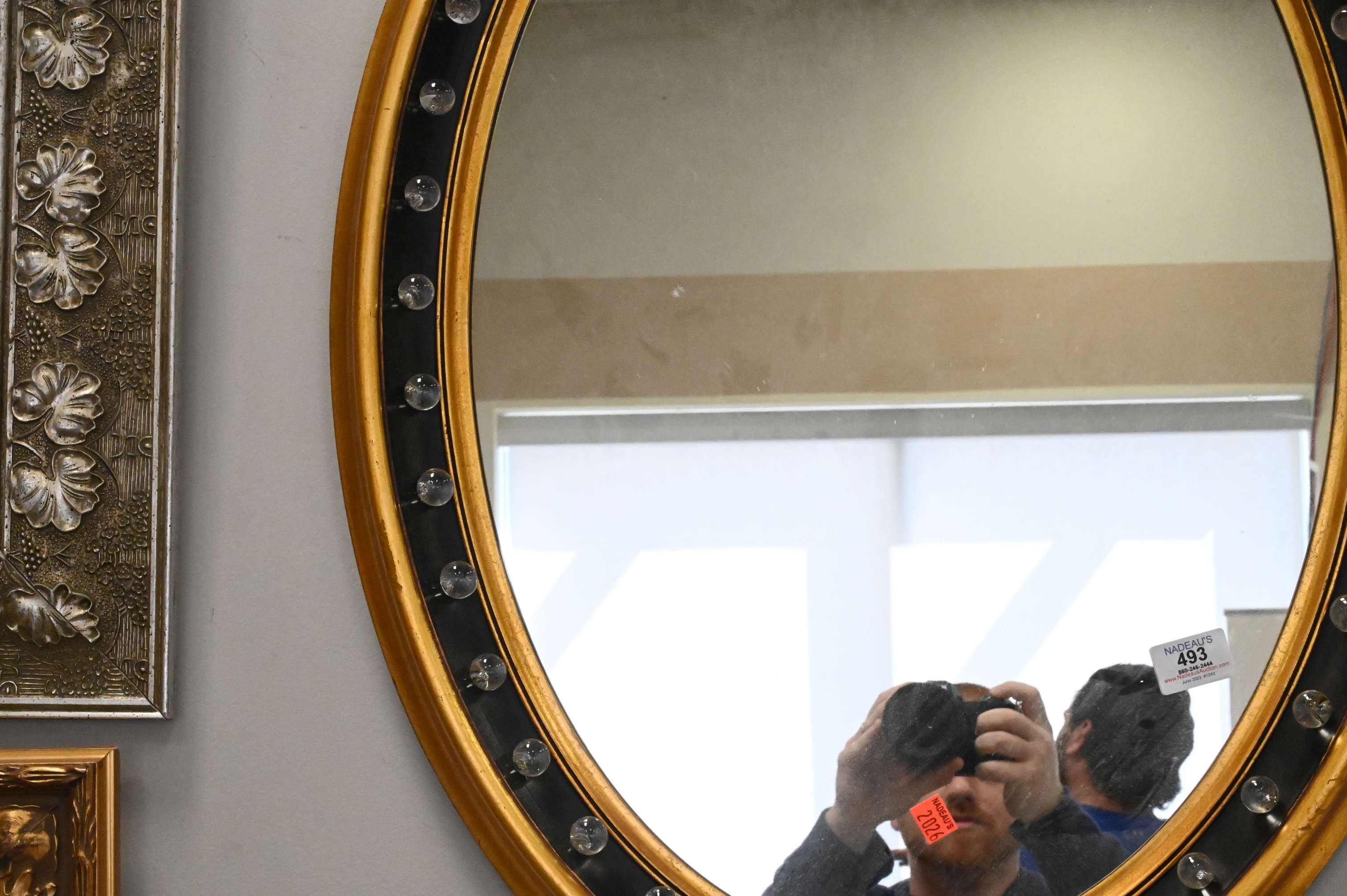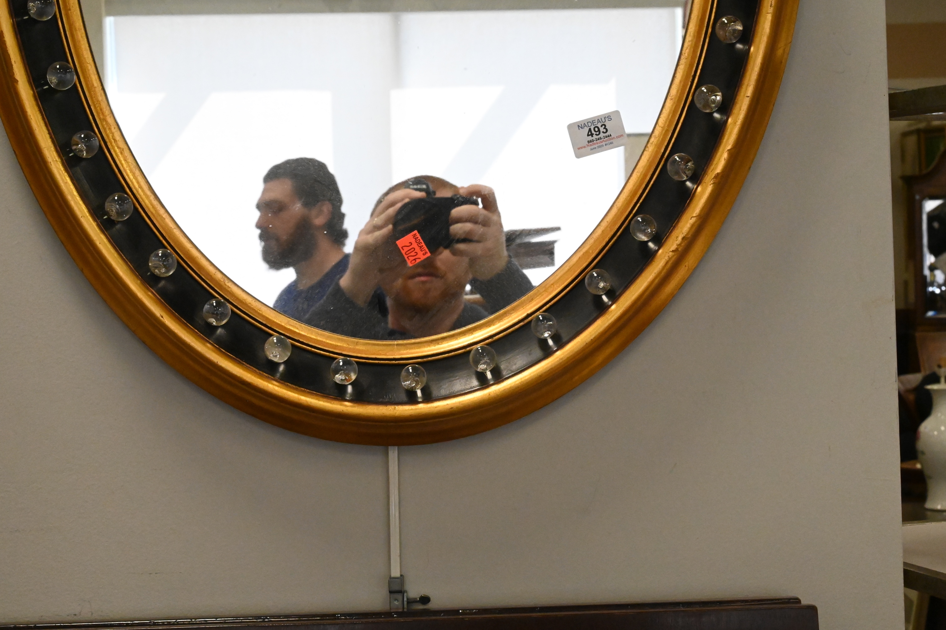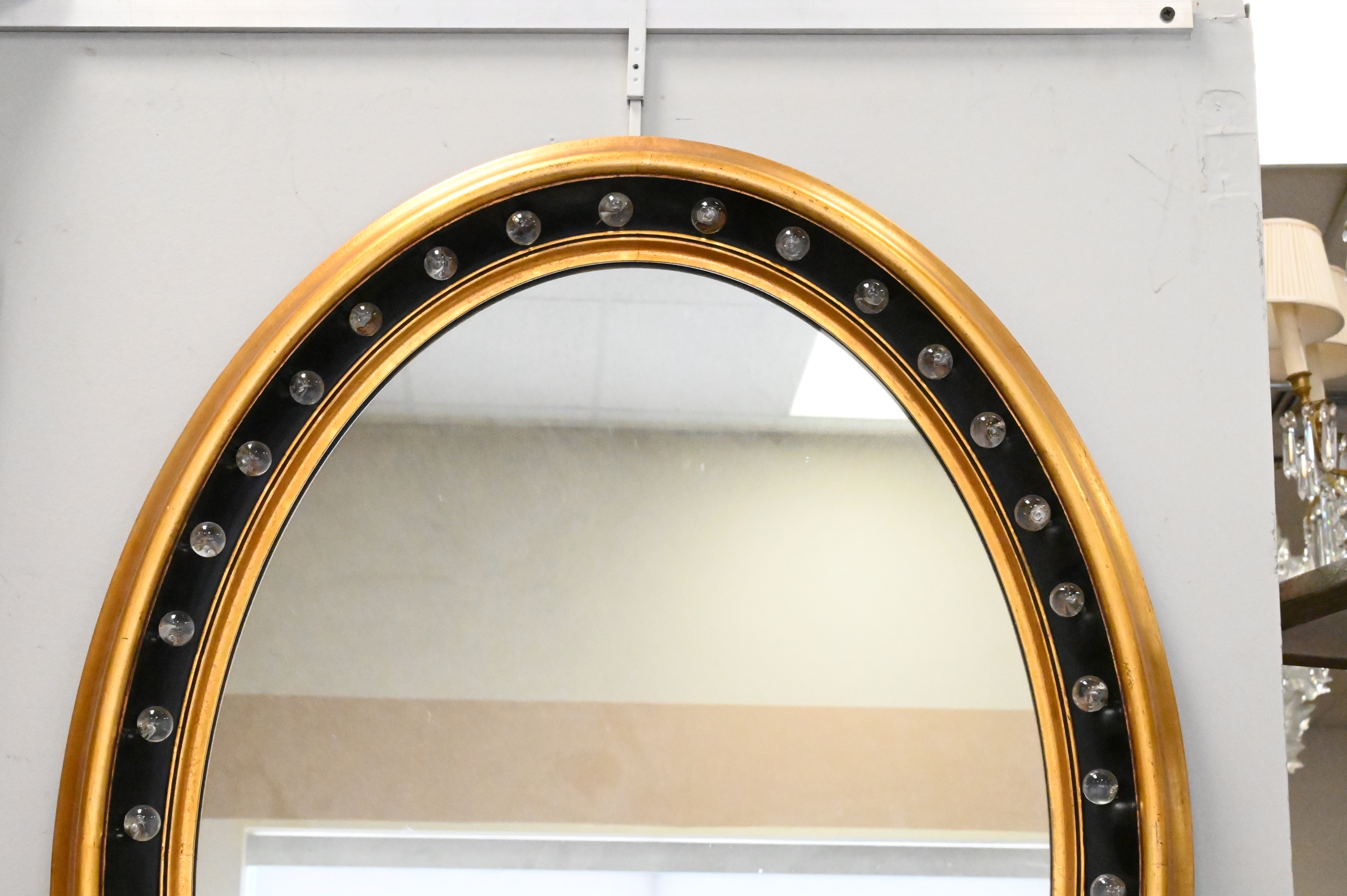 Irish or Welsh Oval Mirror, mouled parcel gilded and ebonized frame, having glass balls, 30″ x 24″