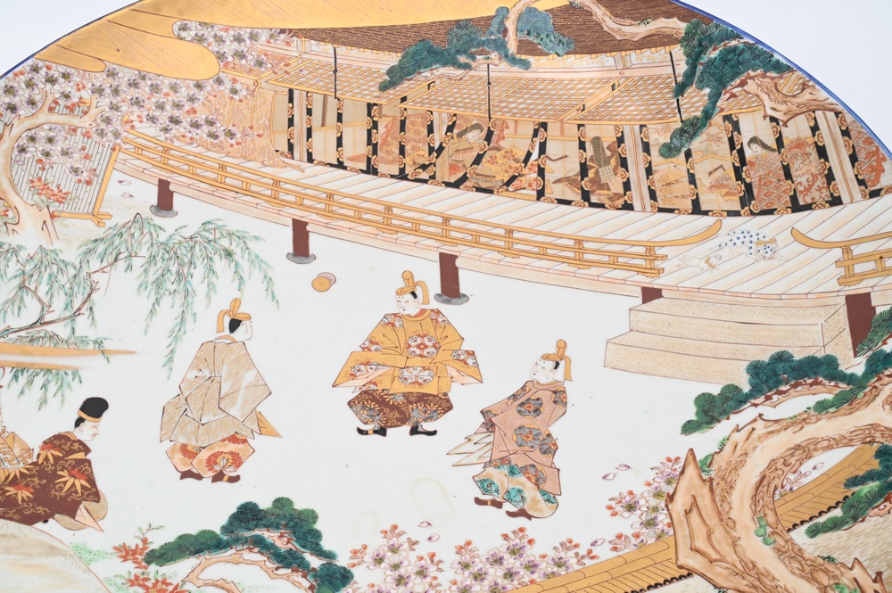 Large Chinese Porcelain Charger, having painted figures in a courtyard with scrolling pine trees; diameter 24 1/2 inches. Provenance: Waterfront Estate, Stamford, Connecticut.