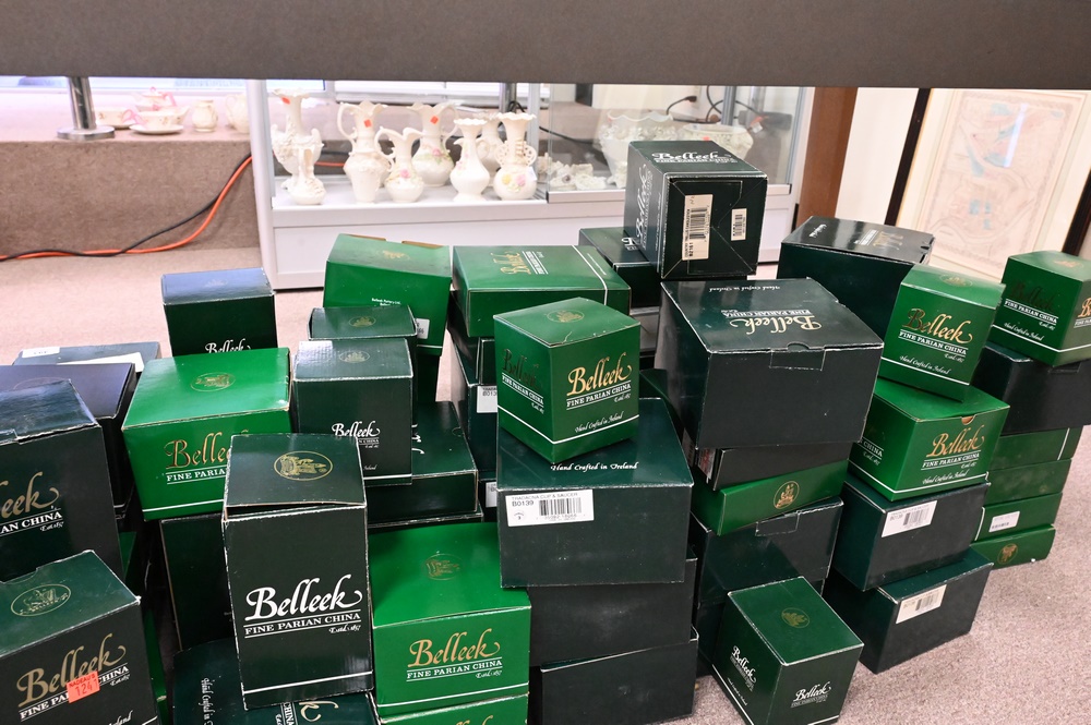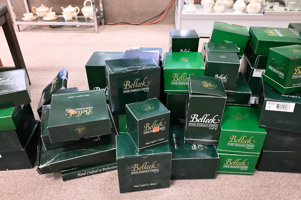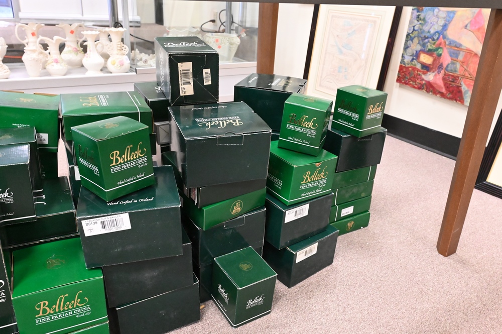 Lot 493: Large Group of Belleek, in boxes, approximately 60 pieces to include cups, saucers, plates, vases, etc. Provenance: Collections of Norma Reilly, New Jersey.