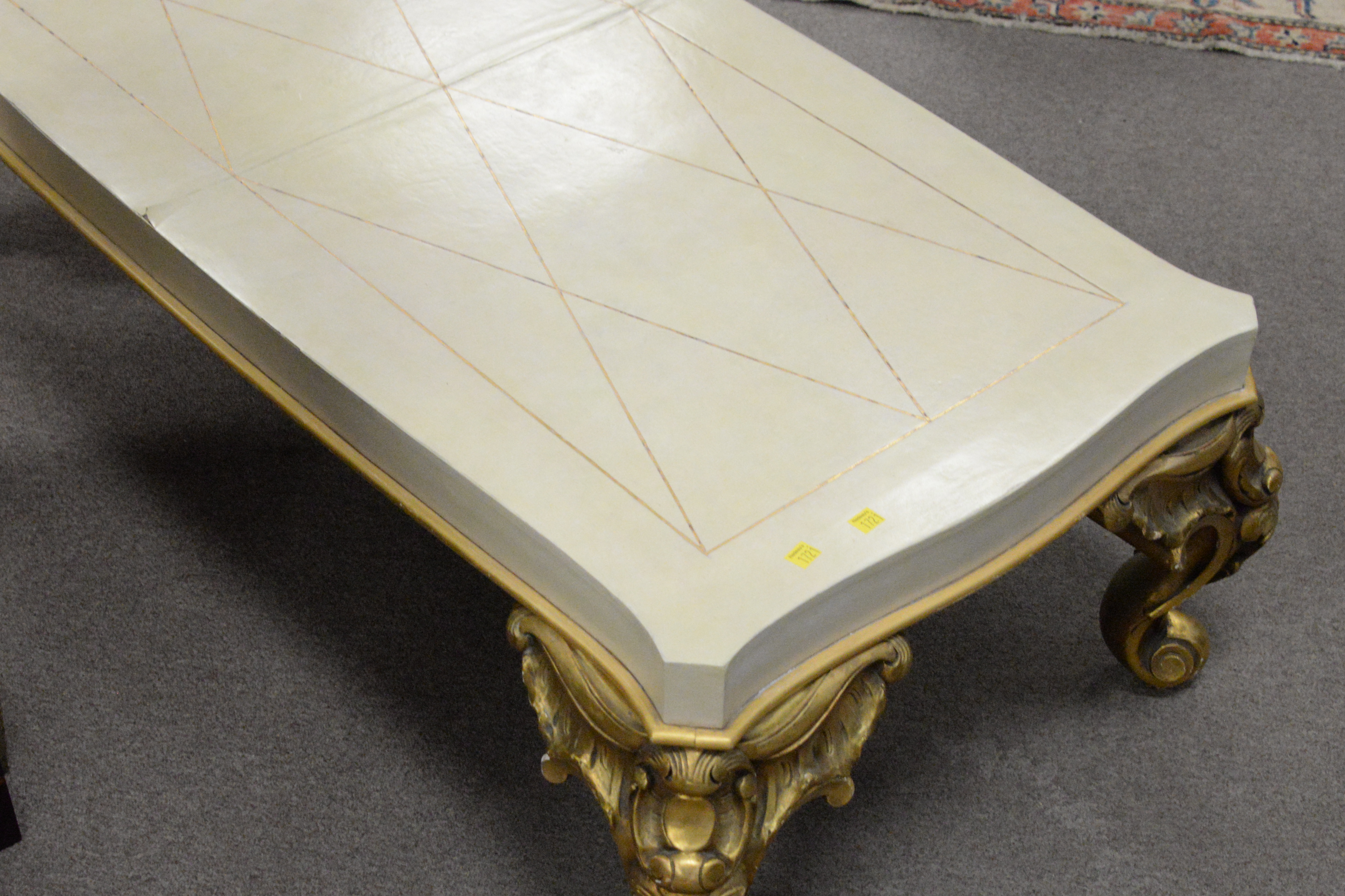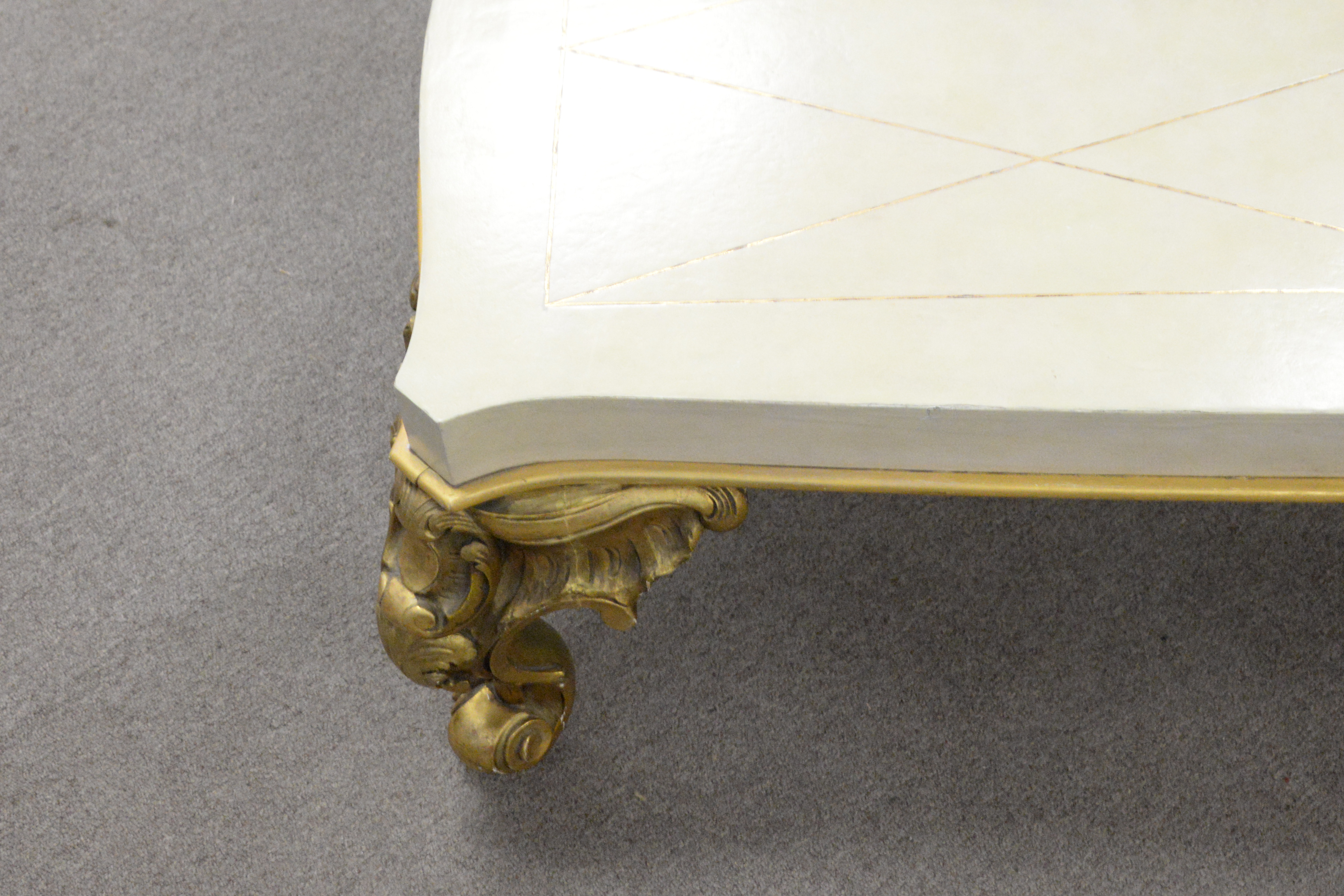 Leather Topped Baroque Style Coffee Table, with gilt carved legs, having slight lifting on one corner, height 15 inches, top 22 1/2″ x 49″