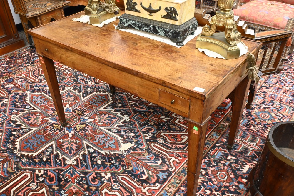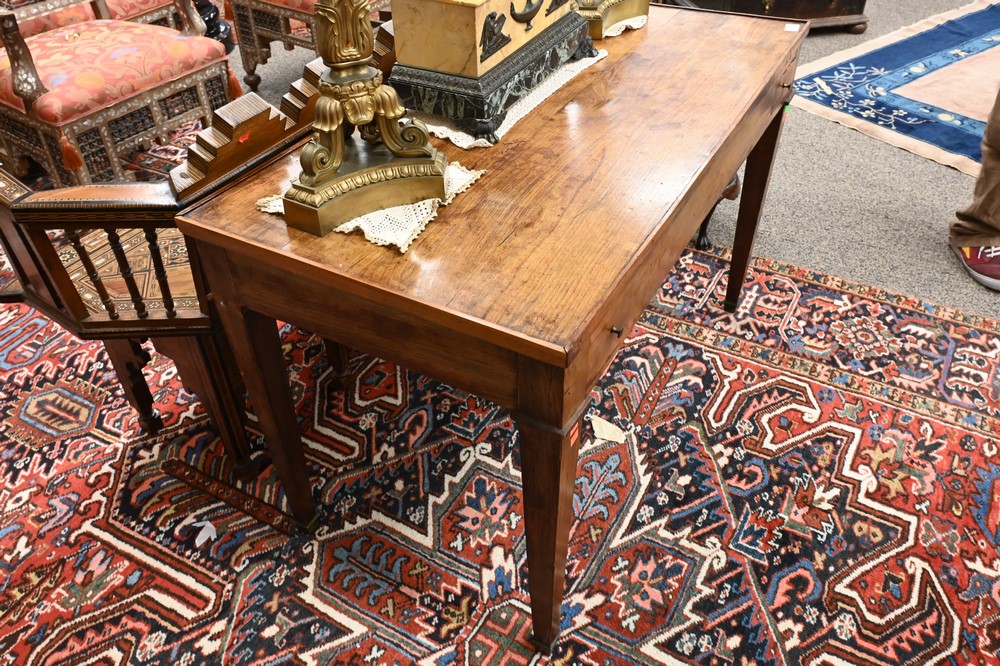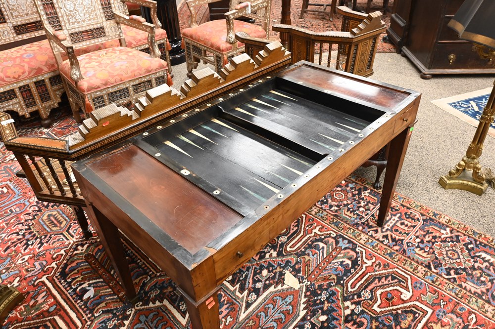 Lot 493: Louis XVI Style Fruitwood Backgammon Table, having removable rectangular top with green baize interior, bone inlaid backgammon board…