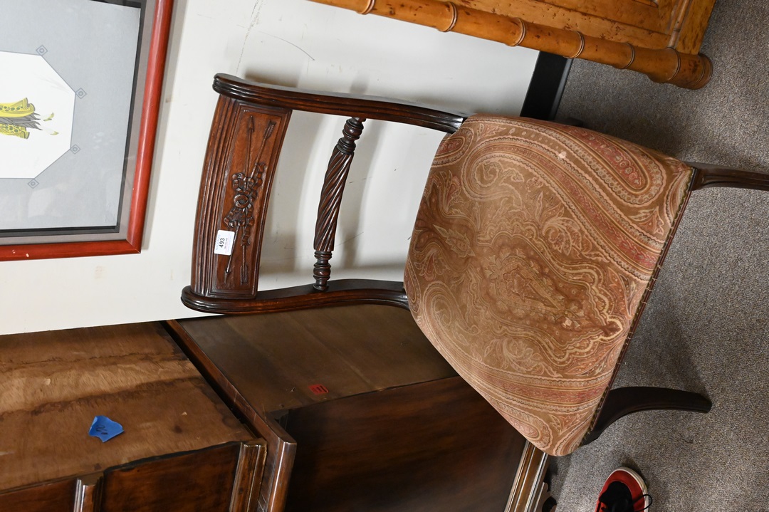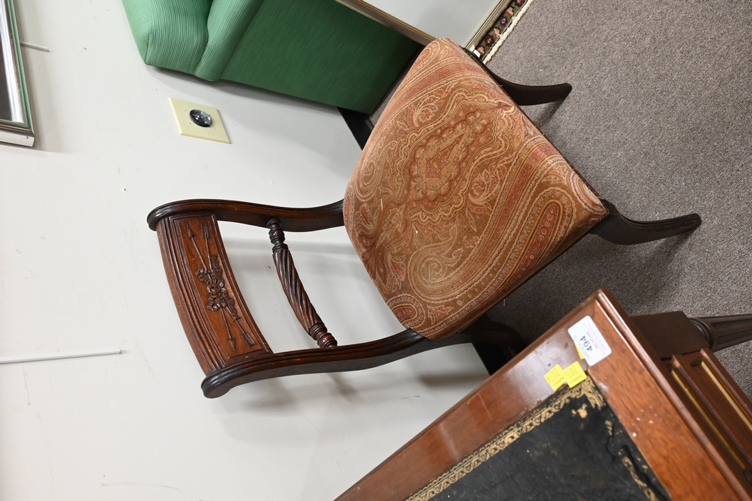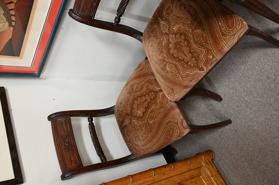Set of Four Duncan Phyfe Mahogany Side Chairs, having arrow carved backs and upholstered seats, height 33 inches.