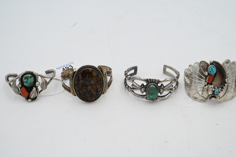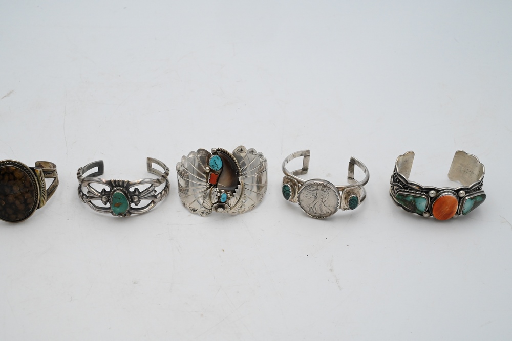 Lot 493: Six Silver Bracelets all mounted with stones, one having silver half dollar