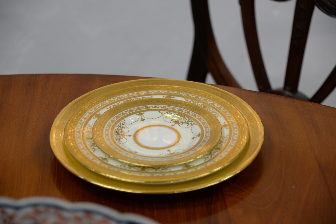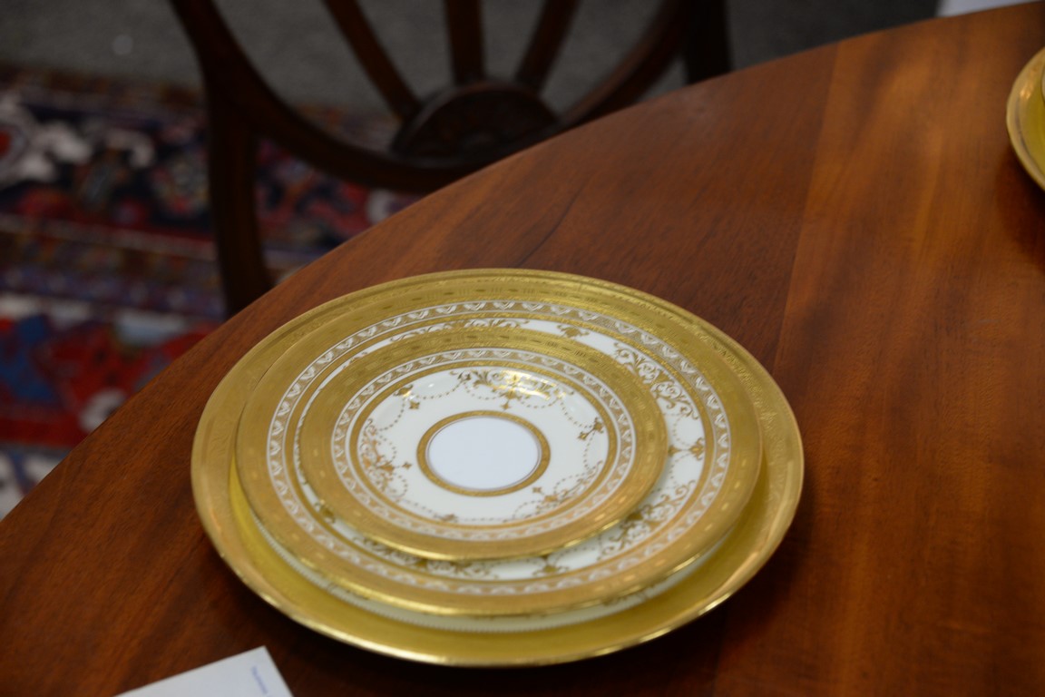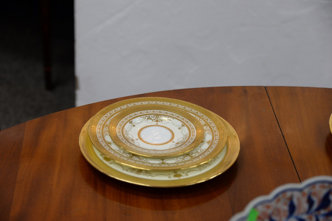 Lot 493: Thirty-five piece lot including three sets of Minton plates with heavy gilt borders including eleven dinner plates, twelve luncheon…