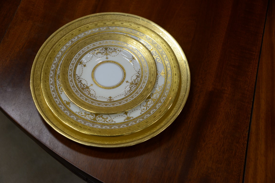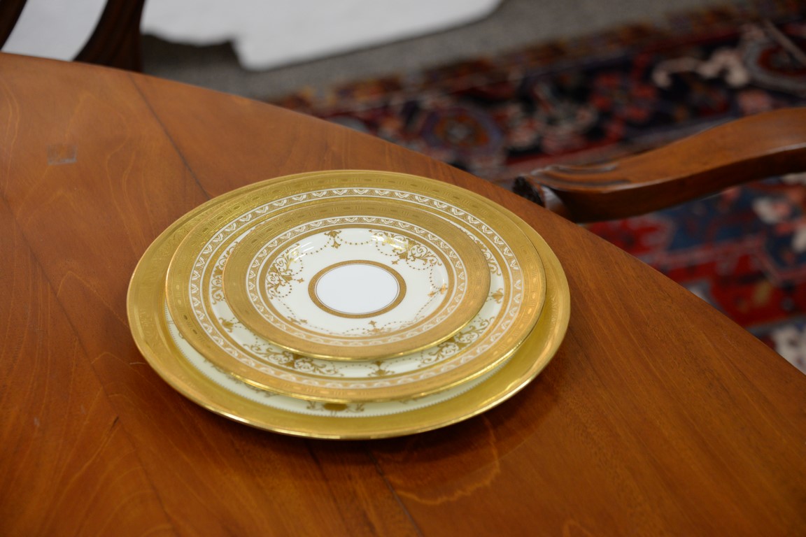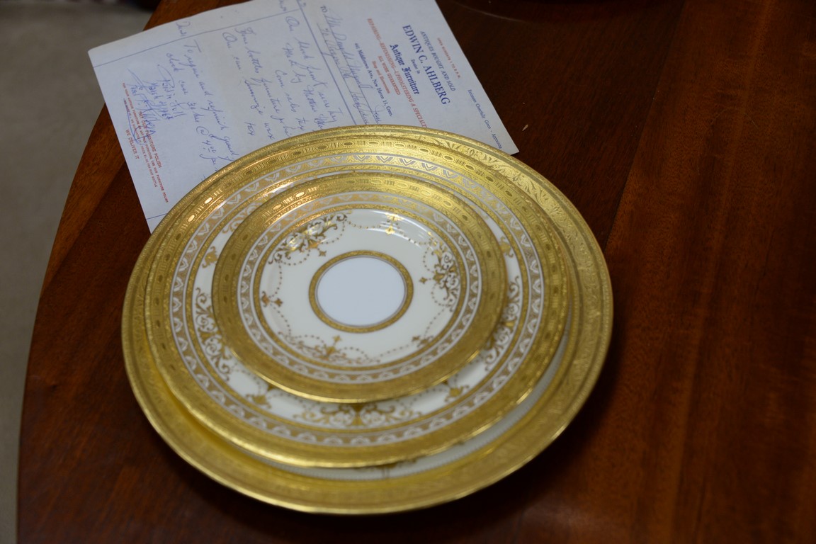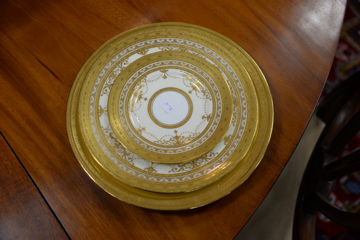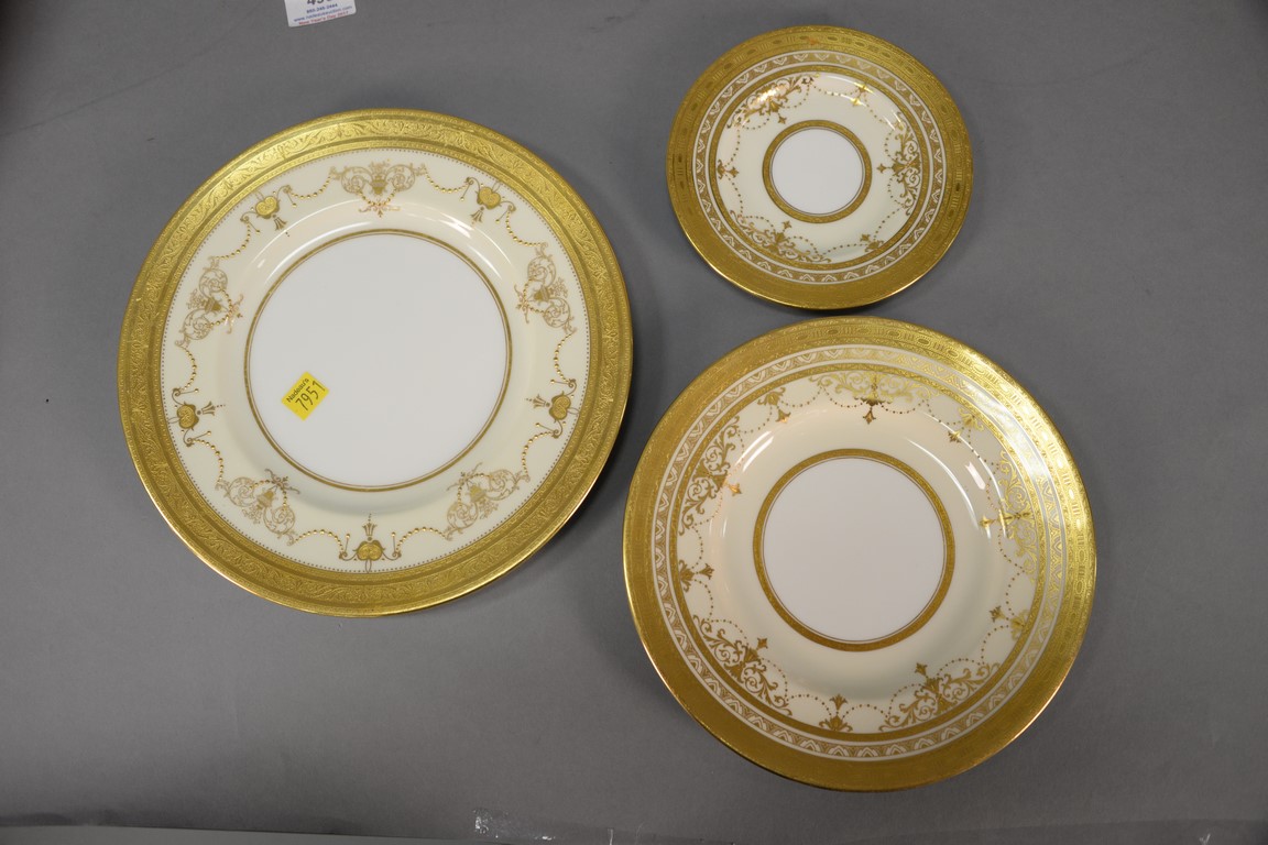 Thirty-five piece lot including three sets of Minton plates with heavy gilt borders including eleven dinner plates, twelve luncheon plates, and twelve saucers, all matching. dinner: dia. 10 1/4in. luncheon: dia. 8 3/4in.