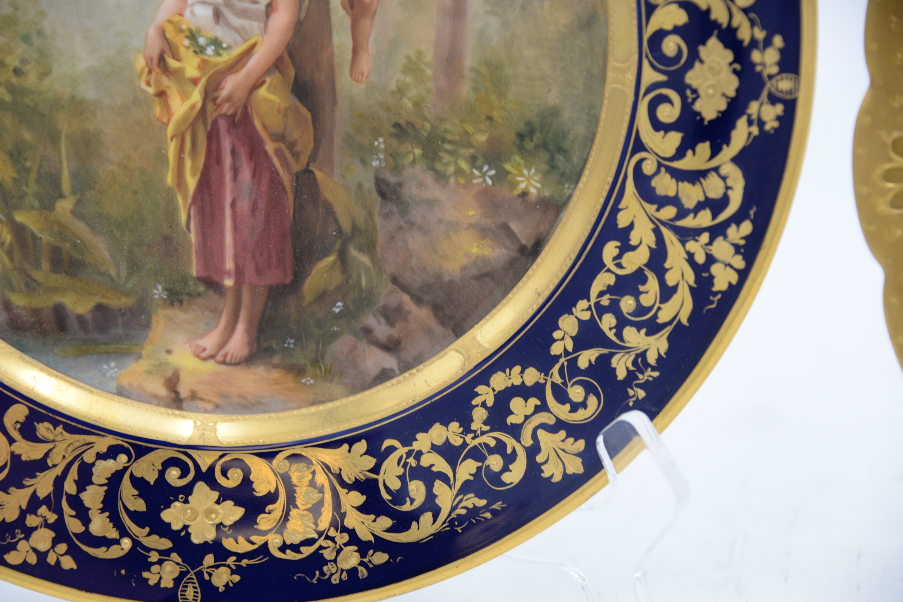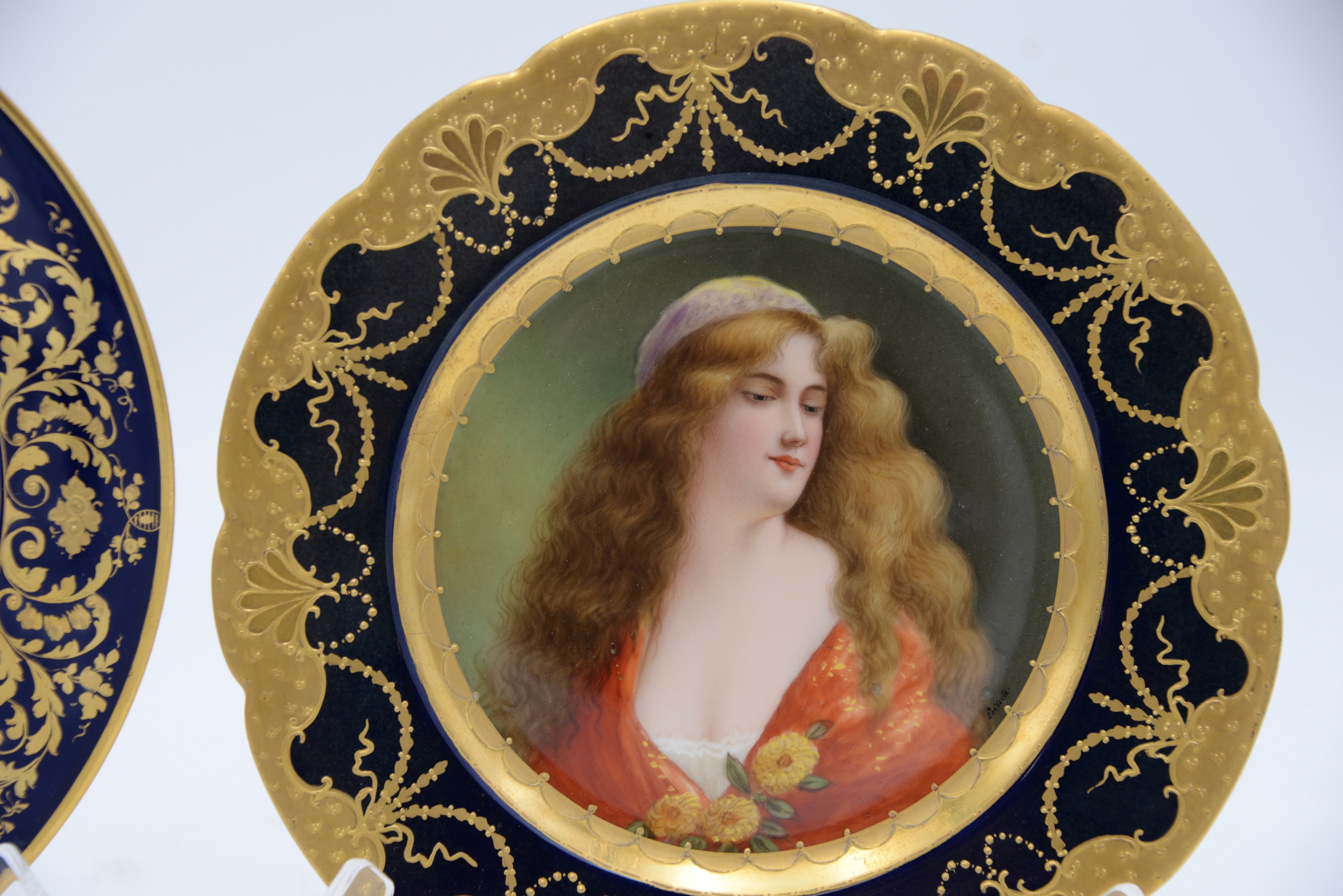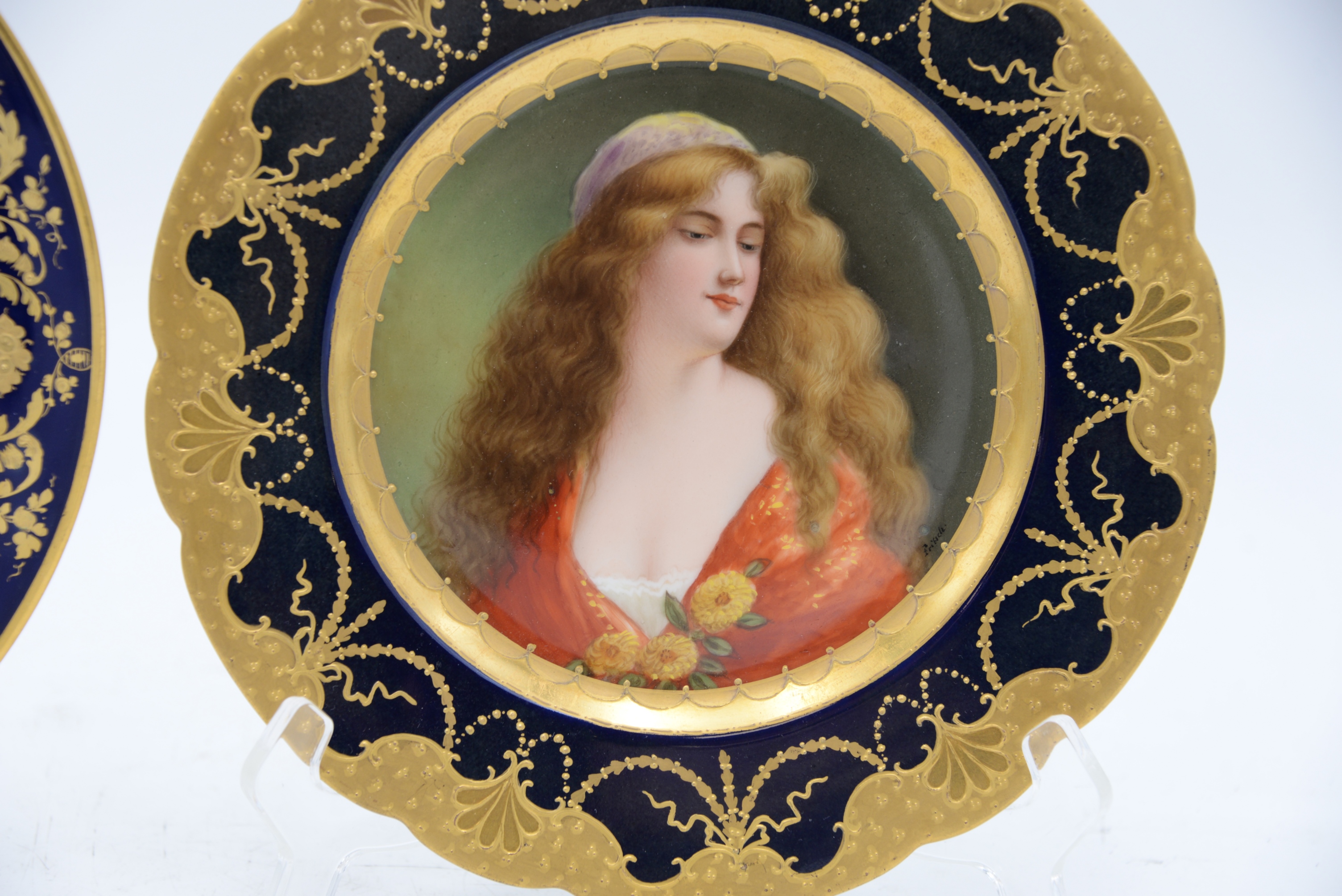 Two Royal Vienna Portrait Plates, to include “Delina” with high relief border, signed “Fritsch” lower right, stamped Royal Vienna, beehive on reverse, featuring a young blond woman with long flowing hair in an orange shawl, artist signed; along with a hand painted plate of a woman with cherub; diameter 9 inches; diameter 9 1/2 inches.