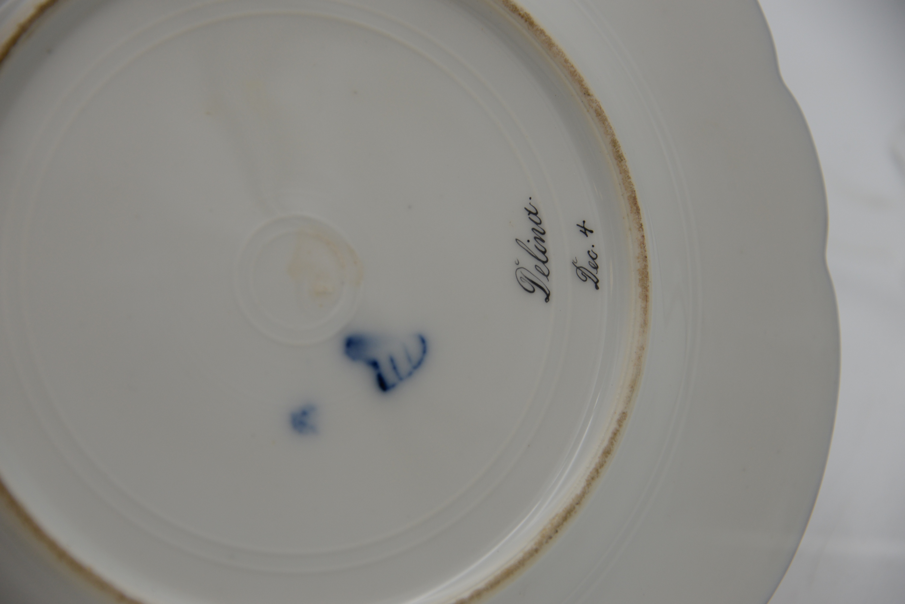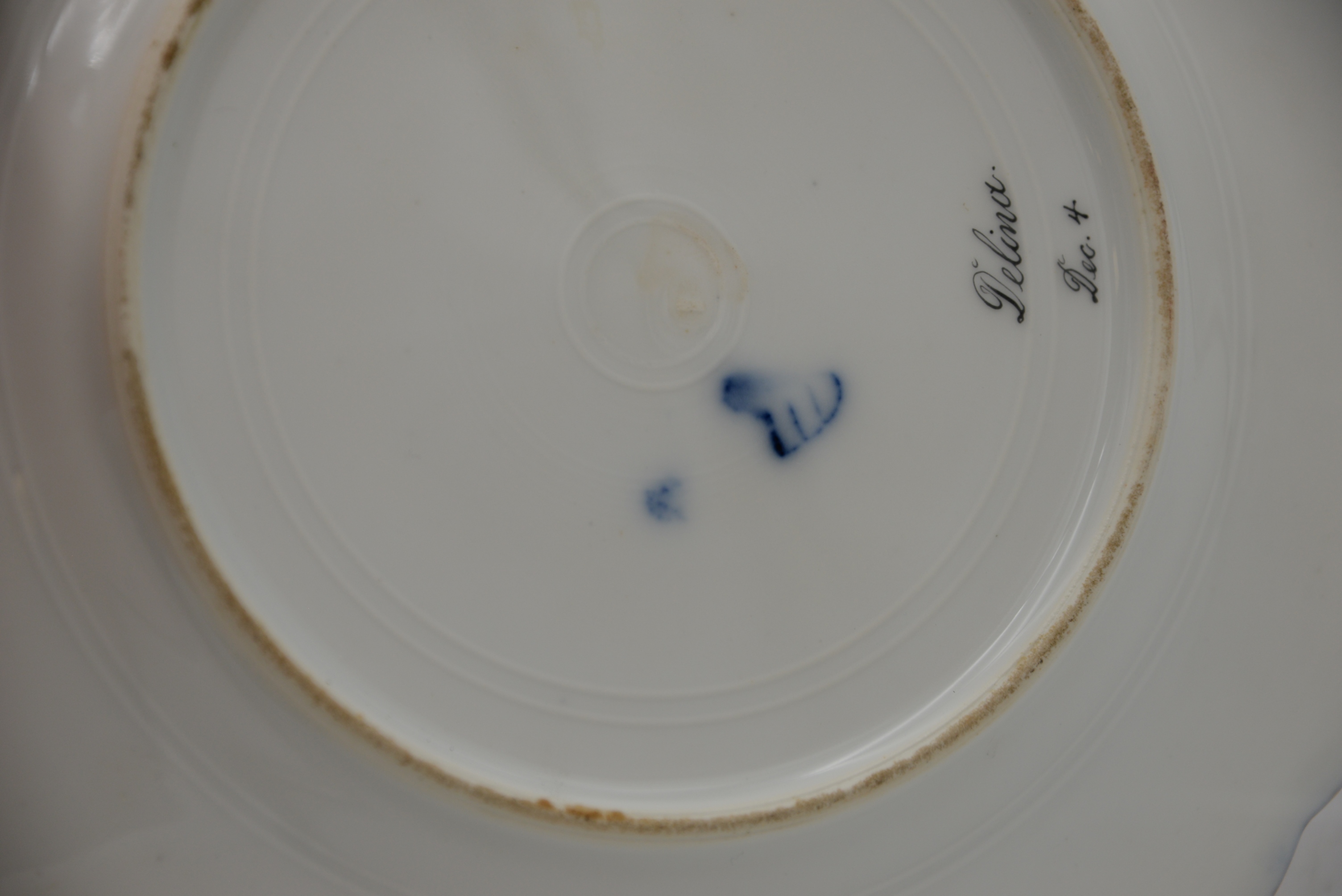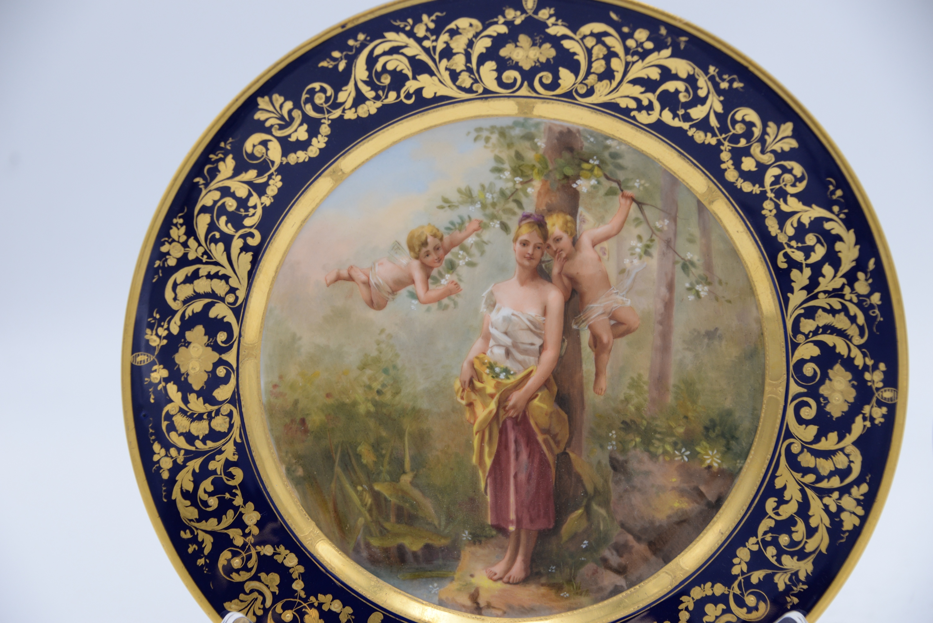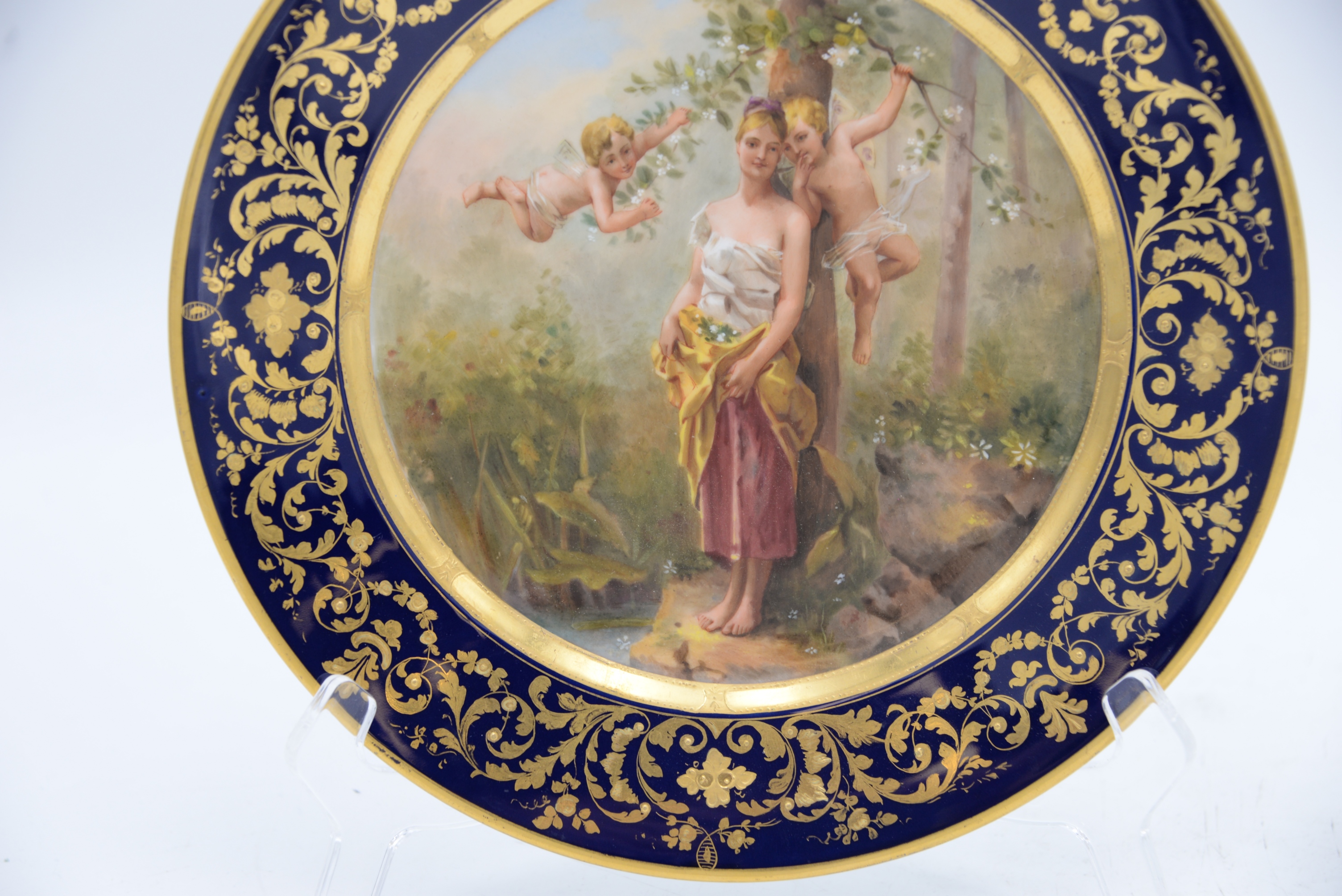 Two Royal Vienna Portrait Plates, to include “Delina” with high relief border, signed “Fritsch” lower right, stamped Royal Vienna, beehive on reverse, featuring a young blond woman with long flowing hair in an orange shawl, artist signed; along with a hand painted plate of a woman with cherub; diameter 9 inches; diameter 9 1/2 inches.