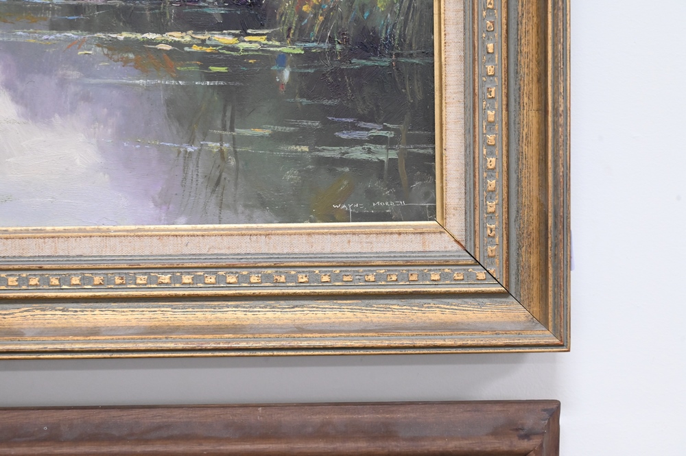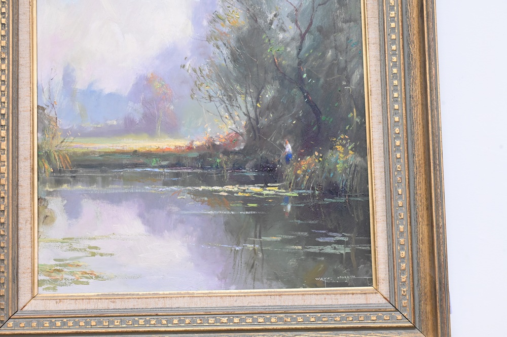 Lot 493: Wayne Beam Morrell (1923 – 2013), “Summer Mist”, fishing, oil on board, signed lower right Wayne Morrell, 20″ x 16″.