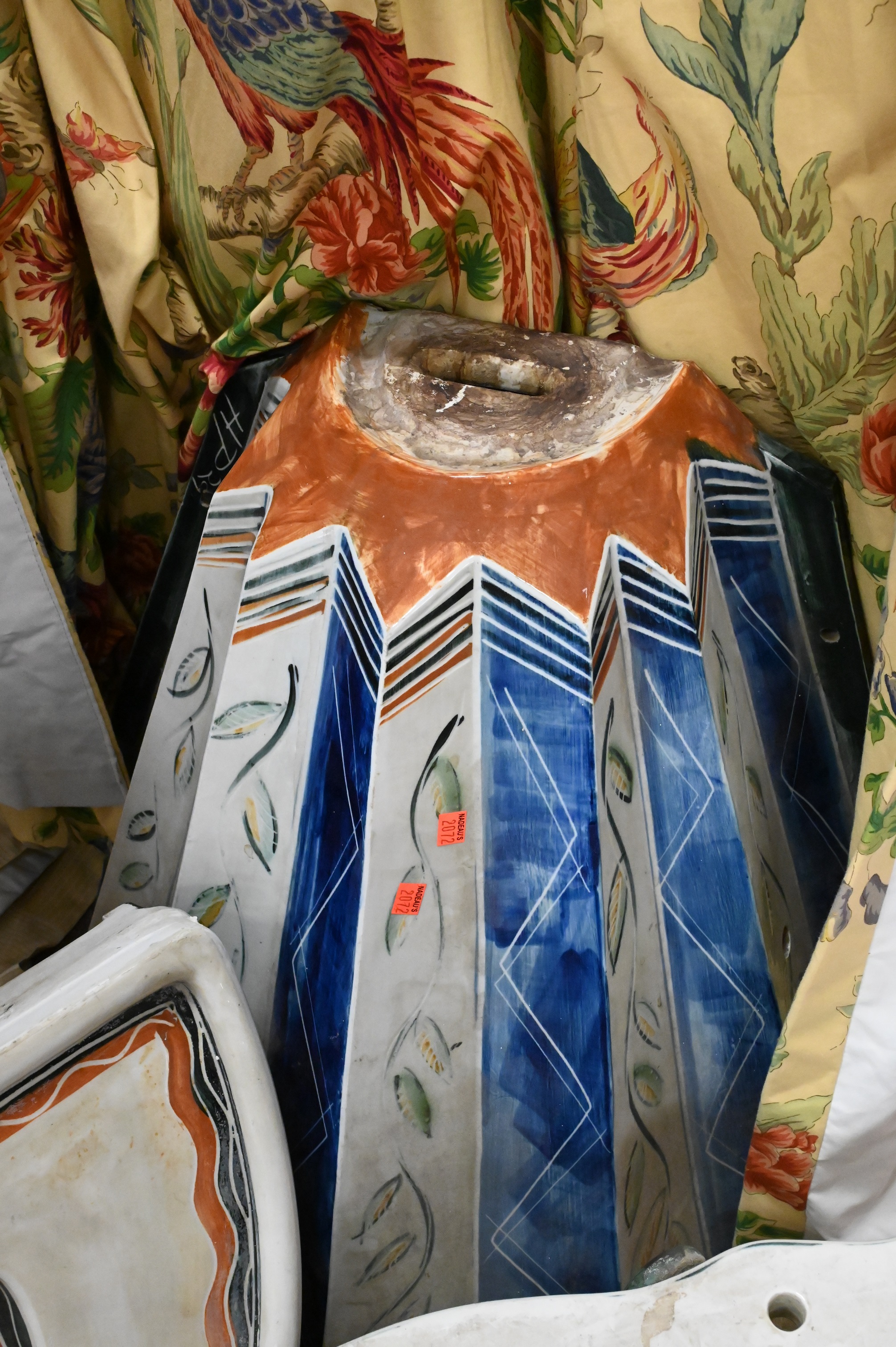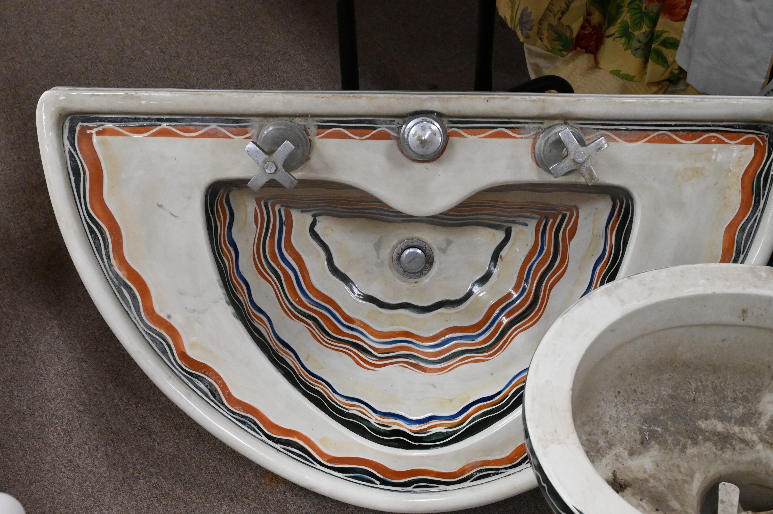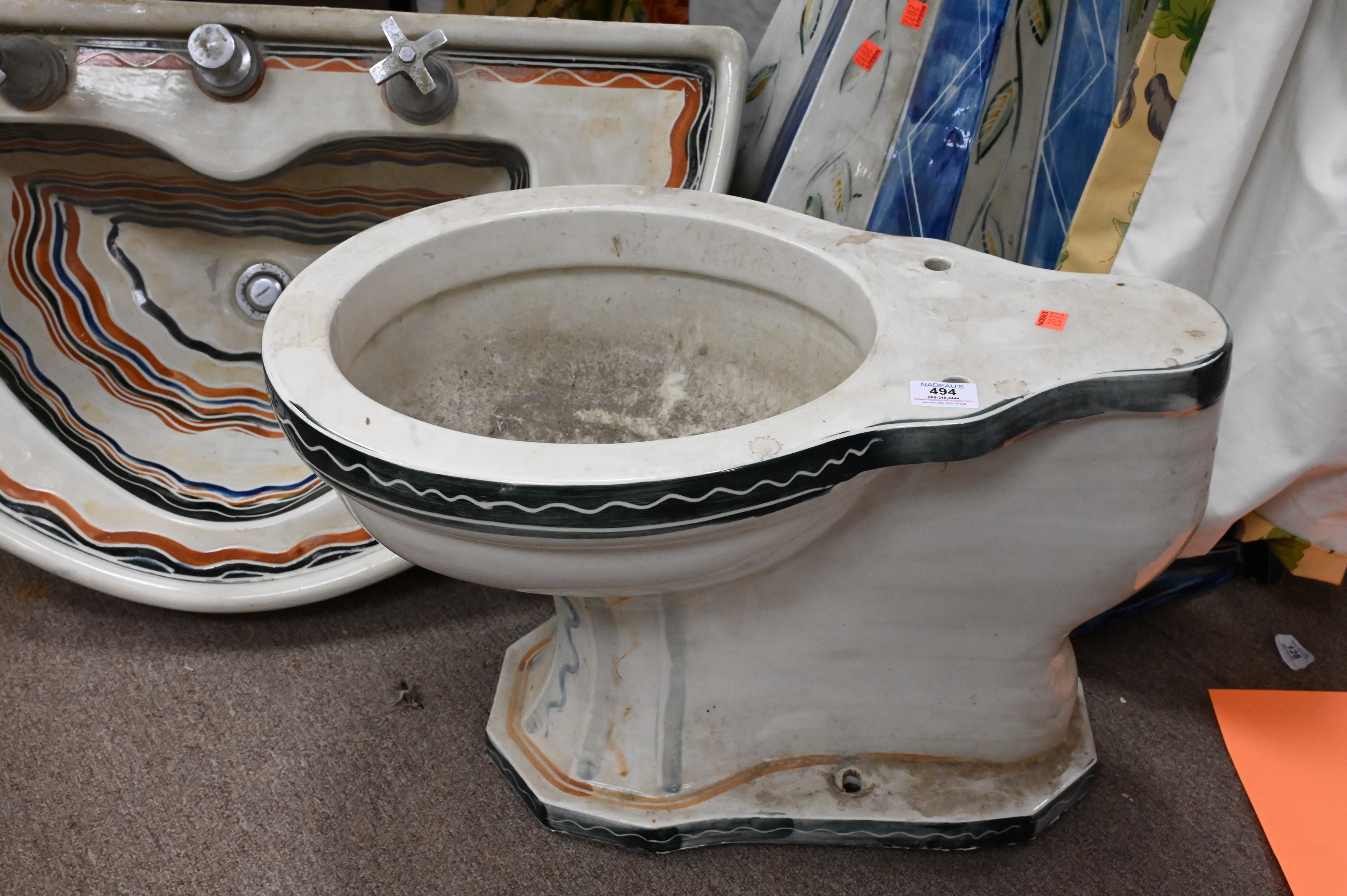 Custom Porcelain Pedestal Sink, Base and Toilet, having Southwest style decoration, one repair to bottom left of pedestal, sink depth 20 inches, width 34 inches. Provenance: Collection from Greenwich Connecticut