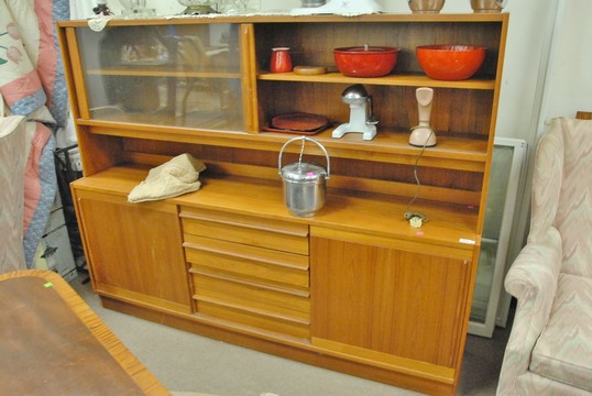 Danish hutch with two glass doors, ht. 58in., lg. 74in., dp. 16in.