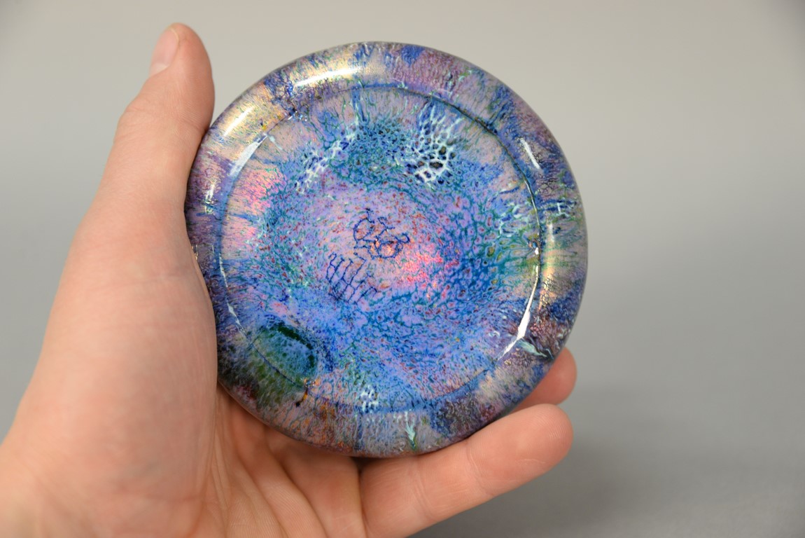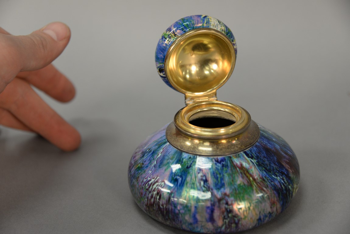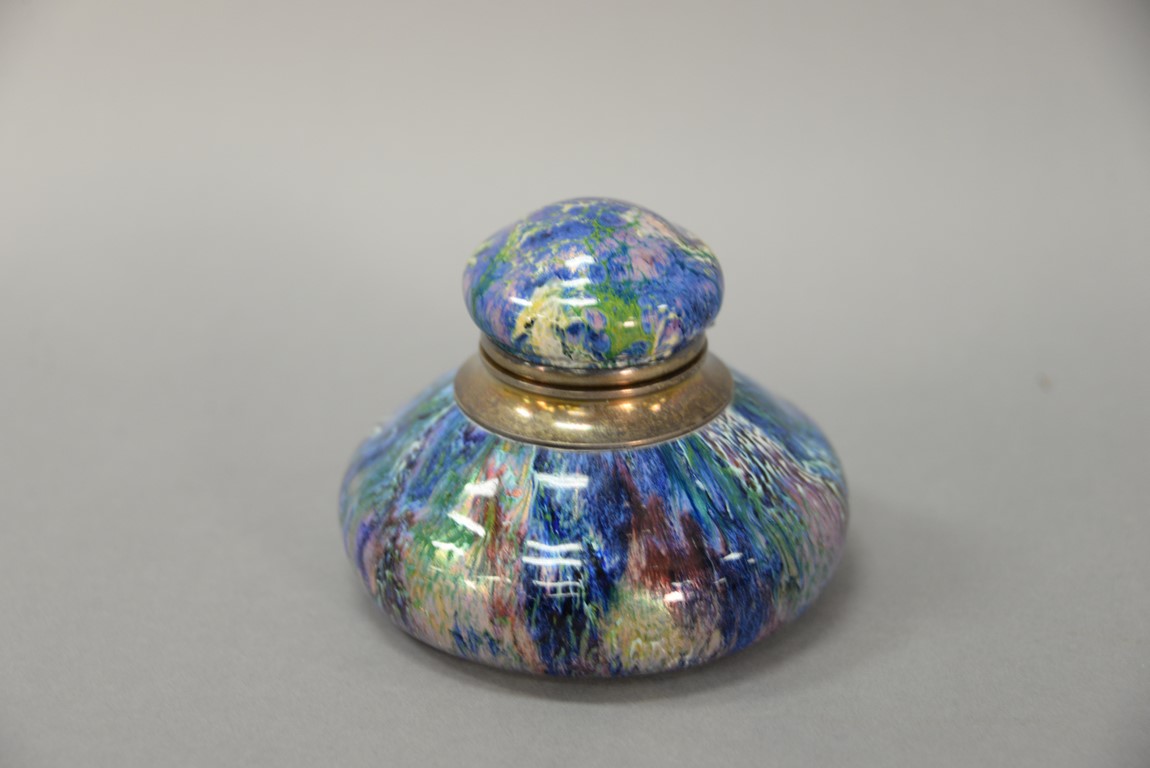 Enameled sterling silver inkwell signed indistinctly on bottom. ht. 3 1/4 in. dia. 4 in.