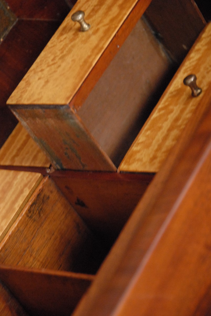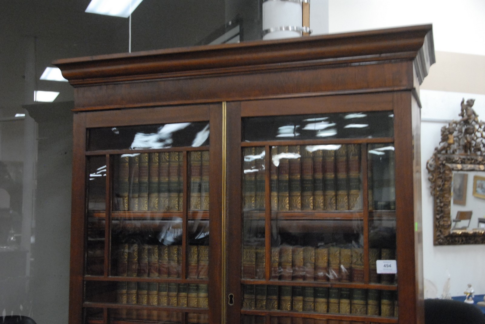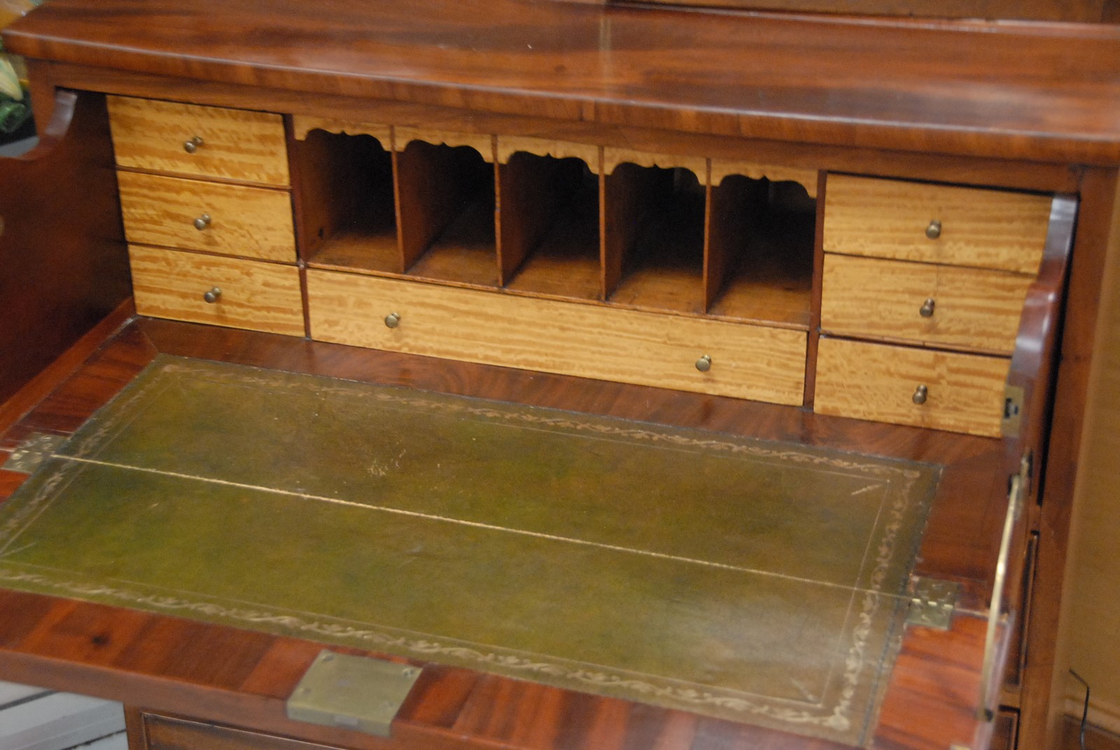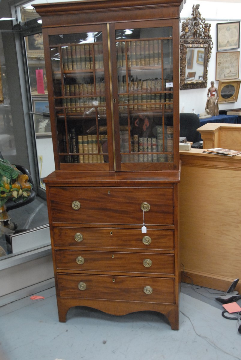 Lot 494: George IV mahogany sectional desk in two parts, upper section with two glass doors over pull-out desk compartment over three drawers. ht. 78 in. wd. 31 1/4 in. dp 19 in.