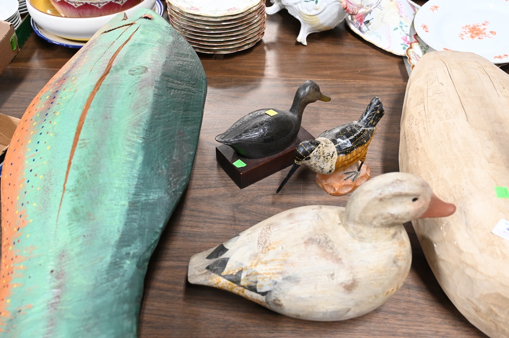Lot 494: Group of Carved and painted Wood Decoys, to include a large carved wood swan with glass eyes, unsigned, after Richard Connolly; three duck decoys; along with a large painted fish with glass eyes.