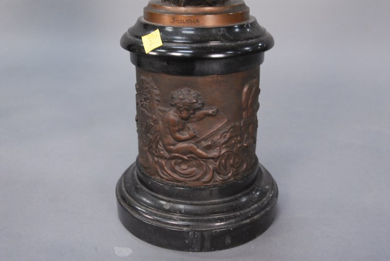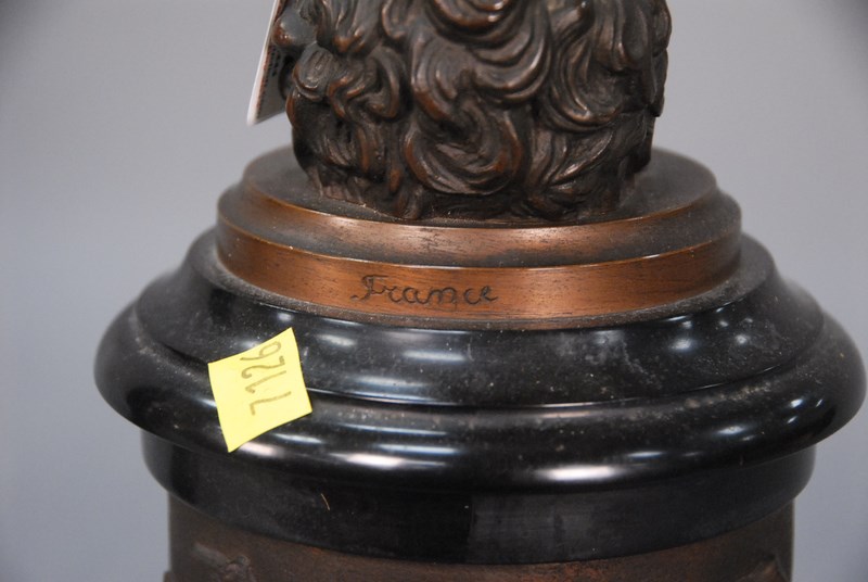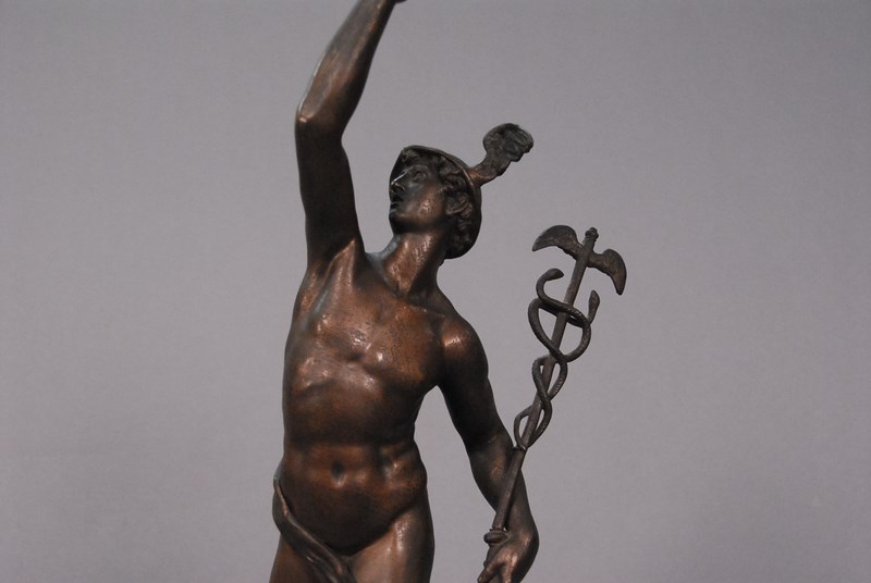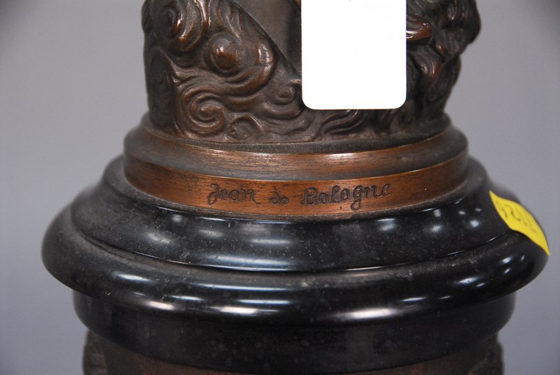 Lot 494: Jean de Bolagne bronze sculpture MERCURY MAN having onyx and bronze band on base, signed Jean de Bolange France. ht. 33 1/2in.