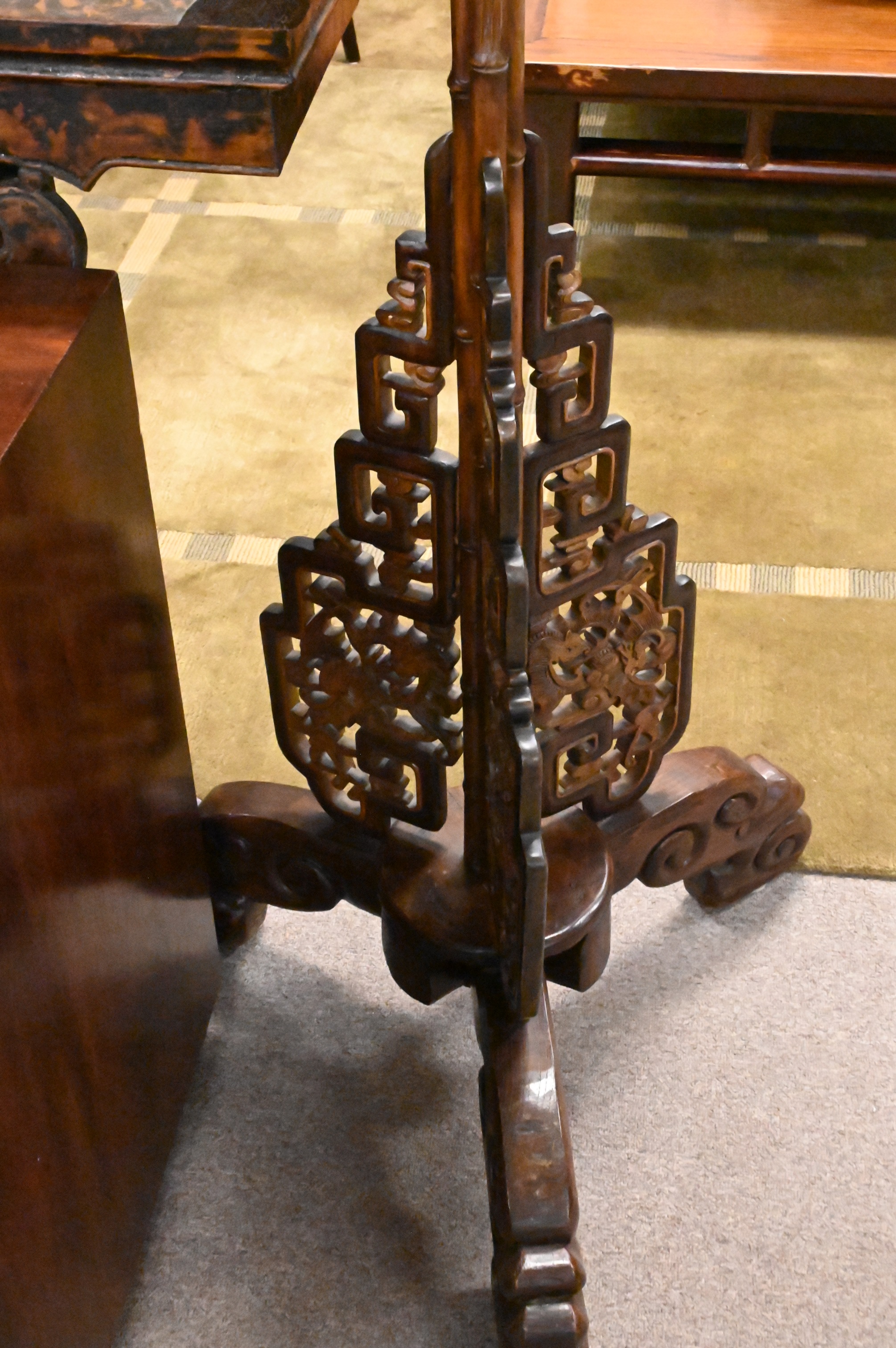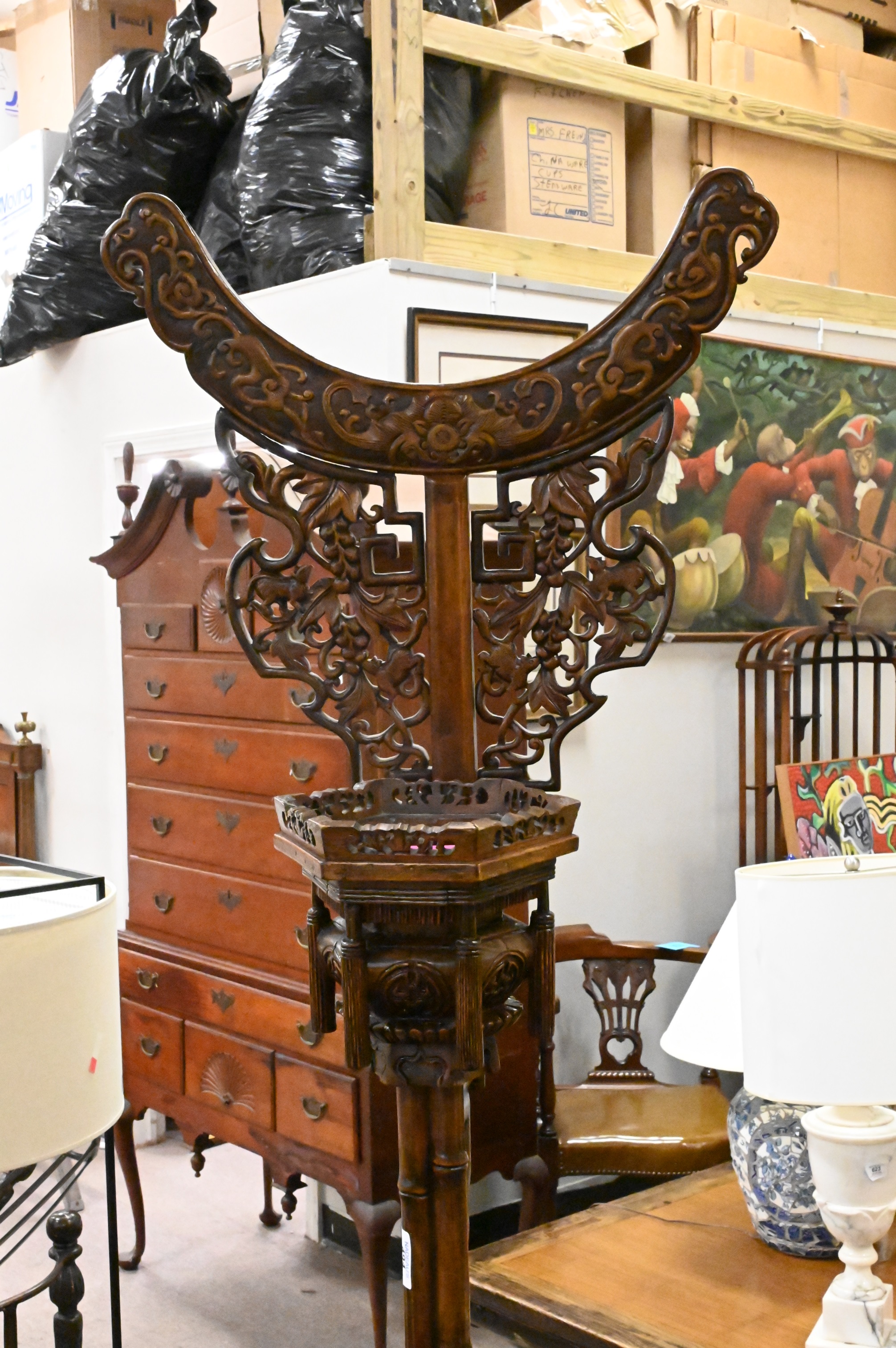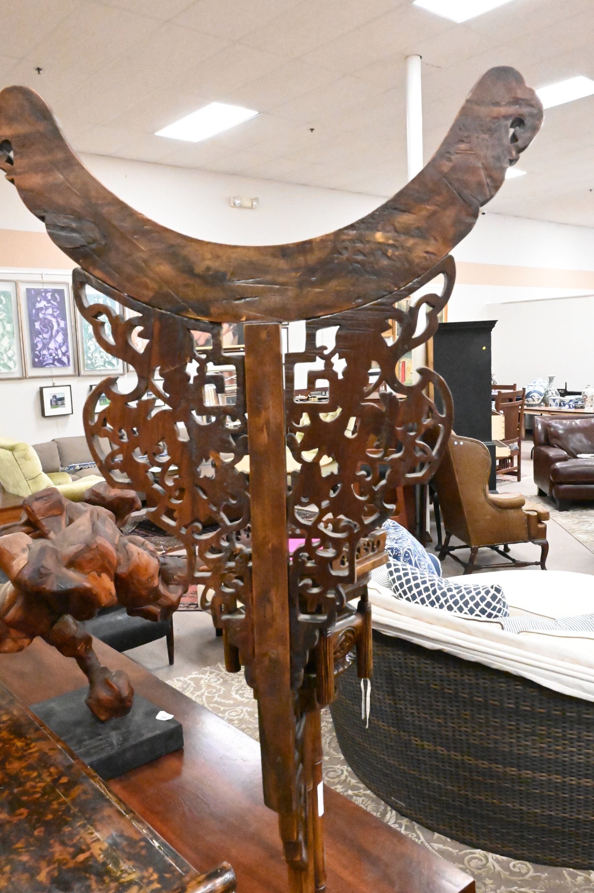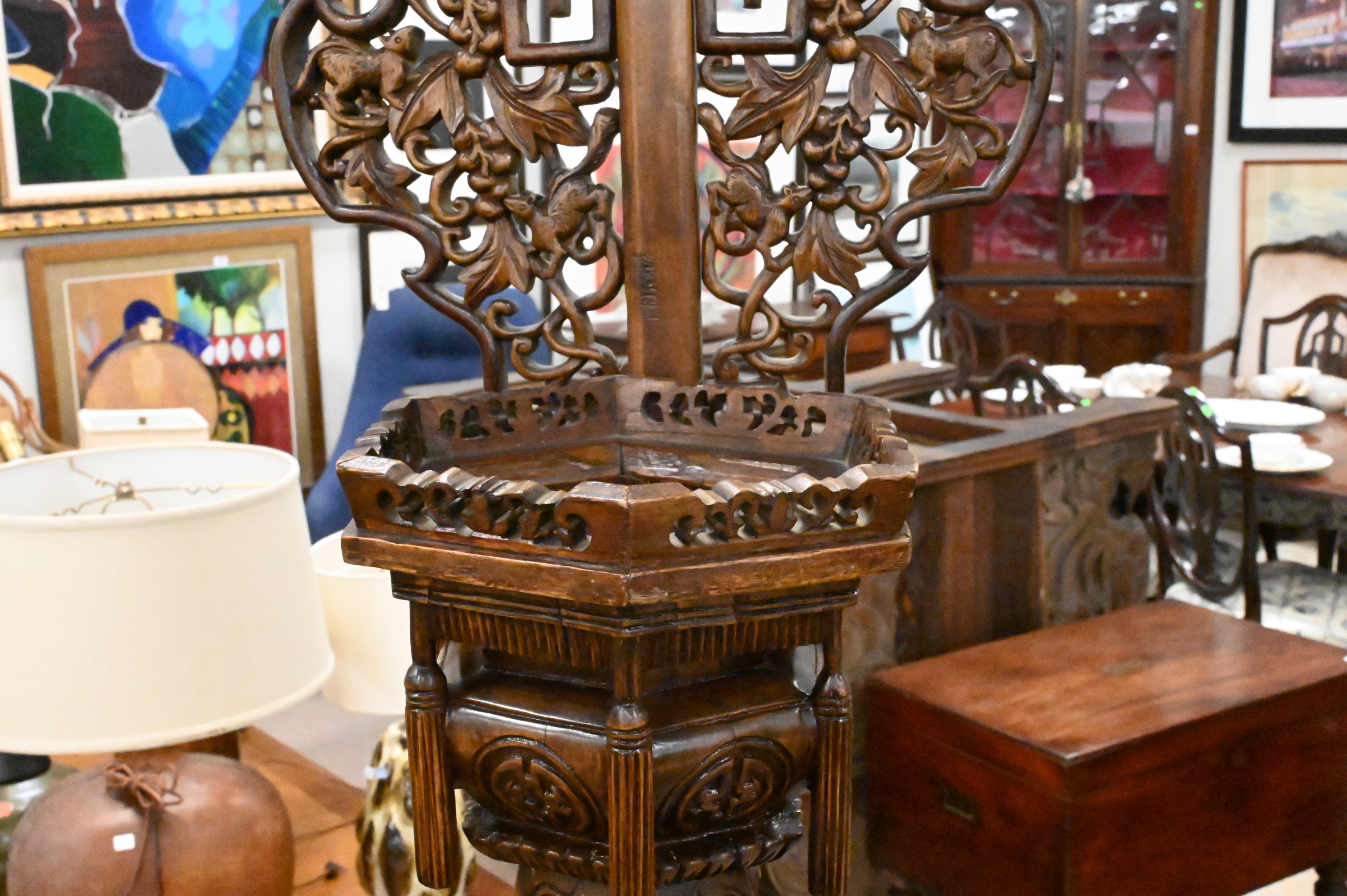 Pair of Carved Chinese Ceremonial Candle Holders, with top having carved dragon, animal and fruit motiff, height 77 inches.
