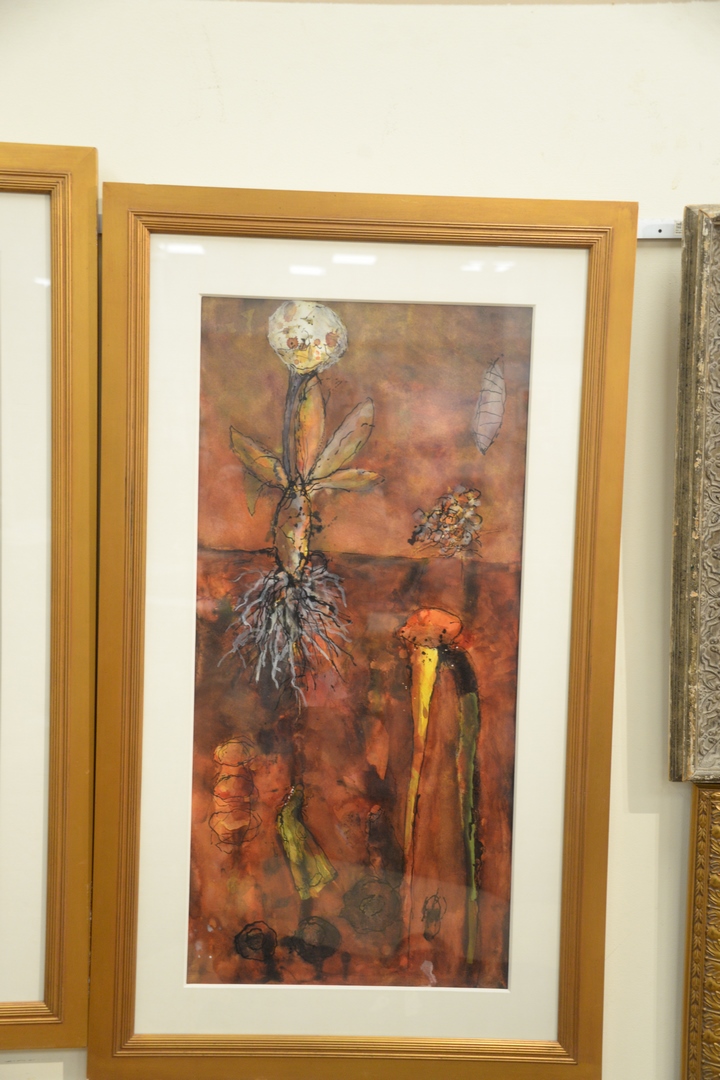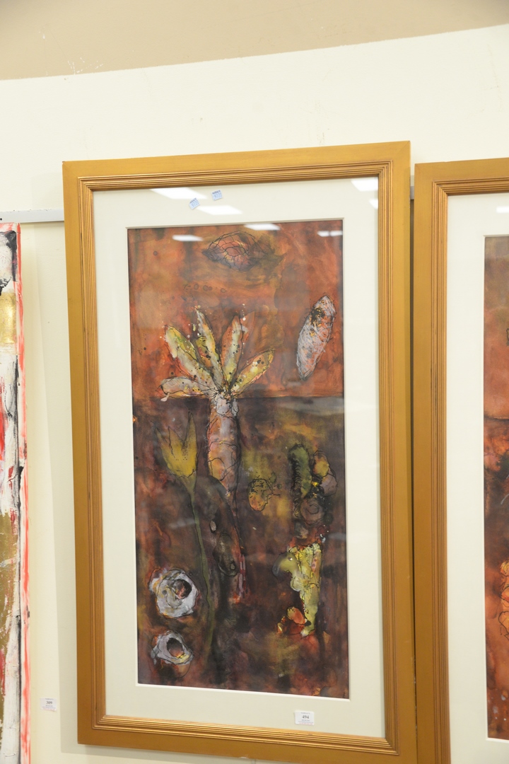 Lot 494: Pair of Modernist Still Lives, each watercolor on paper, neither signed, in matching frames, 37″ x 17 1/2″ (sight).