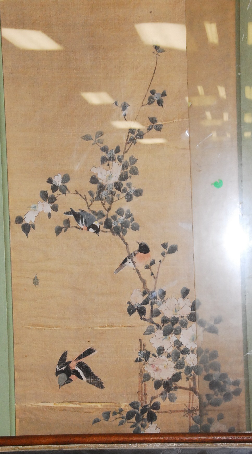 Lot 494: Two framed Oriental watercolors watercolor on paper of courtyard scene 19 x 39 and watercolor on silk as is 56 x 18.