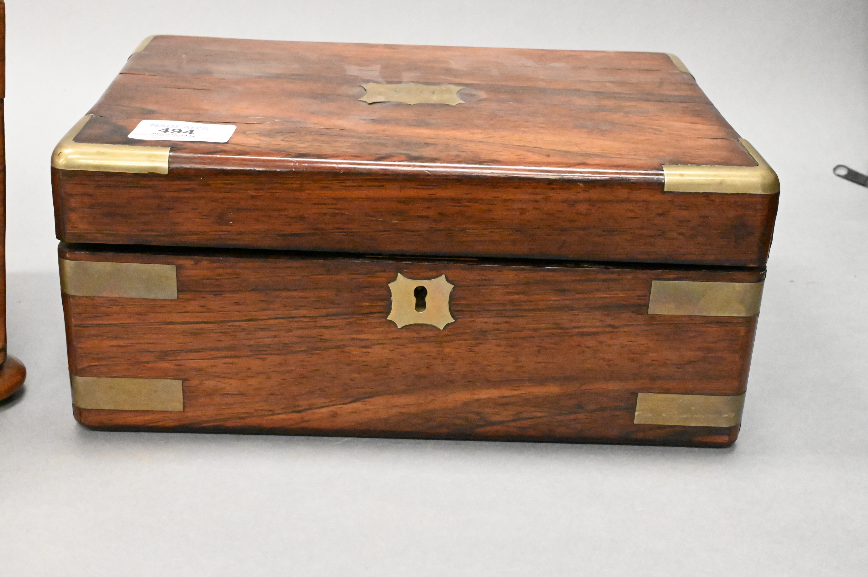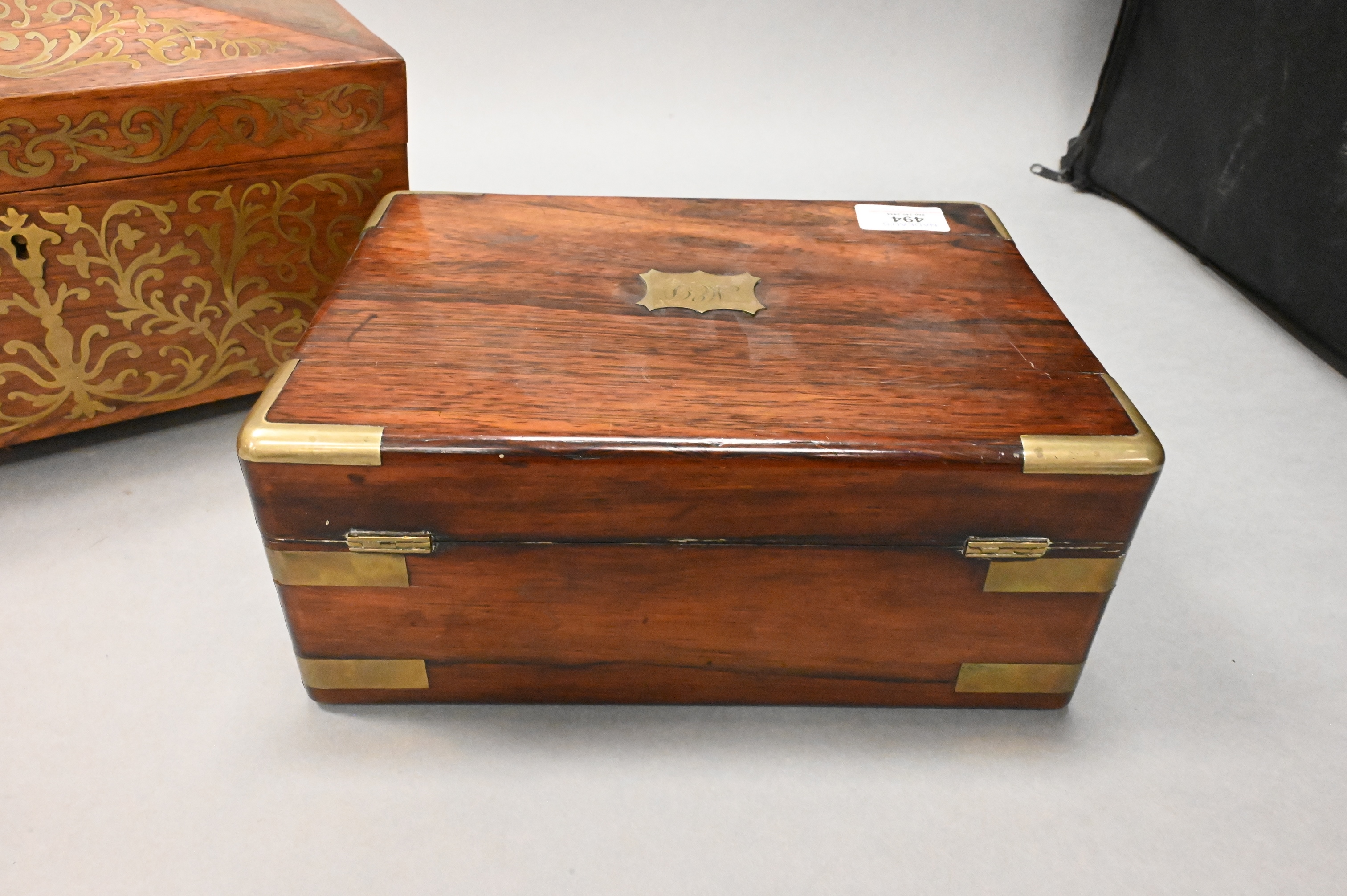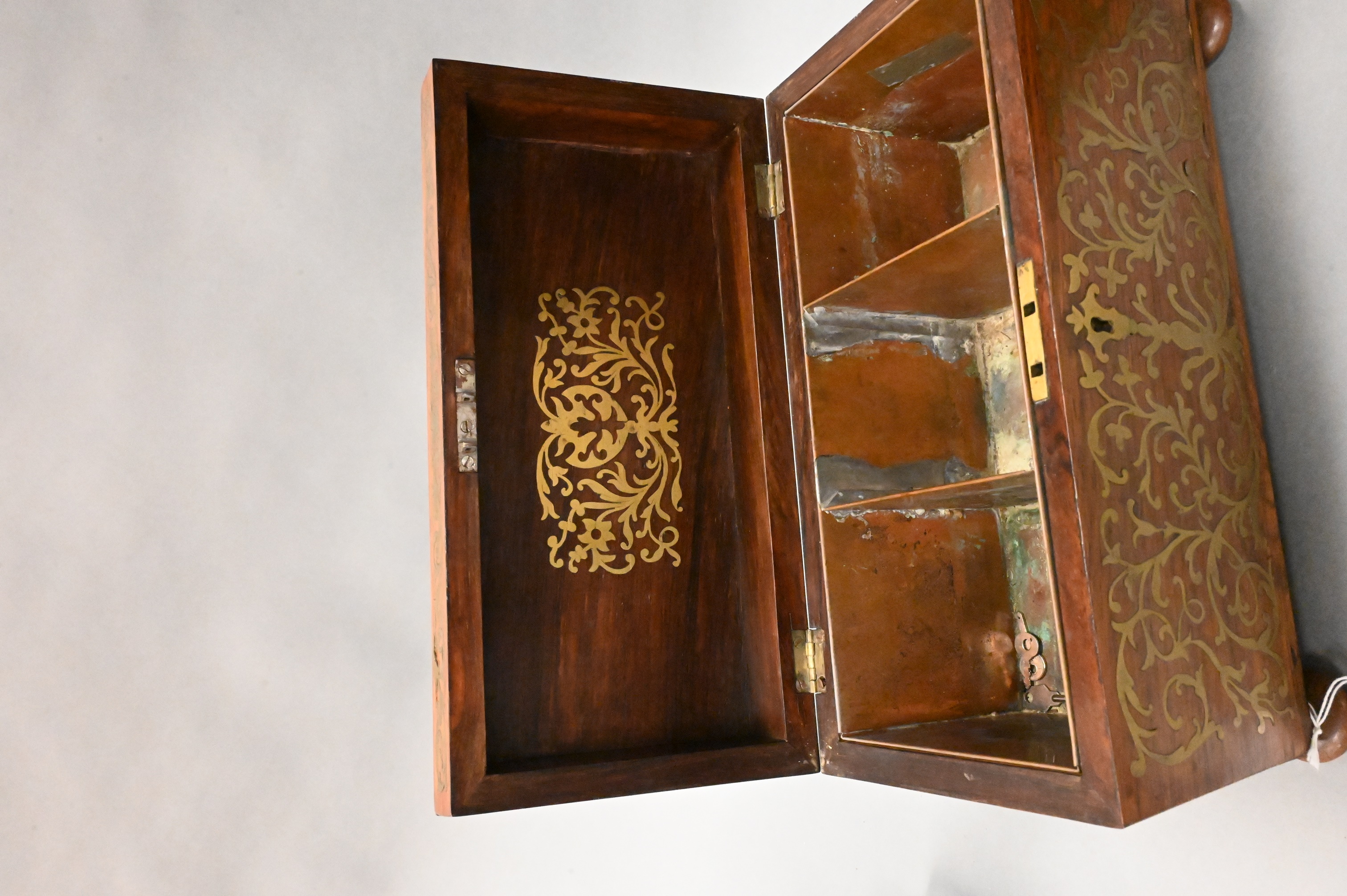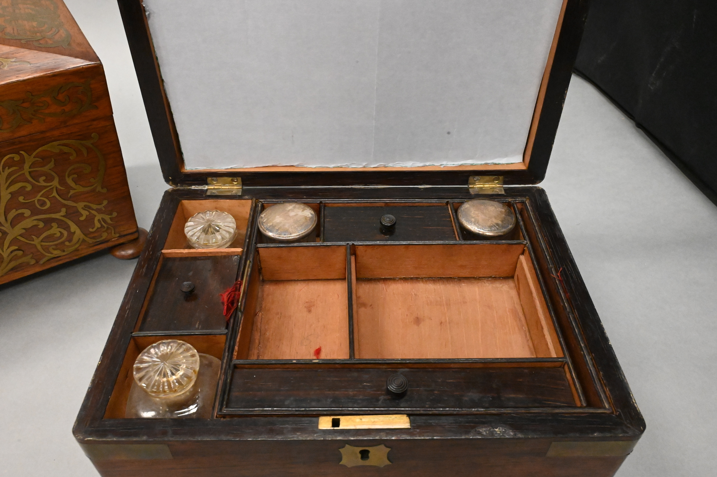 to include one regency rosewood and brass mounted sarcophagus form caddy , one brass mounted caddy opening to fitted compartments and glass jars monogrammed