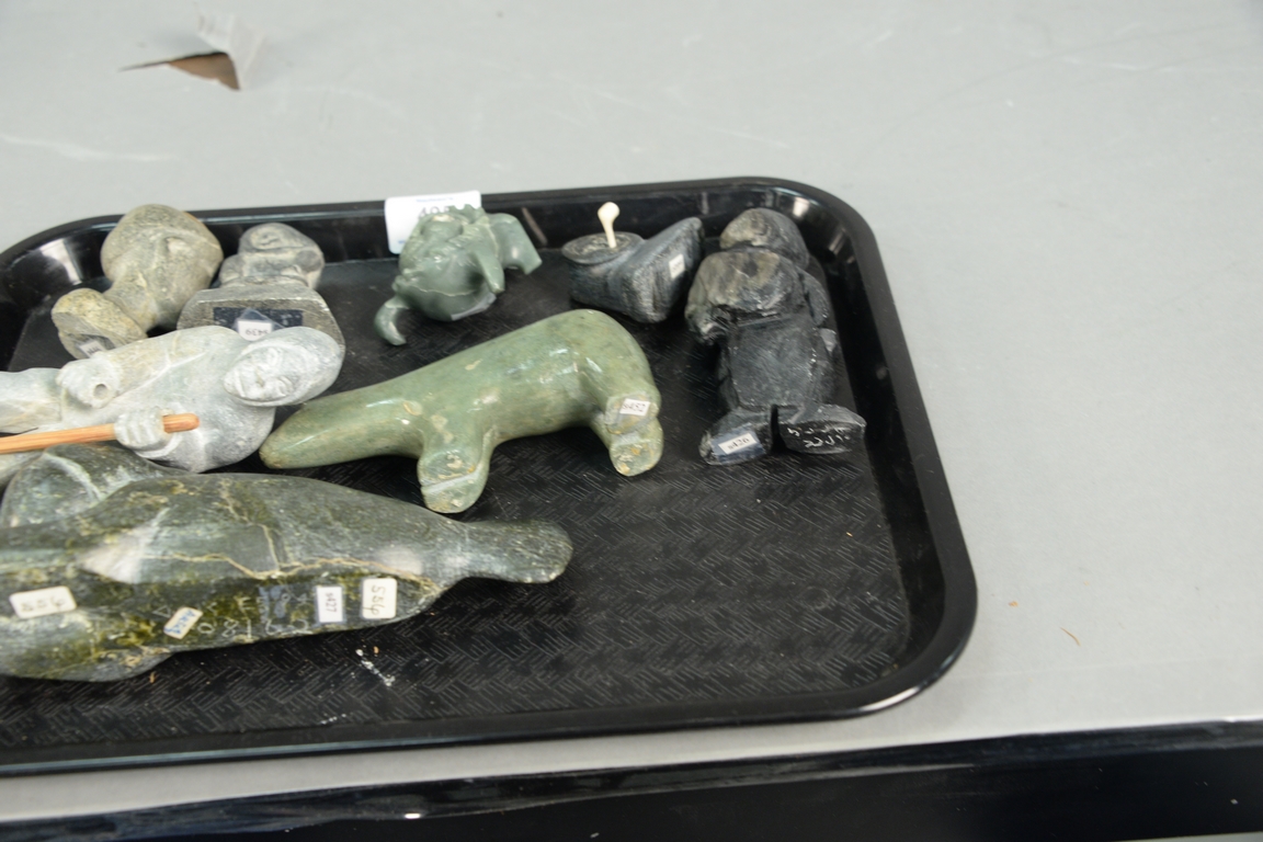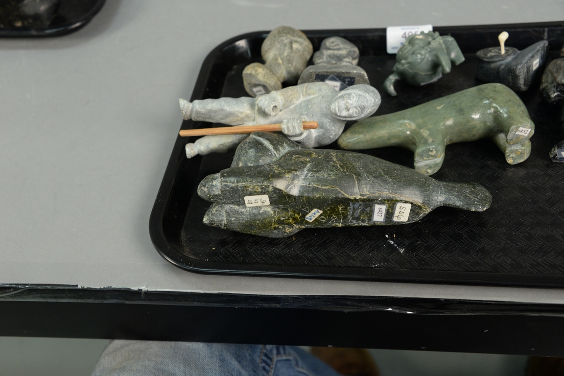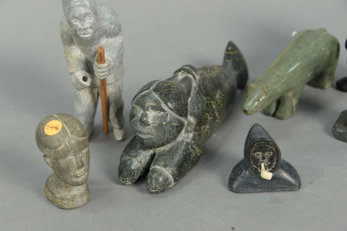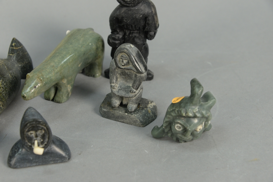 Eight Inuit Eskimo figural carvings to include unknown artist Inuit Woman on base Provenance: Waddington’s Fall Auction 11/5/12, 3 x 2 1/4 x 1, unknown artist Sanikiluaq Belcher Island Bear with Inset Eyes c. 1960, Unknown artist Old Man with Pipe, unknown artist Cambridge Bay Standing Man with Wooden Stick 6 x 2 x 2 1/2, Paul Toolooktook Baker Lake CA Doll’s Head Provenance: Walker’s Spring Auction, Salomonie Pootooguk b. 1913 Kingnait Baker Lake Standing Woman 5 x 2 1/2 x 1 1/2, and Attagootakb Innotik b. 1929 Ikpiarkuk Arctic Bay Sedna Provenance: Waddington’s Auction 2/21/12. ht. 1 3/4in. to 5 1/2in.