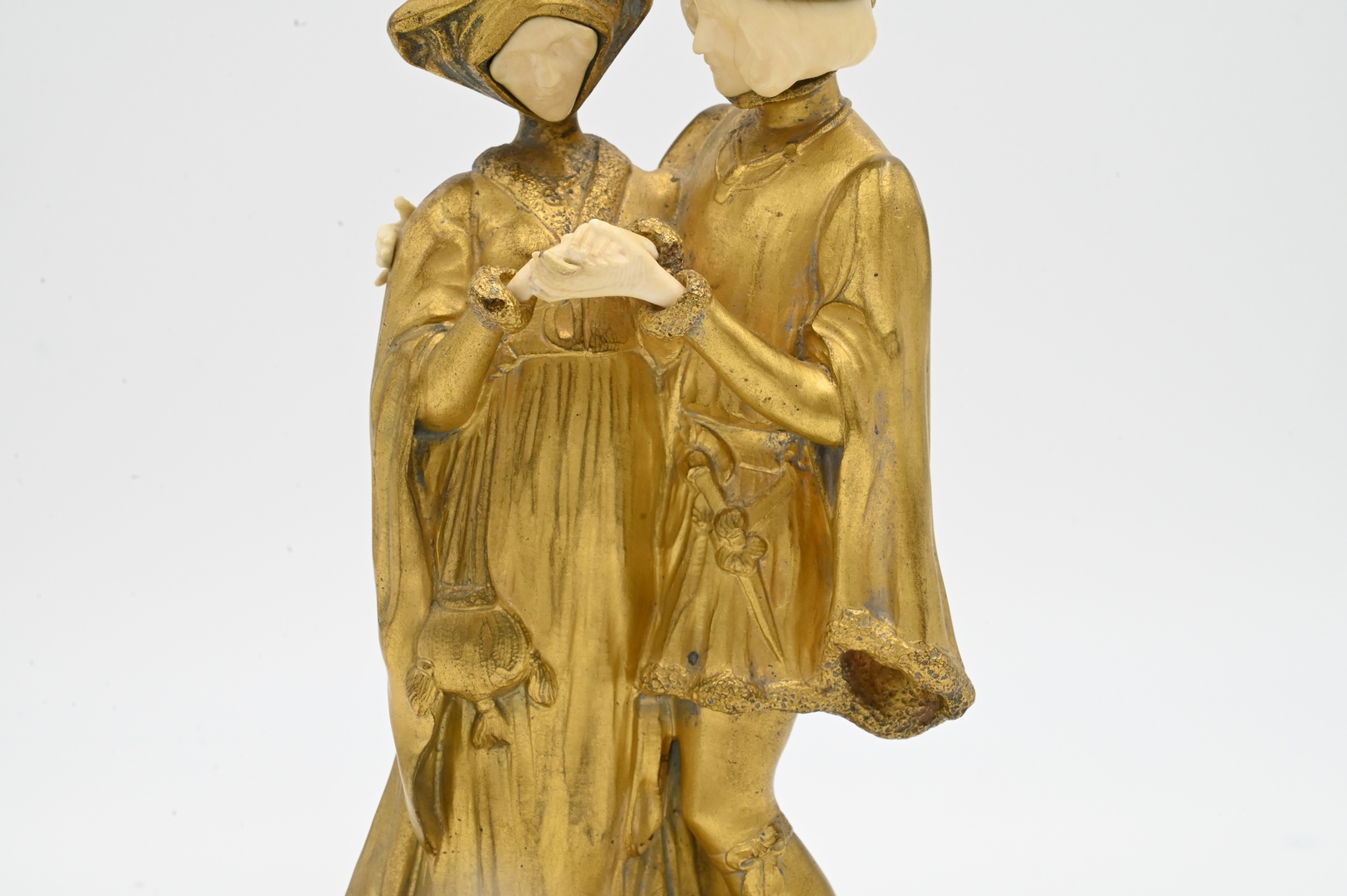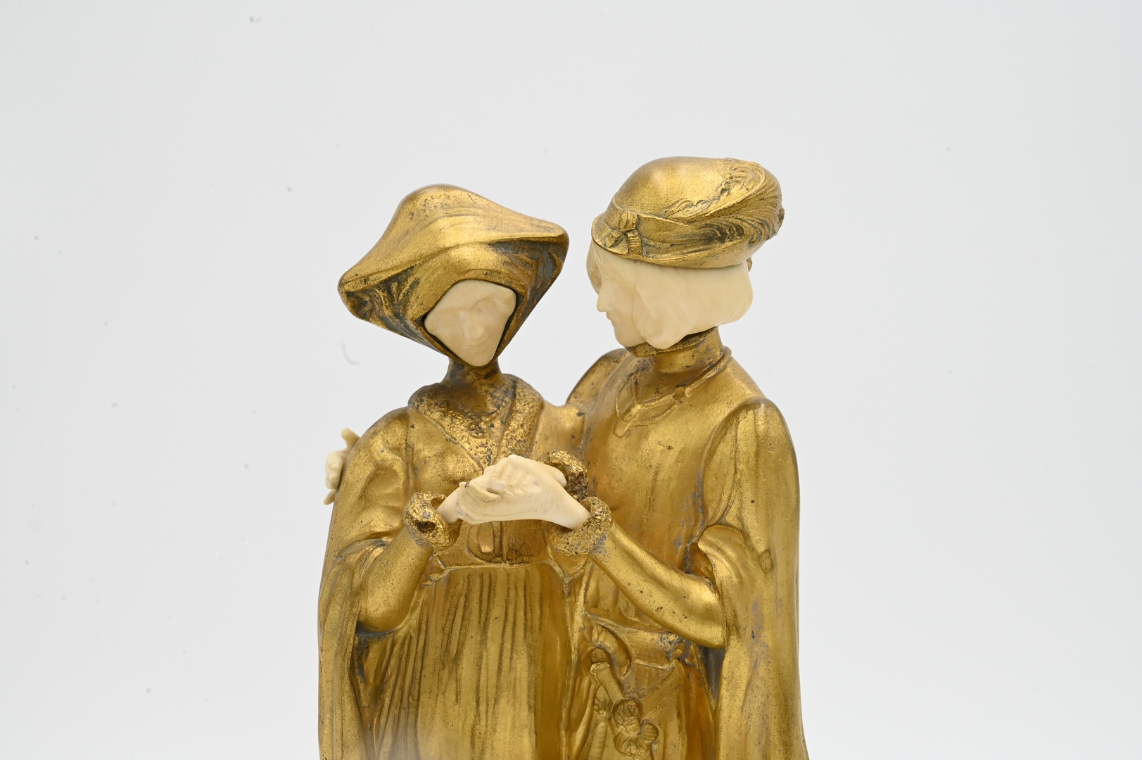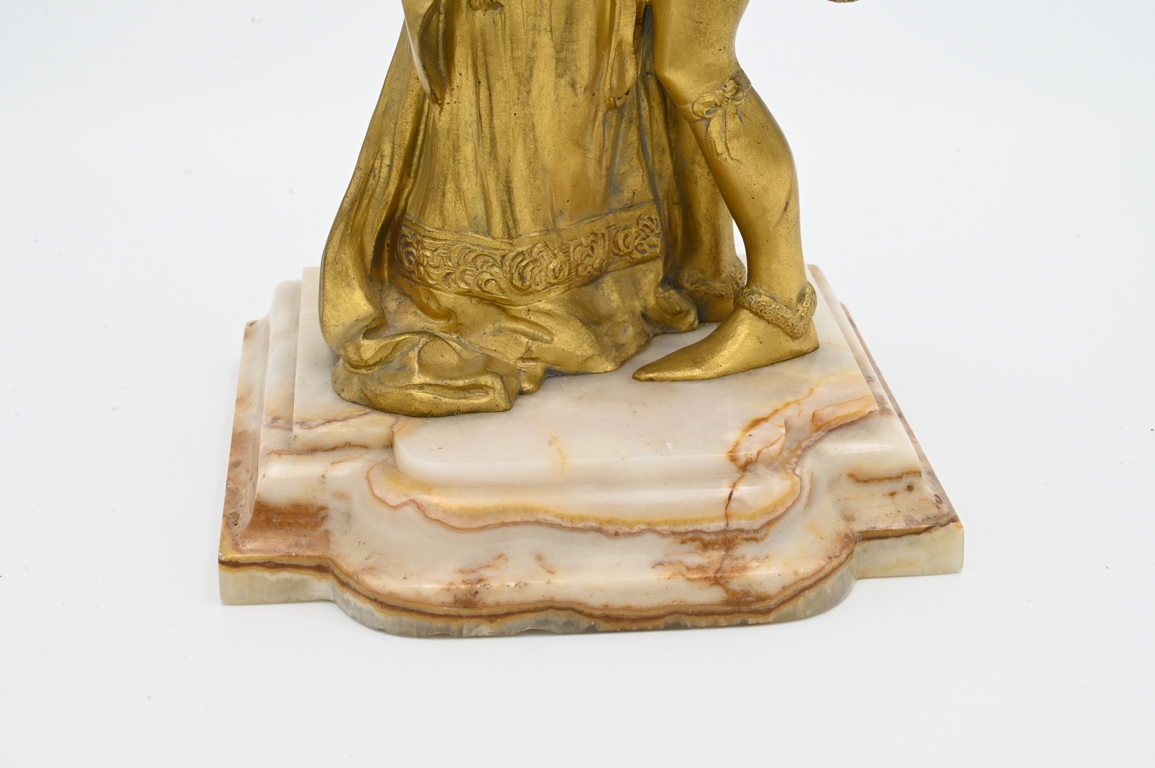 courtly lovers in late medieval costume, gilt bronze on onyx base, signed on back of dress L. Sosson