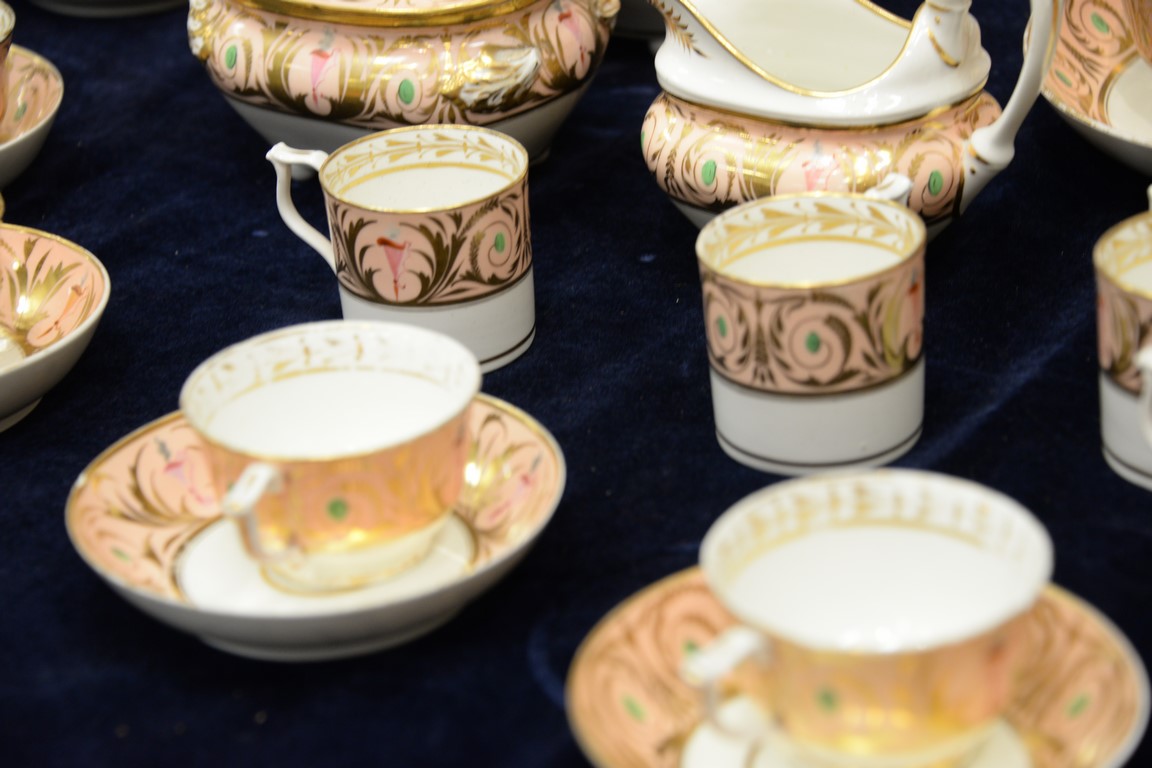 Lot 495: Royal Crown Derby thirty-one piece tea and coffee set to include 7 coffee cups, 8 tea cups, 9 saucers, creamer, sugar, teapot, 4 ser…