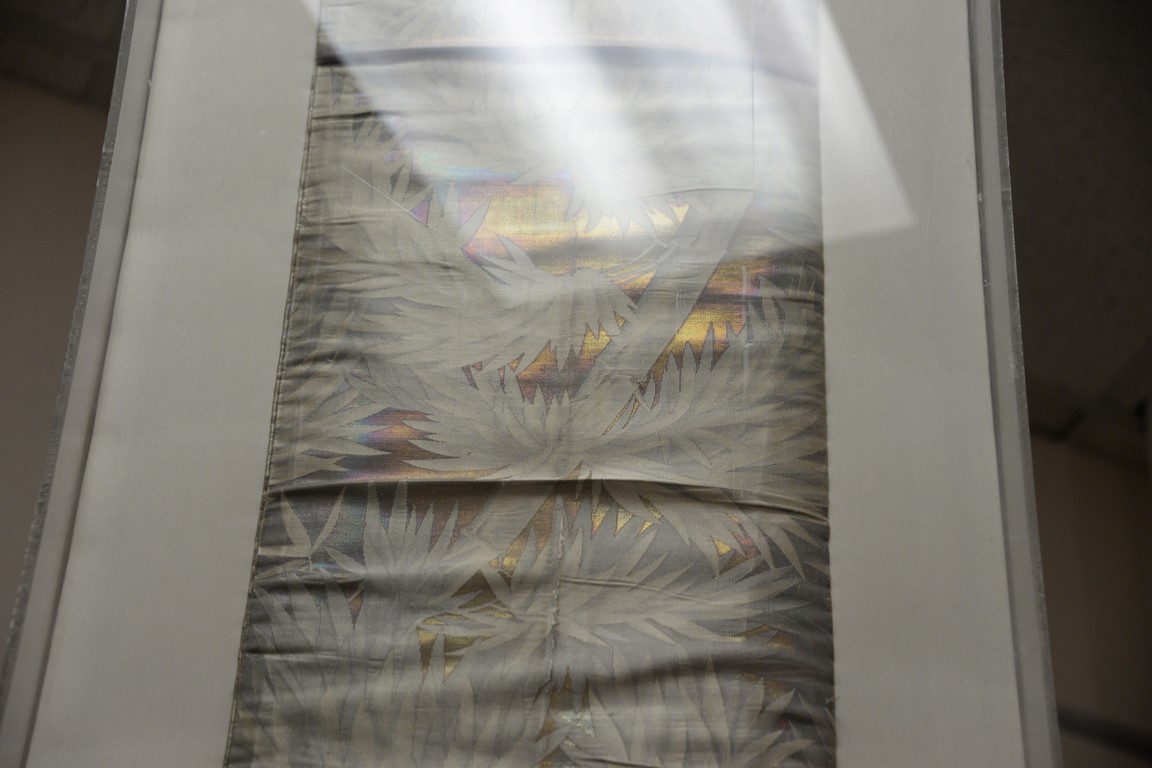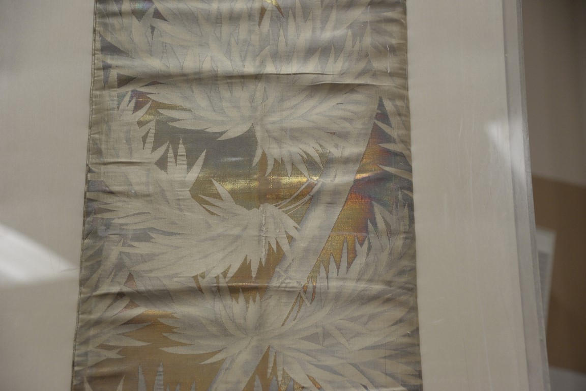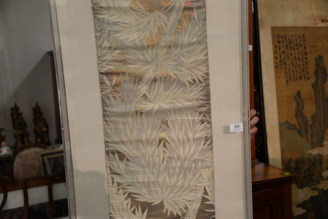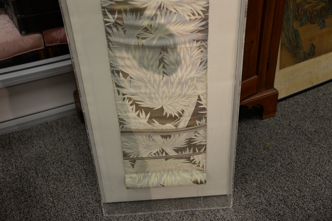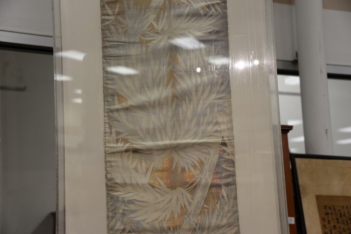 Lot 495: Textile, silk panel mounted on cloth and stretched in plexiglass. textile: 13 x 136 overall: 21 1/2 x 144 Provenance: P…
