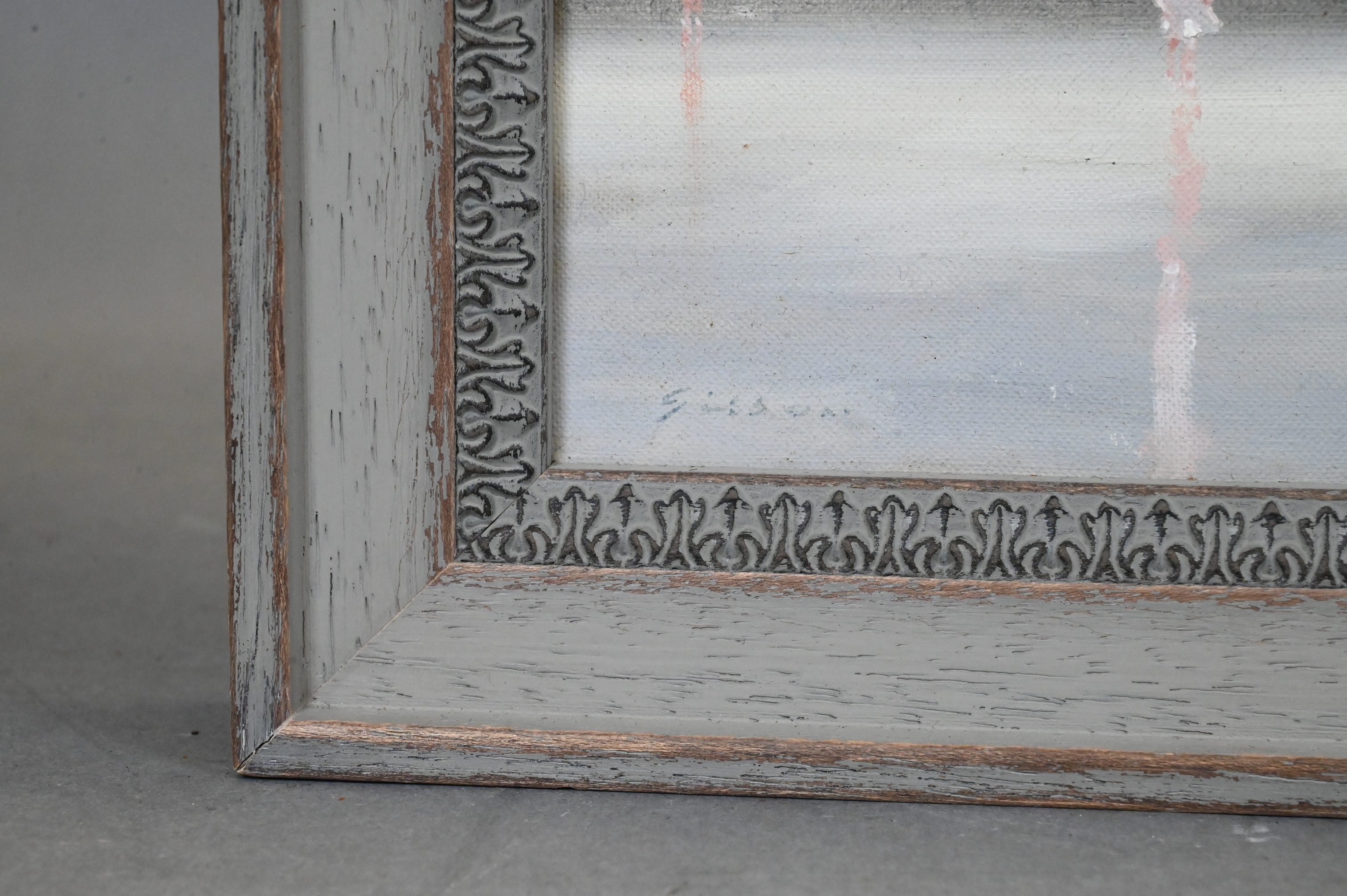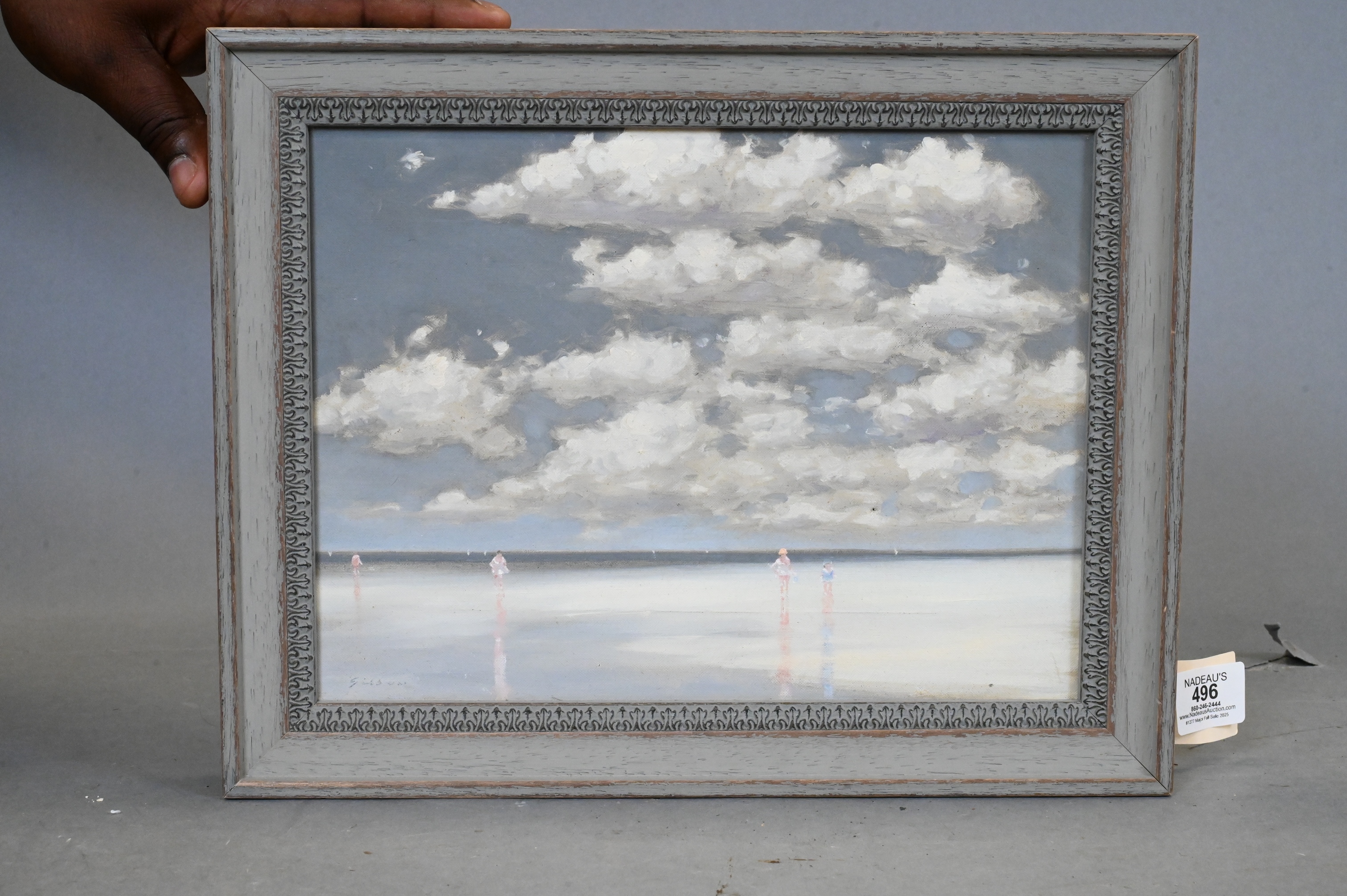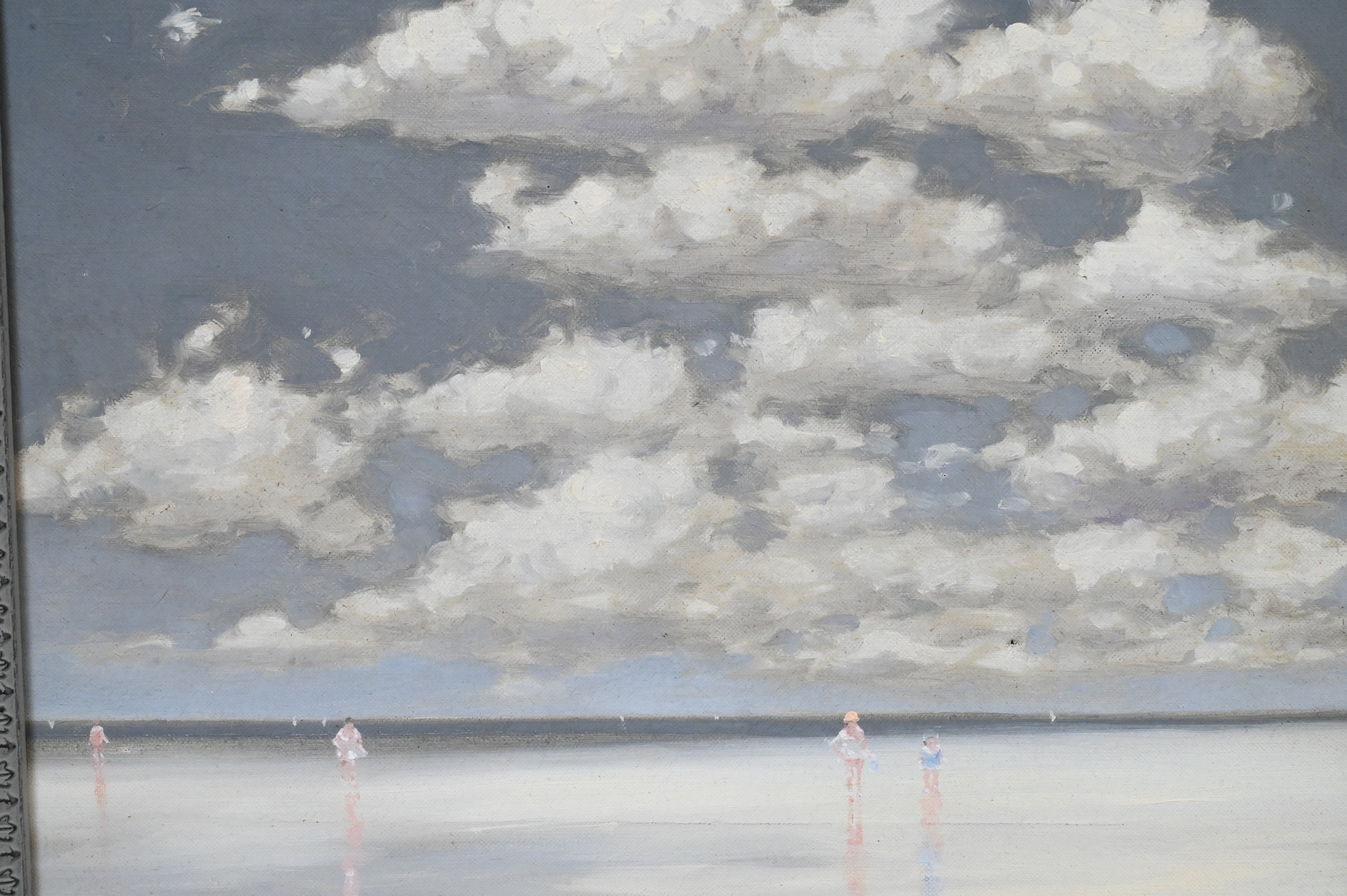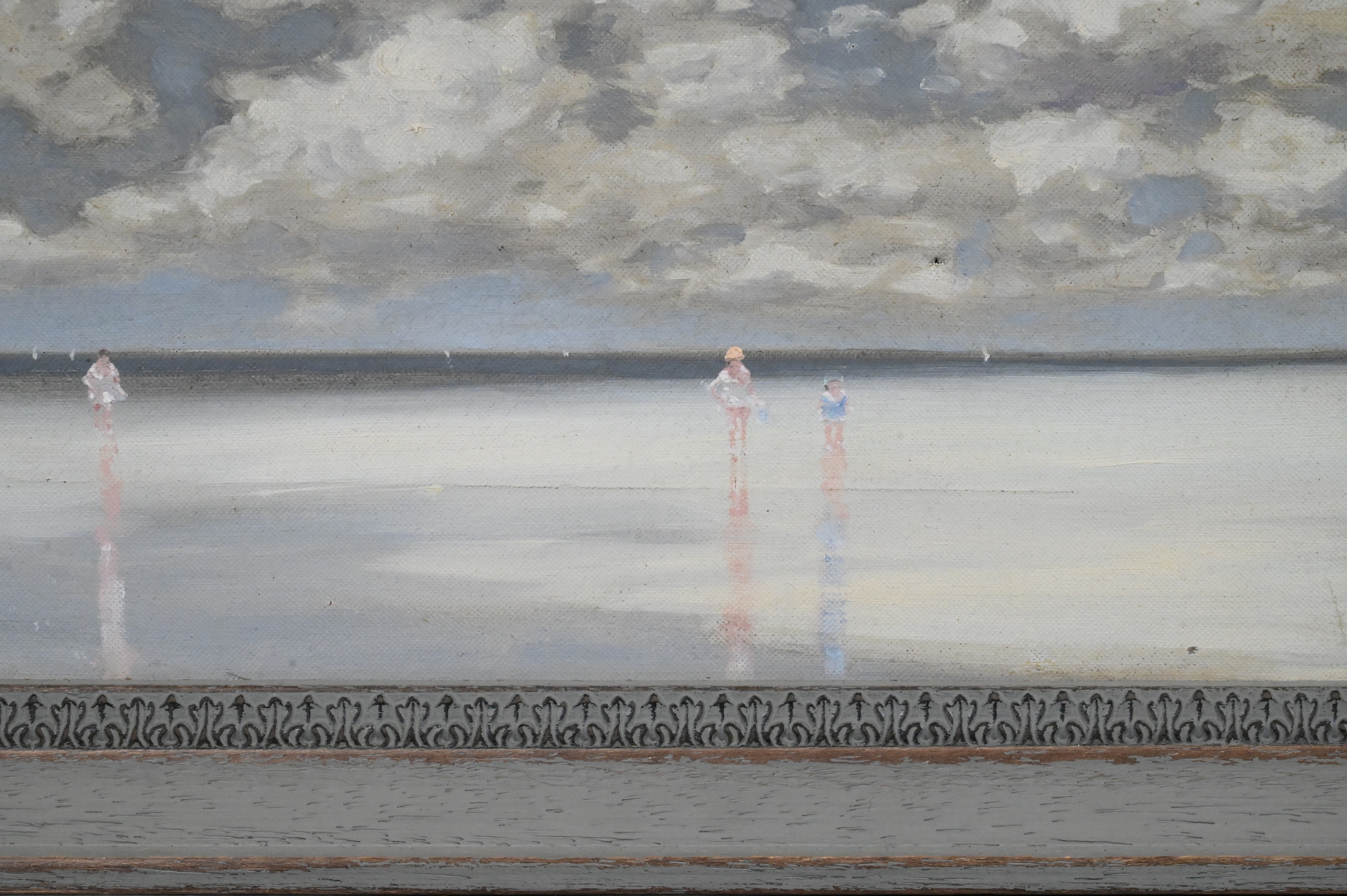 Minimalist beach scene with figures walking along the reflective shoreline, painted in delicate tones of gray, blue, and sand with subtle figures emerging from the expansive seascape.