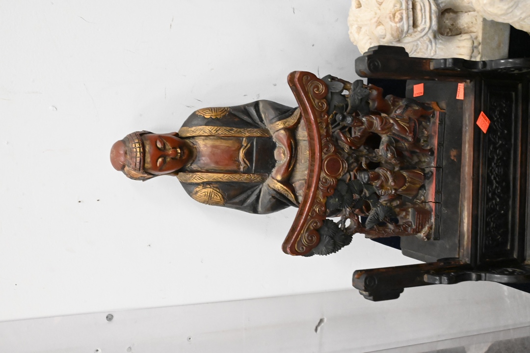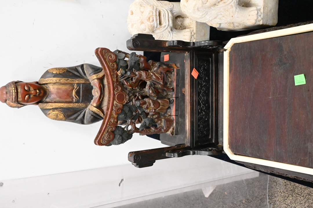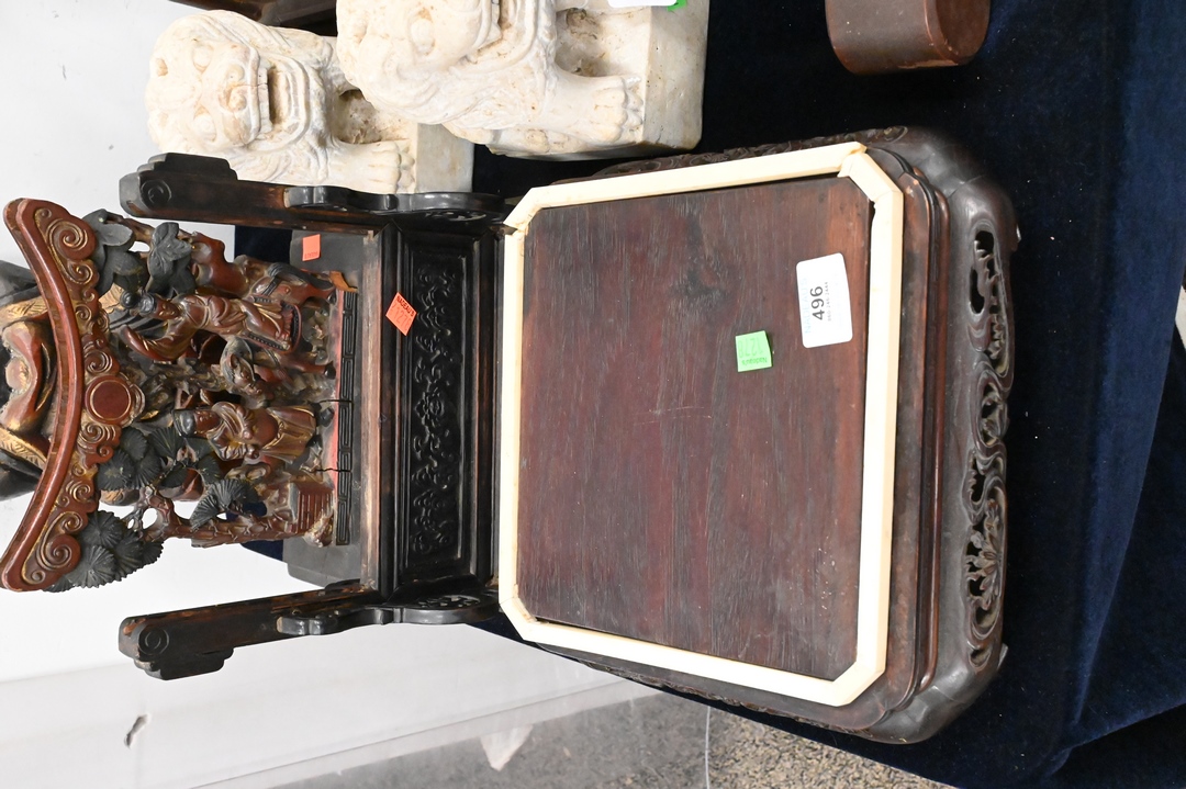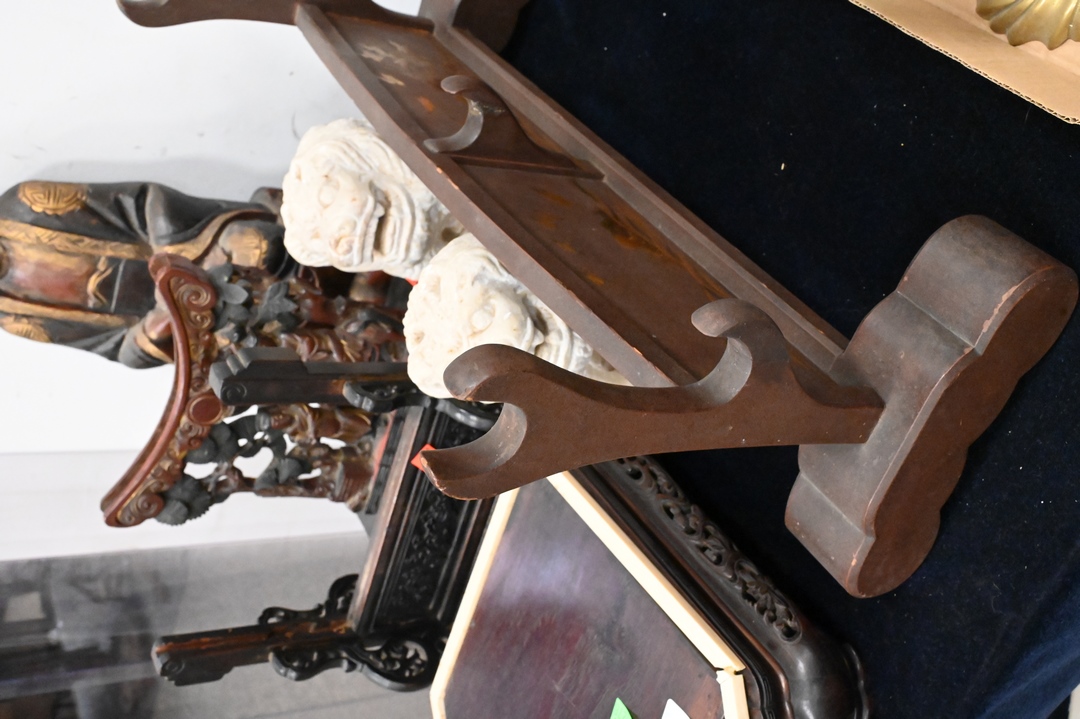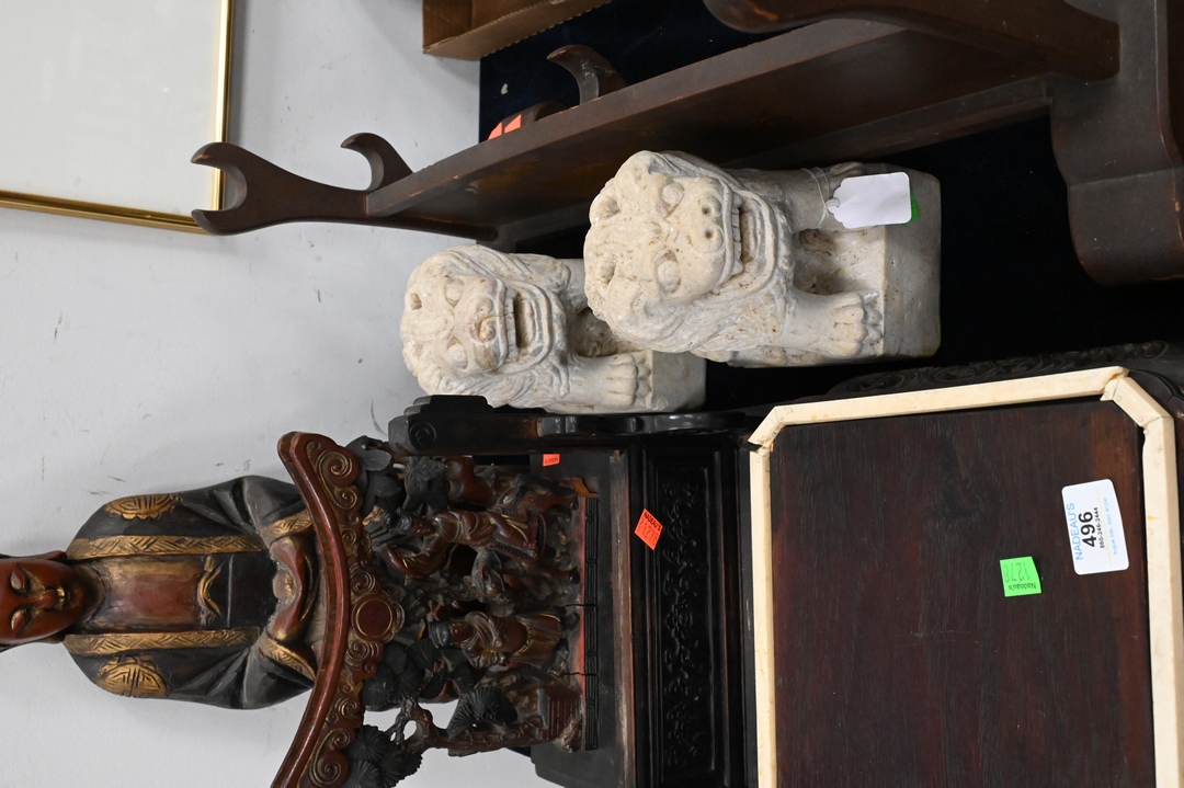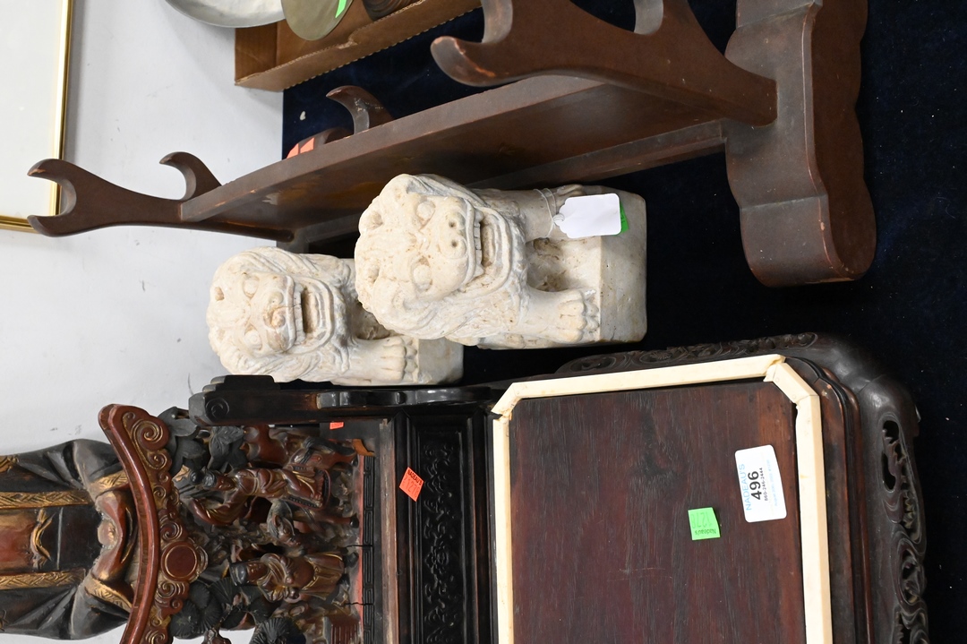Assorted Group of Chinese, to include small marble foo lions, carved seated Buddha figure, along with four carved hardstone stands. Provenance: Estate of Peter Tillou, Litchfield, Connecticut.